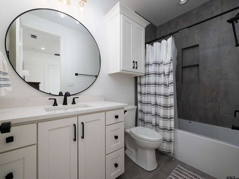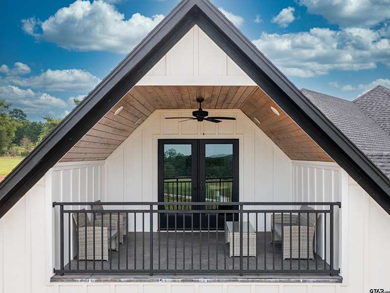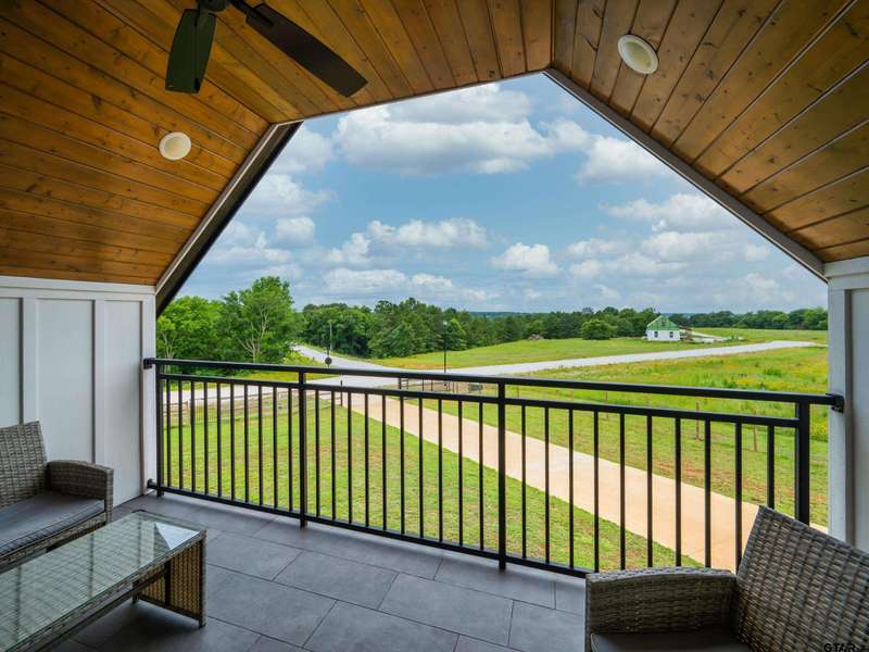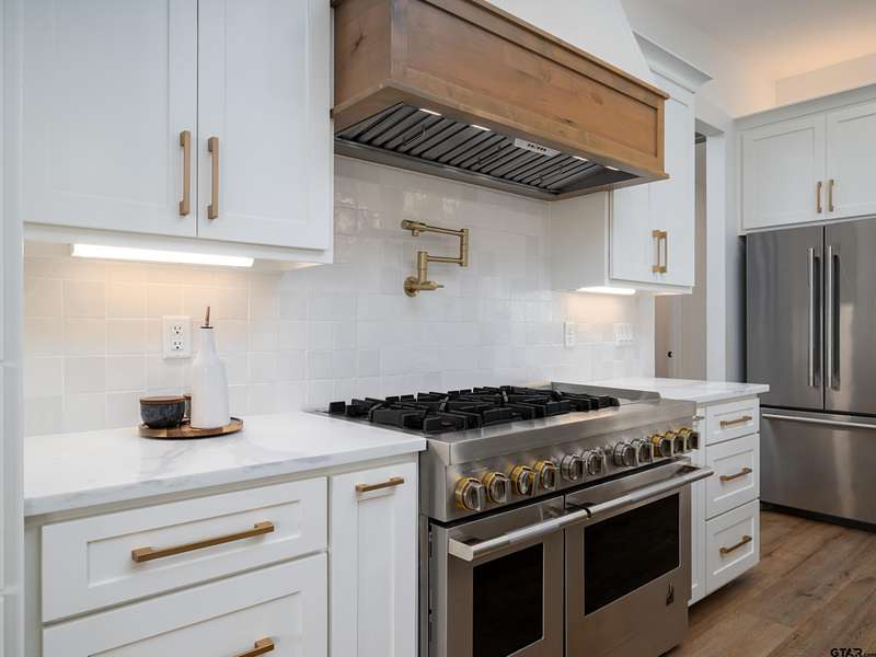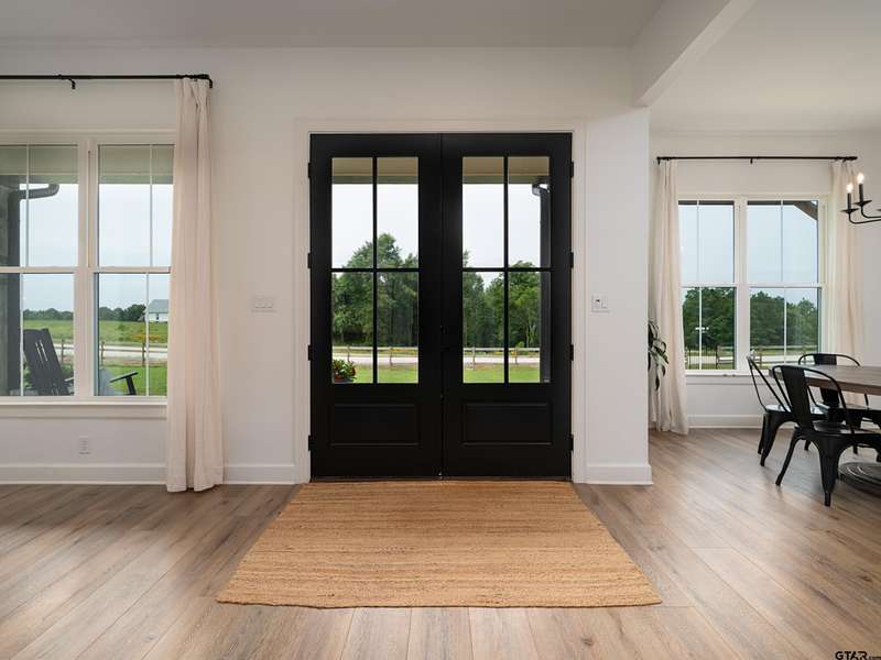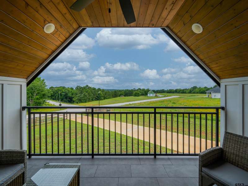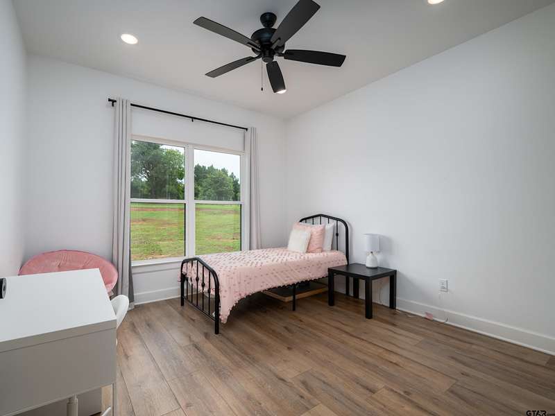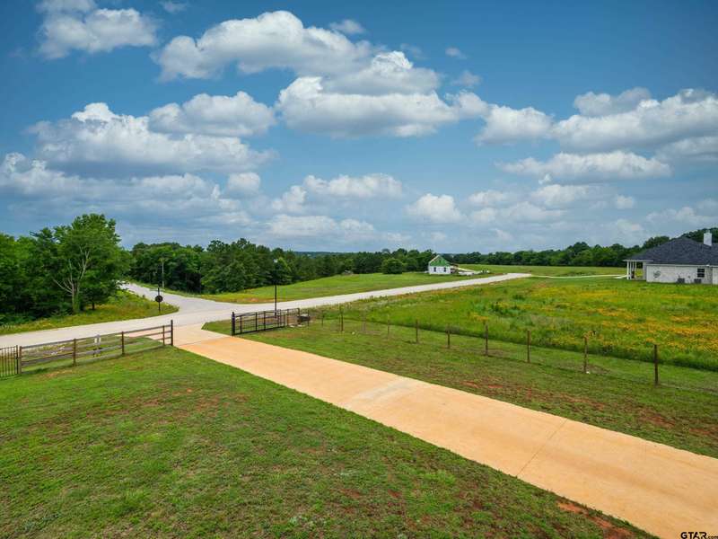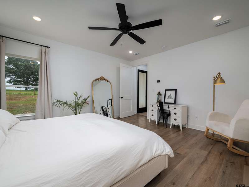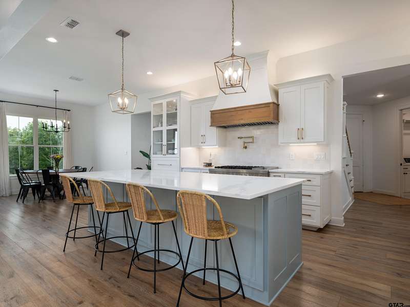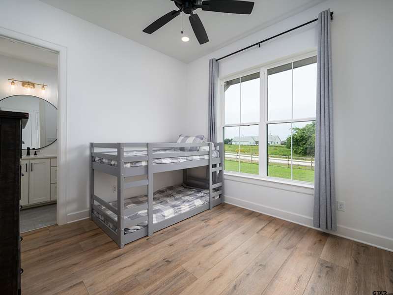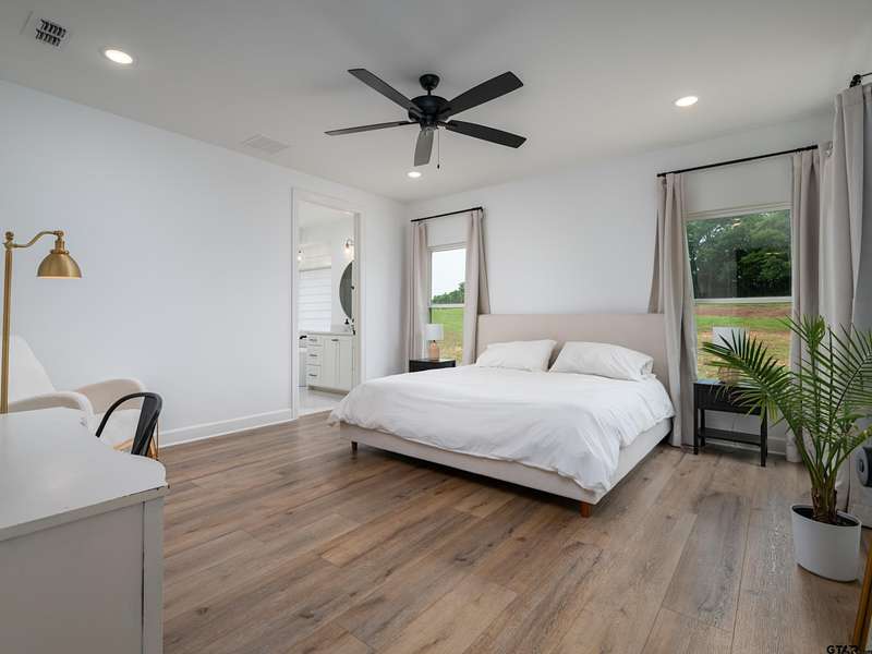 Nestled on 1.681 acres, this stunning Modern Farmhouse-style home offers the serenity of country living with all the perks of a vibrant neighborhood community. Light-filled & beautifully designed, this five bedroom, three-and-a-half-bath home features an open-concept layout that seamlessly blends living, dining & kitchen spaces with a thoughtful split-bedroom design. The spacious living room boasts a vaulted ceiling with a beam accent, a striking floor-to-ceiling stone fireplace with hearth & built-in storage with floating shelves. The chef's kitchen is a showstopper'equipped with a stainless commercial-grade six-burner cooktop with griddle & double ovens, a pot filler, custom range hood, quartz countertops, a farm sink & a large center island with bar seating. A generous walk-in pantry doubles as a functional butler's pantry with appliance-ready storage. The private main suite is a true retreat, featuring an en-suite bath with dual vanities, a freestanding soaking tub, a spacious walk-in shower & a primary closet with direct access to the utility room for added convenience. The utility room includes a sink, excellent storage & hanging space. Additional highlights include: a built-in mudroom with bench seating, drawers, & enclosed storage; two large guest bedrooms with walk-in closets & a shared Jack-and-Jill bath with double sinks; a 4th guest room with its own private en-suite bath; a versatile 5th bedroom that doubles perfectly as an office; & an upstairs bonus room/game room with a scenic sunset balcony. Step outside to enjoy the expansive yard'ideal for gardening, raising chickens, or simply relaxing under the large covered patio. Other upgrades include premium LVP flooring throughout (no carpet), a stylish powder bath, a fully fenced property, high-end finishes & an oversized 2 car garage. Close to UT Health North Campus & minutes from Tyler, this neighborhood offers a home school co-op that meets on-site and a community where nature & neighbors come together!