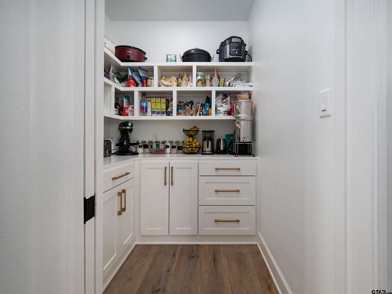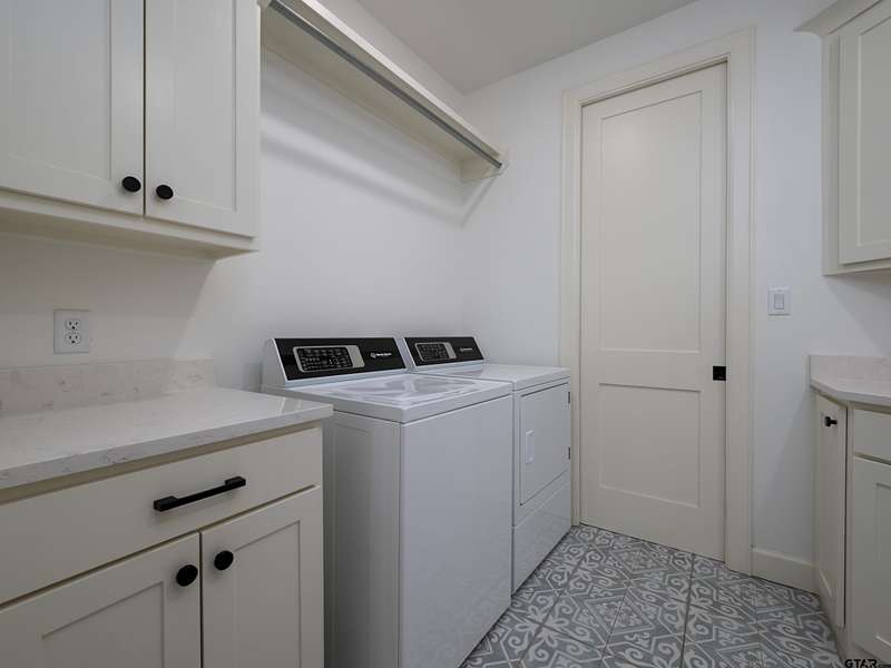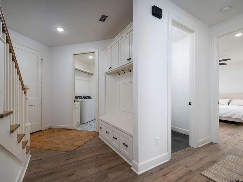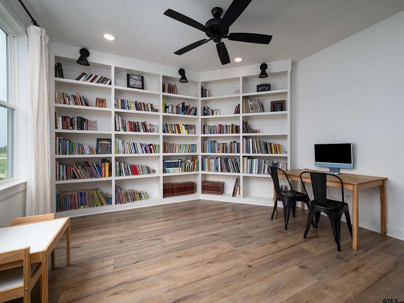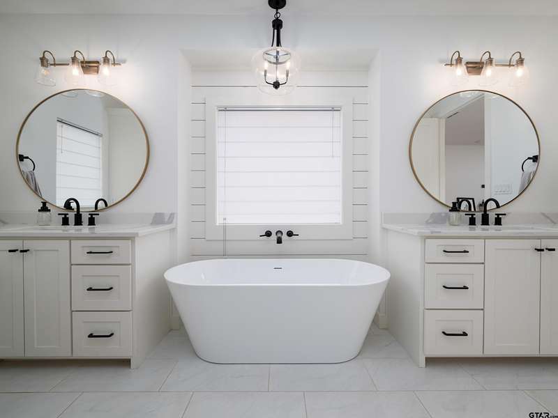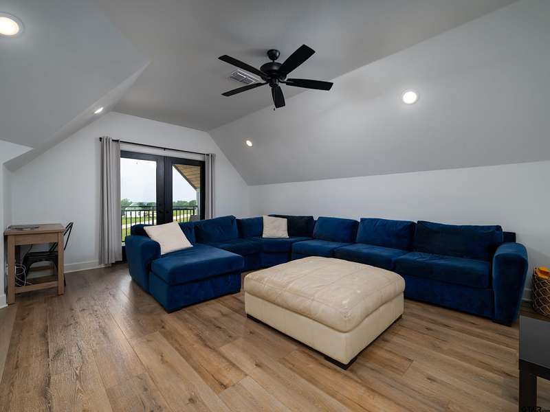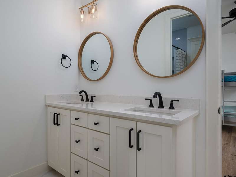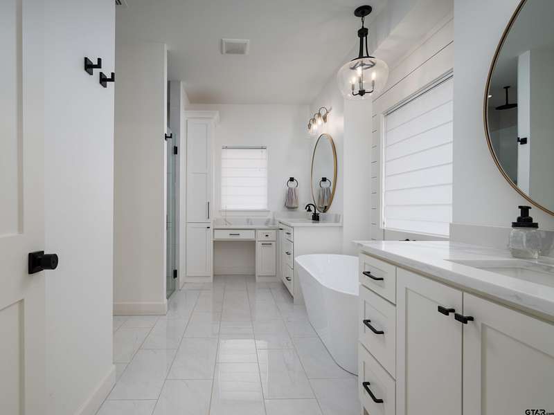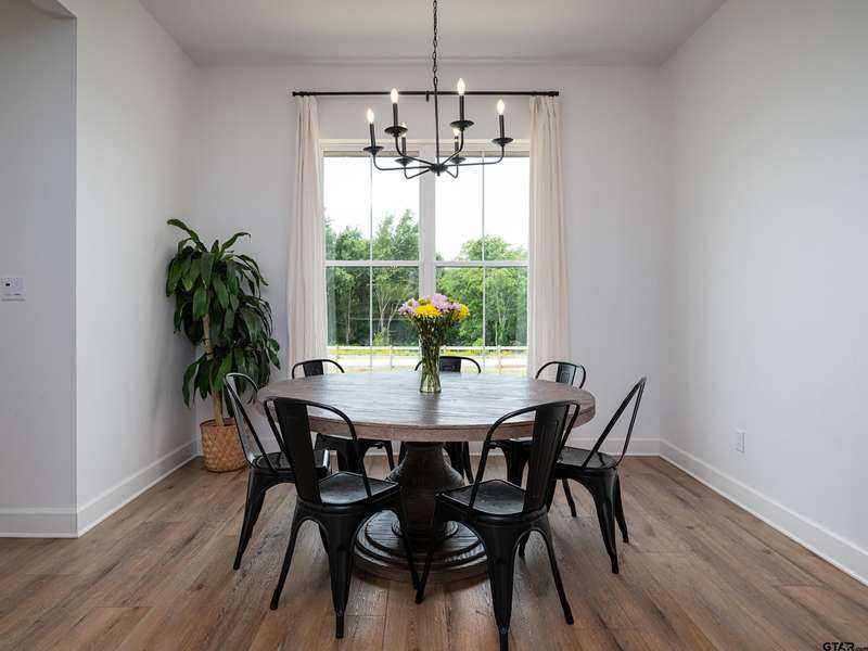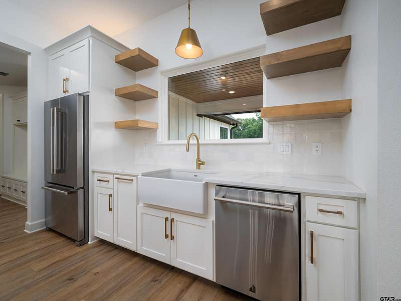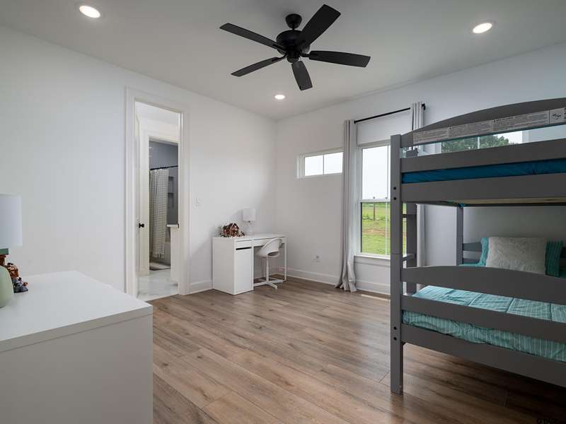 Nestled on 1.681 acres, this stunning Modern Farmhouse-style home offers the serenity of country living with all the perks of a vibrant neighborhood community. Light-filled & beautifully designed, this five bedroom, three-and-a-half-bath home features an open-concept layout that seamlessly blends living, dining & kitchen spaces with a thoughtful split-bedroom design. The spacious living room boasts a vaulted ceiling with a beam accent, a striking floor-to-ceiling stone fireplace with hearth & built-in storage with floating shelves. The chef's kitchen is a showstopper'equipped with a stainless commercial-grade six-burner cooktop with griddle & double ovens, a pot filler, custom range hood, quartz countertops, a farm sink & a large center island with bar seating. A generous walk-in pantry doubles as a functional butler's pantry with appliance-ready storage. The private main suite is a true retreat, featuring an en-suite bath with dual vanities, a freestanding soaking tub, a spacious walk-in shower & a primary closet with direct access to the utility room for added convenience. The utility room includes a sink, excellent storage & hanging space. Additional highlights include: a built-in mudroom with bench seating, drawers, & enclosed storage; two large guest bedrooms with walk-in closets & a shared Jack-and-Jill bath with double sinks; a 4th guest room with its own private en-suite bath; a versatile 5th bedroom that doubles perfectly as an office; & an upstairs bonus room/game room with a scenic sunset balcony. Step outside to enjoy the expansive yard'ideal for gardening, raising chickens, or simply relaxing under the large covered patio. Other upgrades include premium LVP flooring throughout (no carpet), a stylish powder bath, a fully fenced property, high-end finishes & an oversized 2 car garage. Close to UT Health North Campus & minutes from Tyler, this neighborhood offers a home school co-op that meets on-site and a community where nature & neighbors come together!