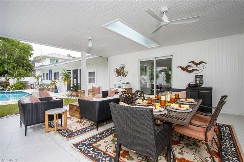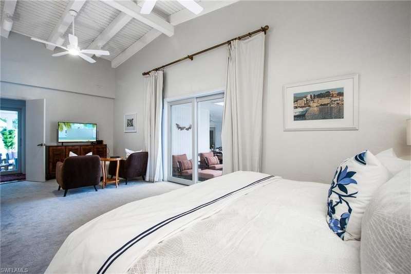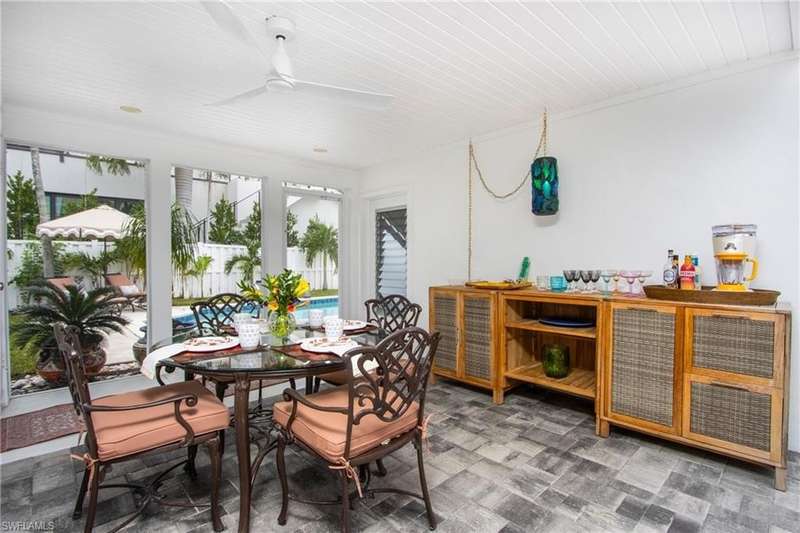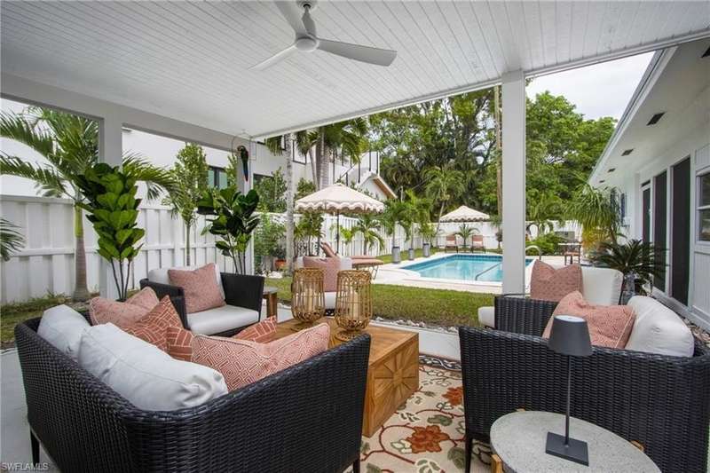 BOOKED Jan.-March 2025: This charming Old Naples house has a perfect combination of great location, serene outdoor spaces, and a spacious, updated interior. The house is 2.5 blocks to the beach, a short bike ride to 5th Ave. S., as a well as the local grocery so leaving the car in the three - car garage is optional. Magnificent outdoor spaces make this home a private oasis. Spend the day by the open- air, resort style pool with lounge chairs, umbrellas, and the sound of palm fronds rustling in the wind. For reading, relaxing, or entertaining friends and family, this property boasts both a lanai and a courtyard. The lanai has a large dining area and sitting area. The courtyard is a unique walled and screened space that provides privacy and another area for entertaining. It combines indoor comforts with fresh air and sunshine or evening stars. The interior has been updated with upscale furnishings throughout an open floor plan. The kitchen was recently renovated with all new white shaker cabinets with quartz countertops in the heart of the home. This three- bedroom, three bath home has a large master suite with cozy seating area walk in closet and large bath with soaking tub and walk in shower.