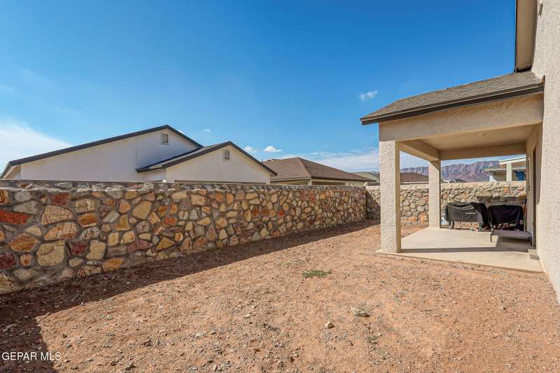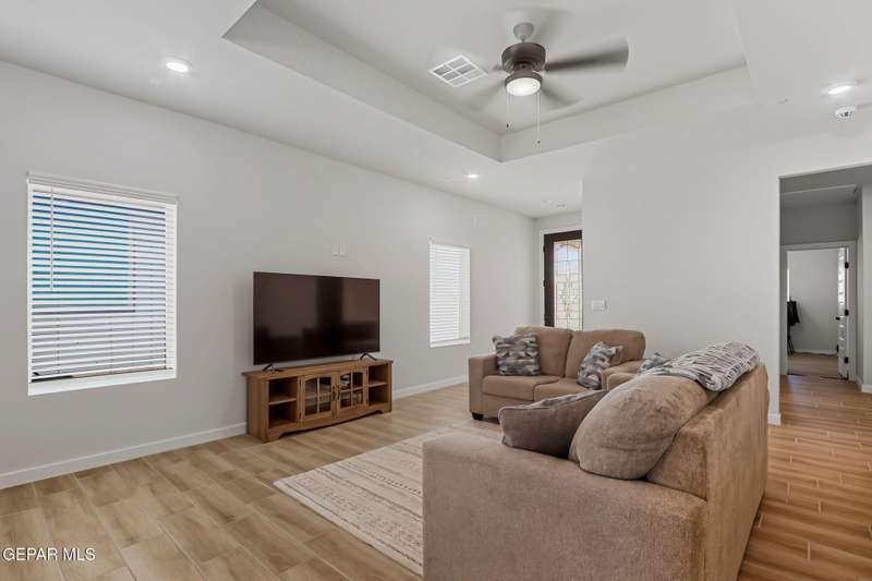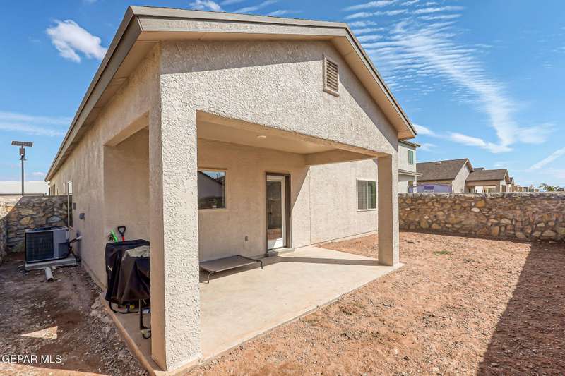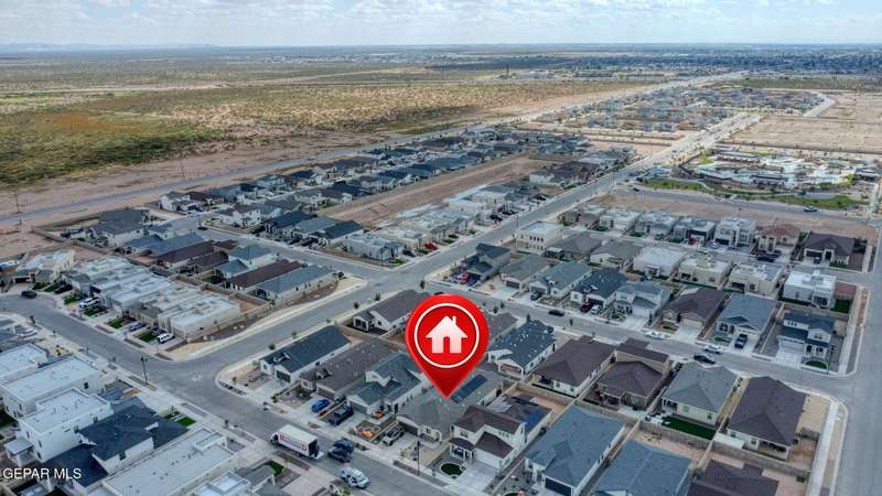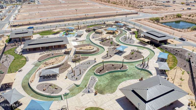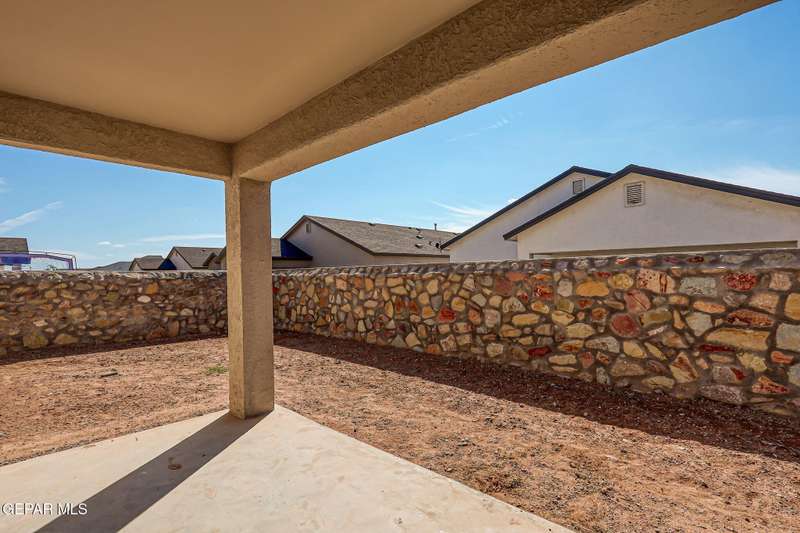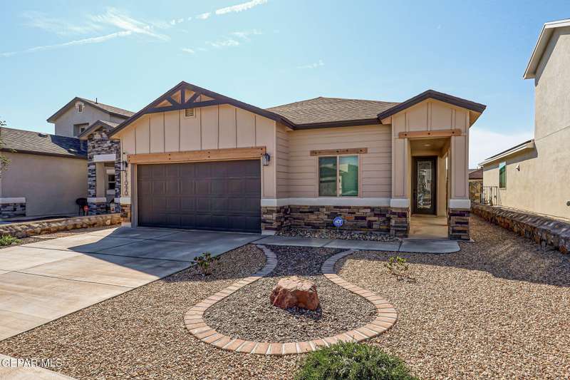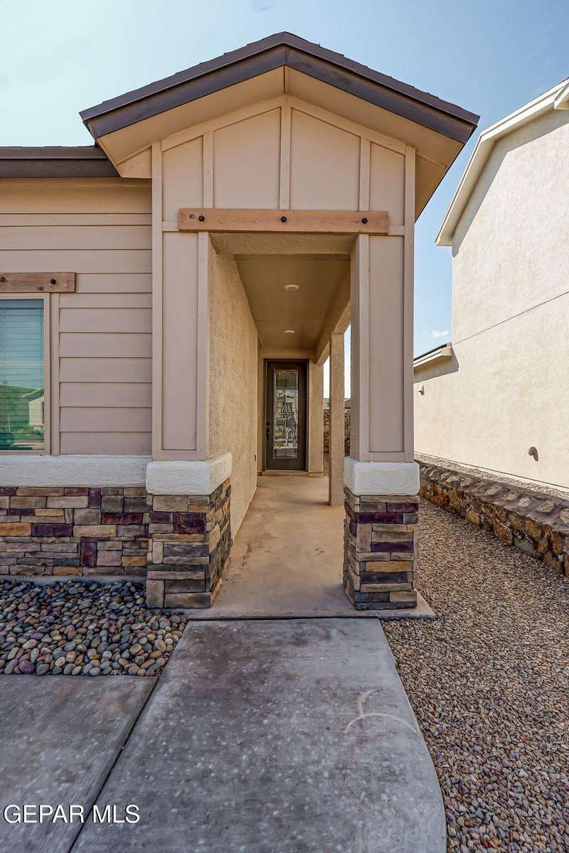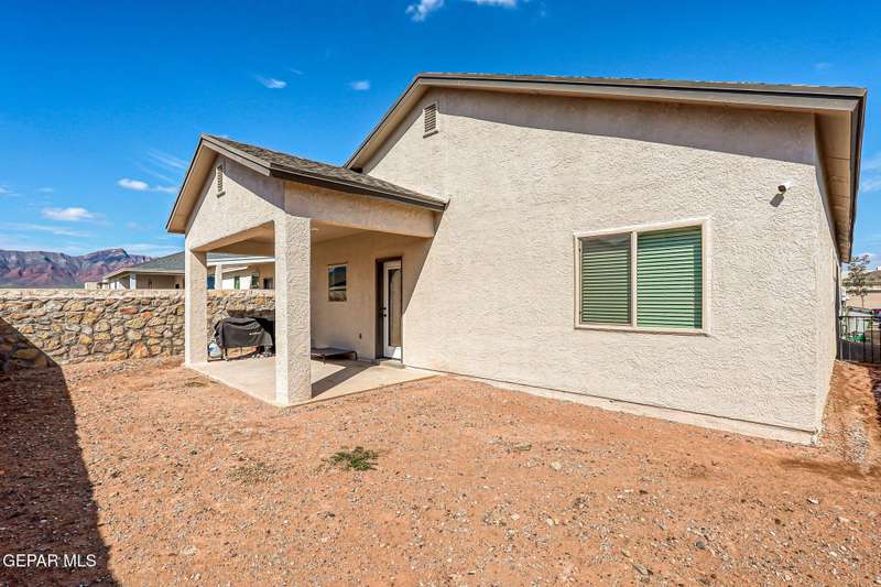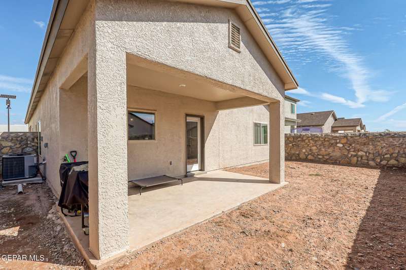 Beautiful single-story home featuring an open-concept design with high ceilings and spacious living areas. The large family/living room flows seamlessly into the kitchen and dining areas-perfect for entertaining. The kitchen offers a center island, granite countertops, stylish tile backsplash, stainless steel appliances, pantry, and cabinets with crown molding. This home includes four inviting bedrooms and two full baths. The primary suite boasts a generous walk-in closet and a luxurious bathroom. Leased solar panels help keep electric costs low year-round. Located in the desirable Campo Del Sol community, residents enjoy resort-style amenities including a lazy river, pool, parks, and scenic walking trails. With a low annual HOA and convenient proximity to schools, shopping, and Fort Bliss, this home combines comfort, value, and lifestyle in one exceptional package.