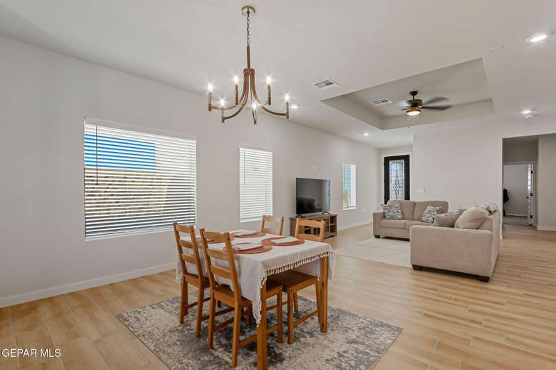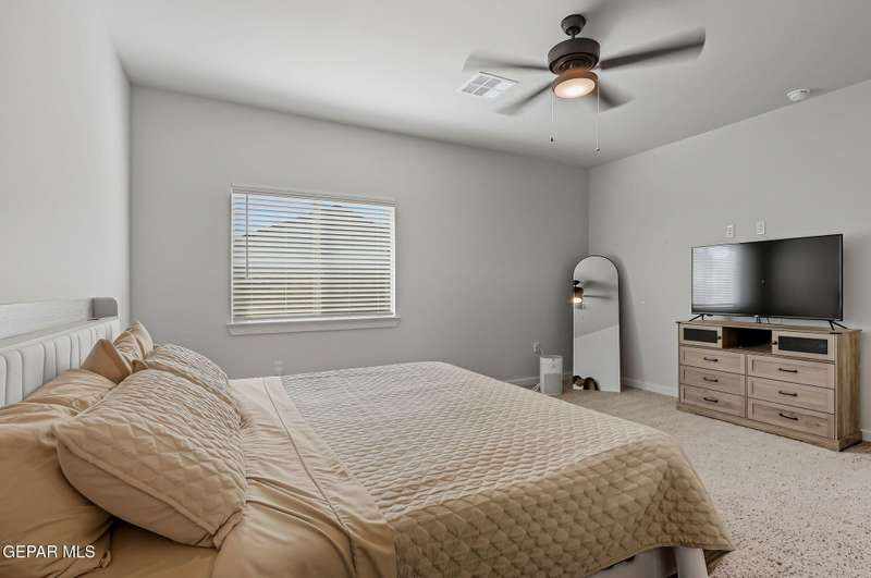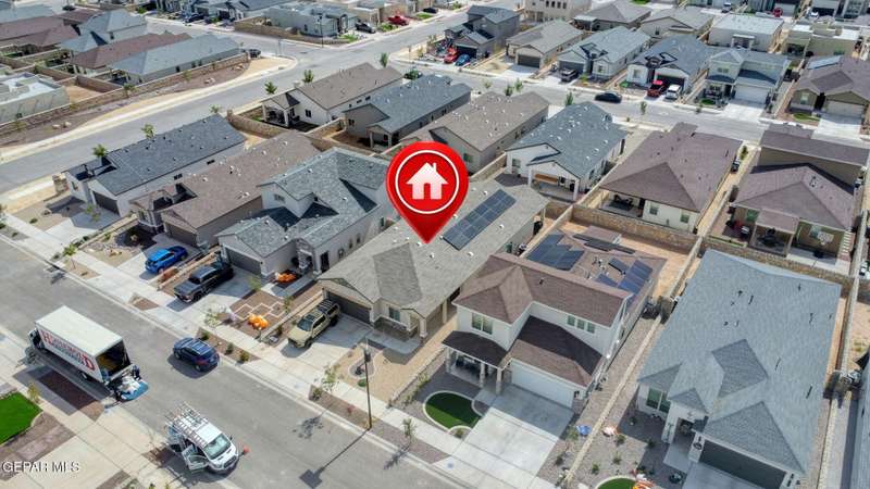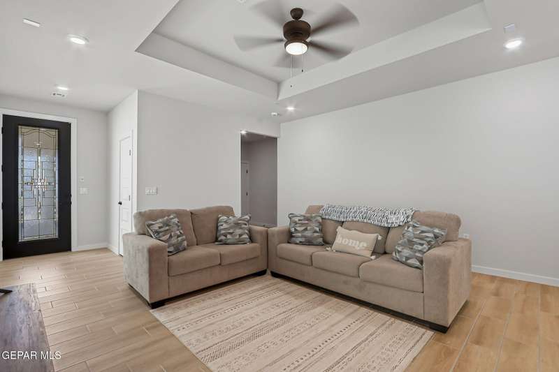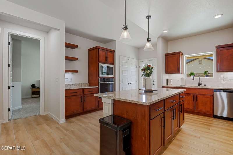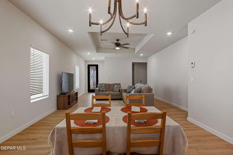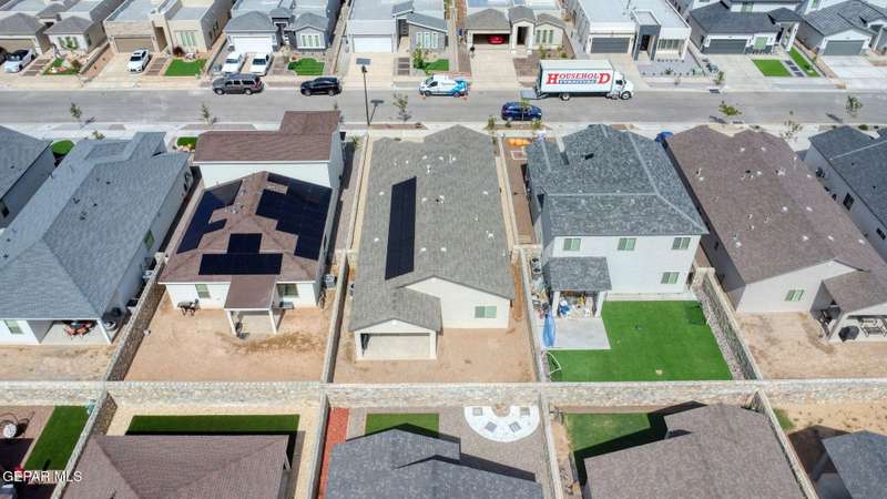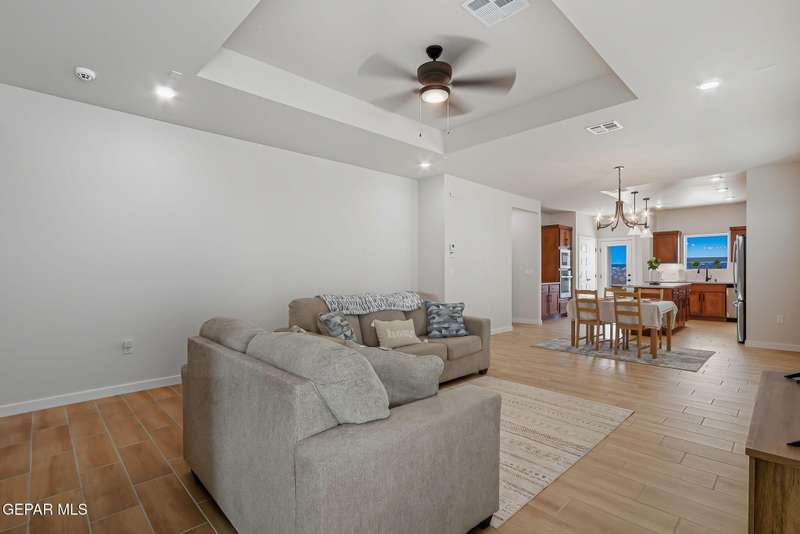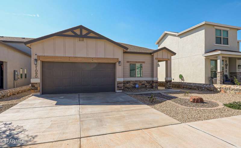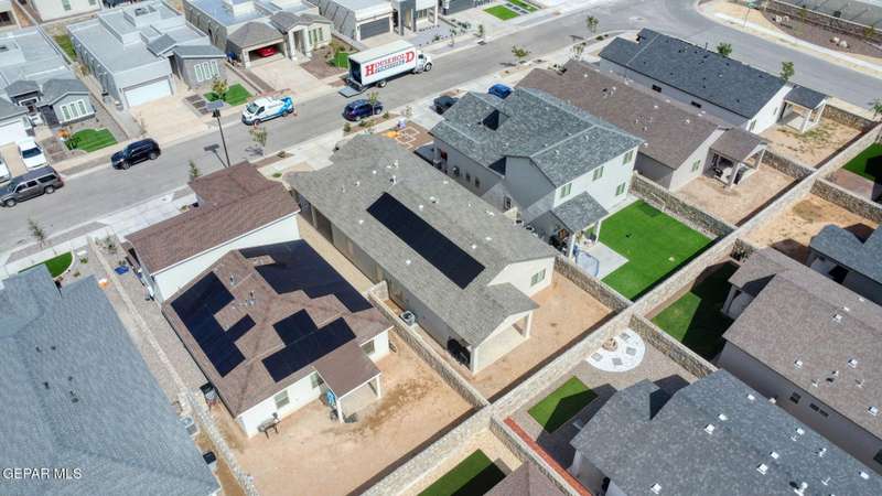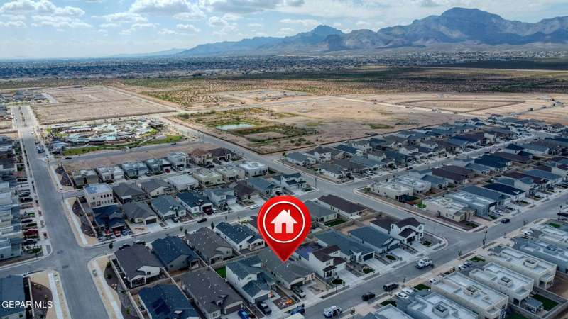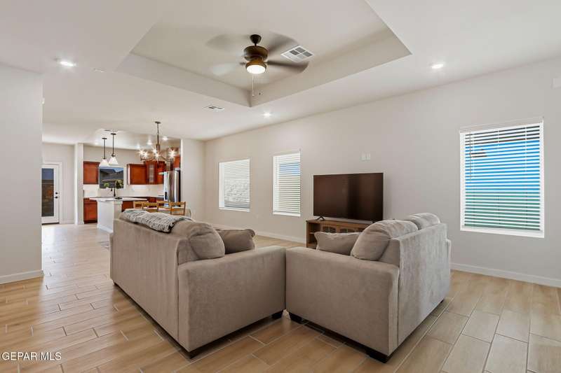 Beautiful single-story home featuring an open-concept design with high ceilings and spacious living areas. The large family/living room flows seamlessly into the kitchen and dining areas-perfect for entertaining. The kitchen offers a center island, granite countertops, stylish tile backsplash, stainless steel appliances, pantry, and cabinets with crown molding. This home includes four inviting bedrooms and two full baths. The primary suite boasts a generous walk-in closet and a luxurious bathroom. Leased solar panels help keep electric costs low year-round. Located in the desirable Campo Del Sol community, residents enjoy resort-style amenities including a lazy river, pool, parks, and scenic walking trails. With a low annual HOA and convenient proximity to schools, shopping, and Fort Bliss, this home combines comfort, value, and lifestyle in one exceptional package.