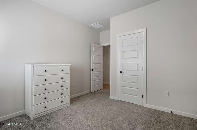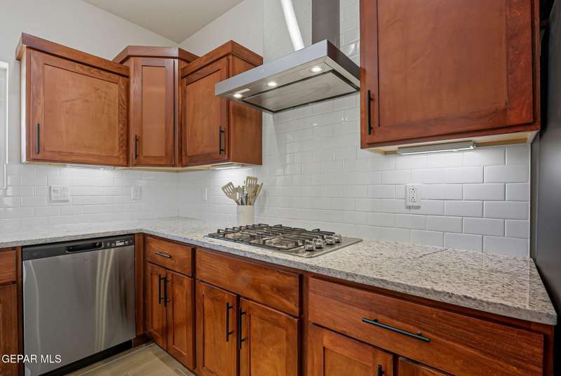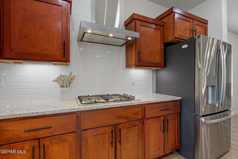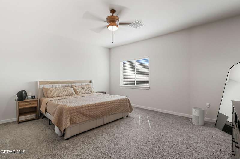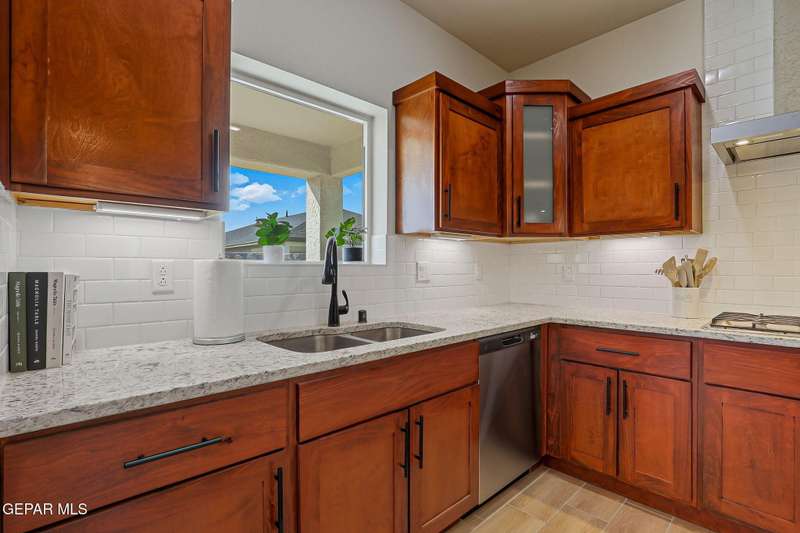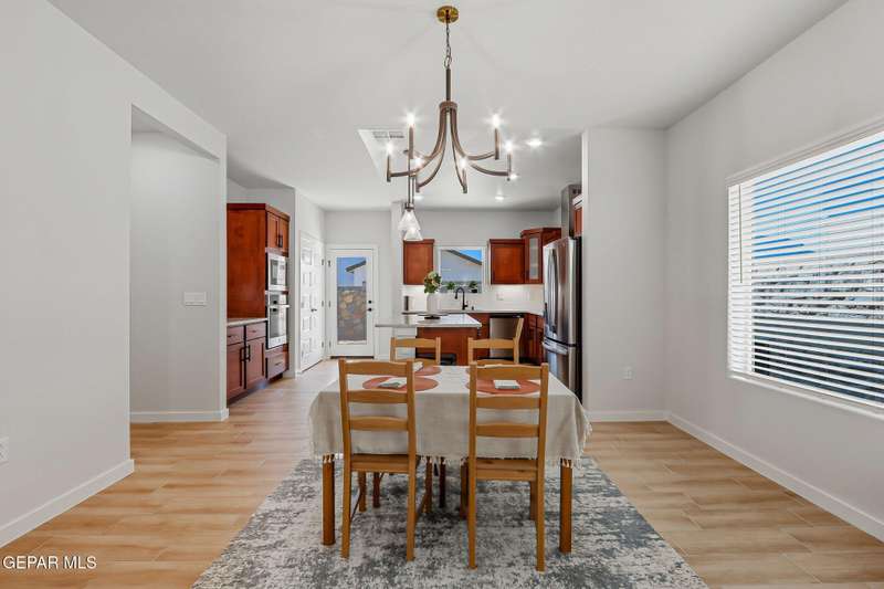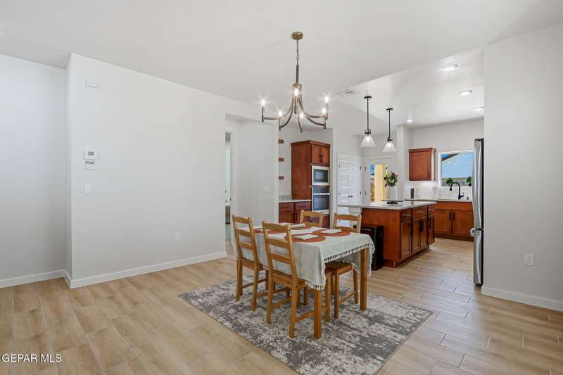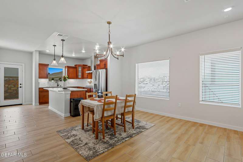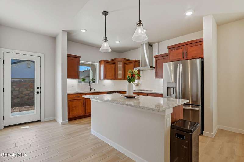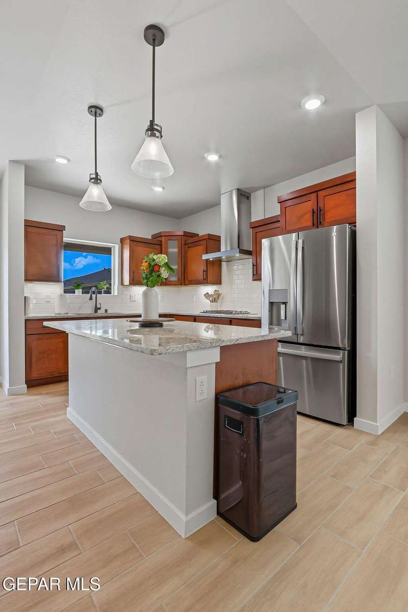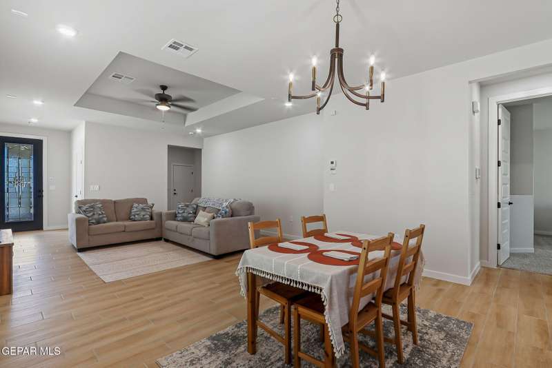Beautiful single-story home featuring an open-concept design with high ceilings and spacious living areas. The large family/living room flows seamlessly into the kitchen and dining areas-perfect for entertaining. The kitchen offers a center island, granite countertops, stylish tile backsplash, stainless steel appliances, pantry, and cabinets with crown molding. This home includes four inviting bedrooms and two full baths. The primary suite boasts a generous walk-in closet and a luxurious bathroom. Leased solar panels help keep electric costs low year-round. Located in the desirable Campo Del Sol community, residents enjoy resort-style amenities including a lazy river, pool, parks, and scenic walking trails. With a low annual HOA and convenient proximity to schools, shopping, and Fort Bliss, this home combines comfort, value, and lifestyle in one exceptional package.
