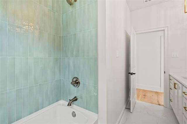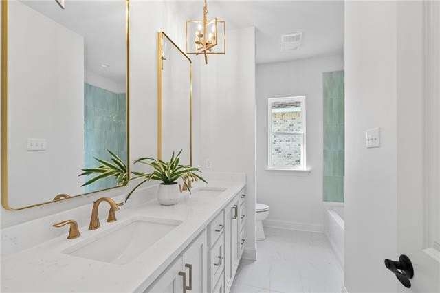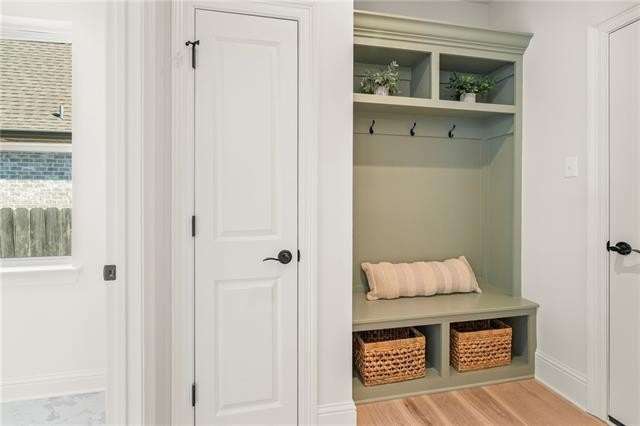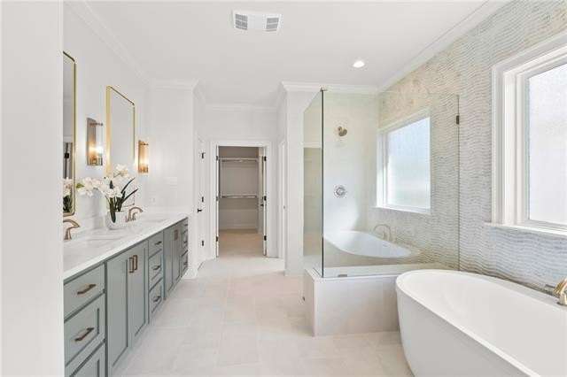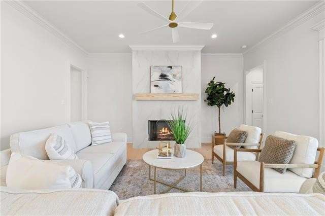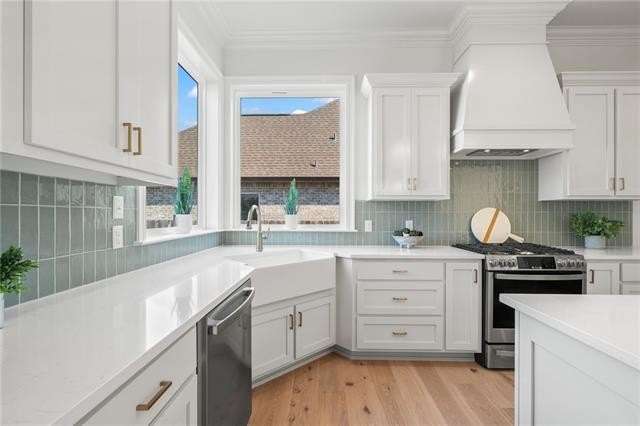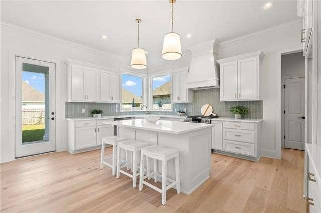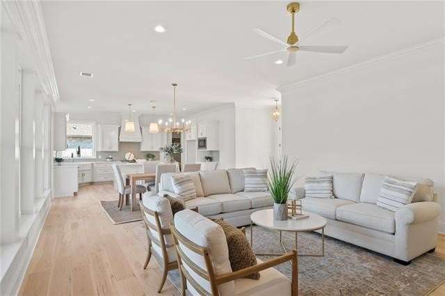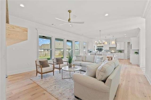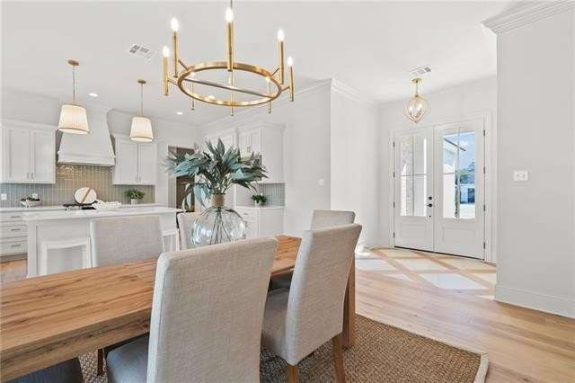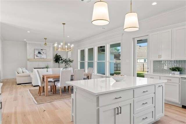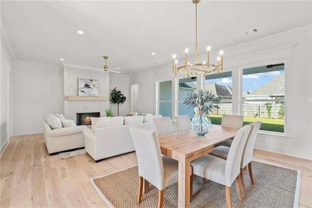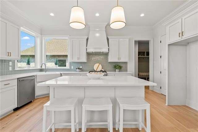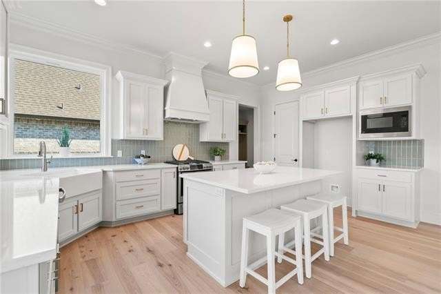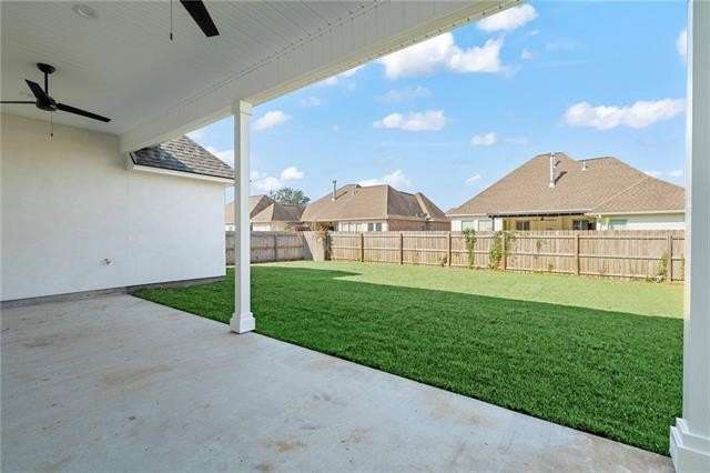 Another fabulous new BMI Construction home in The Oaks of Guste Island! This home offers an impressive experience from the moment you enter, with wood floors and a custom tile inlay design in the foyer. It features 4 bdrms/2 full baths, with no carpet throughout. The open floor plan includes a spectacular kitchen with a large island, vertical subway tile backsplash, stainless steel appliances, and a farm sink perfectly positioned in the corner, offering views of the rear yard through two plate glass windows. A convenient walk-in pantry completes the kitchen. The den boasts a tiled fireplace with a beam mantel, creating a cozy focal point. The gorgeous primary suite features a tray ceiling in the bedroom and a spa-like bath with a zero-entry shower and a stand-alone tub, dual vanities, and a spacious walk-in closet. The second bath also includes dual vanities. Additional features include a mudroom area off the garage entrance and a large covered patio with two ceiling fans, overlooking a fenced backyard. The home is located in Flood Zone "C" and is located in an excellent school district. Subdivision amenities offer a junior Olympic-sized pool, a clubhouse, a soccer/baseball field, and walking paths. This home truly shows exceptionally well and is ready to impress!
