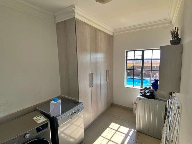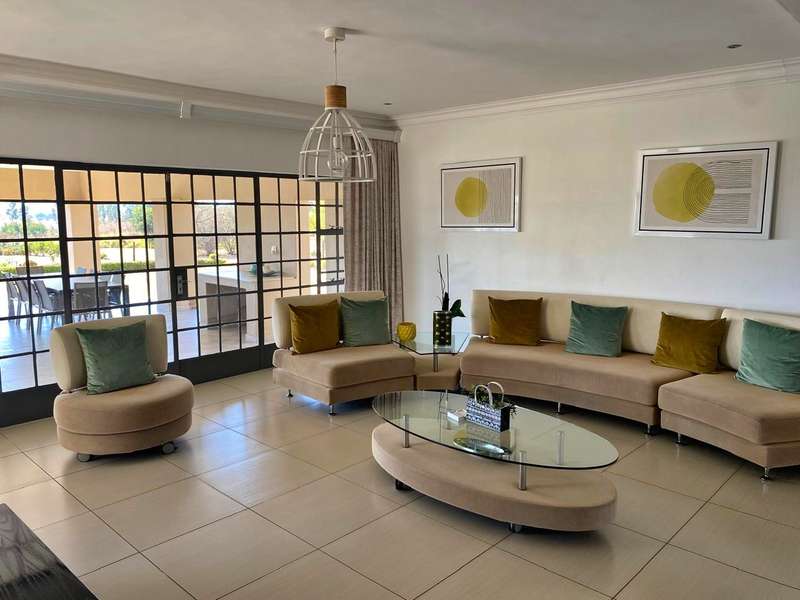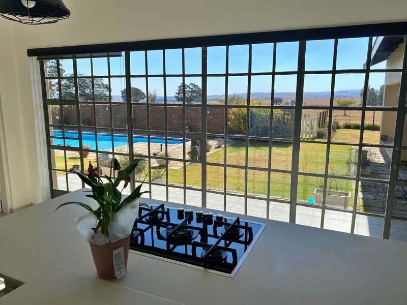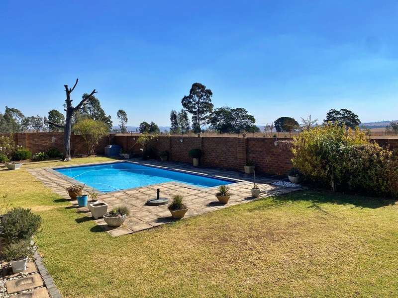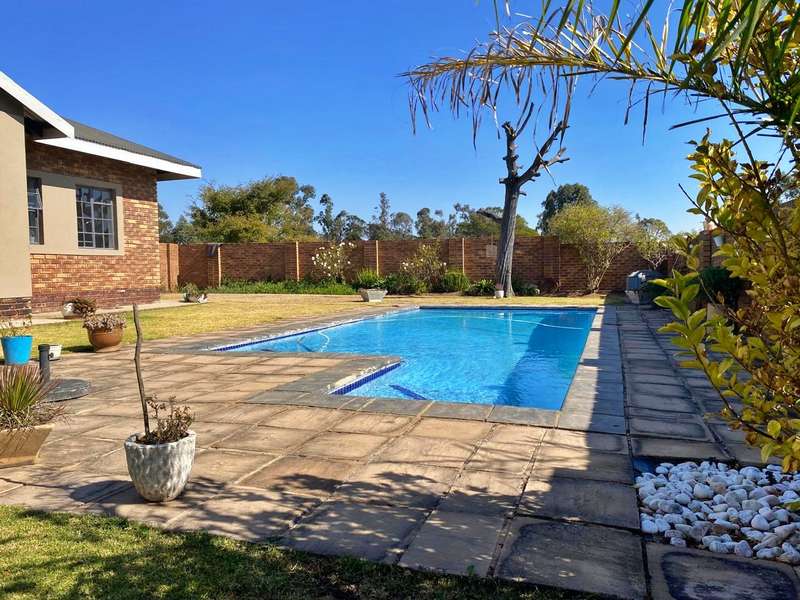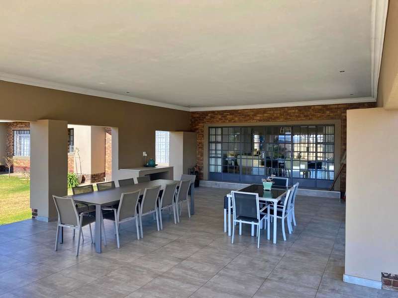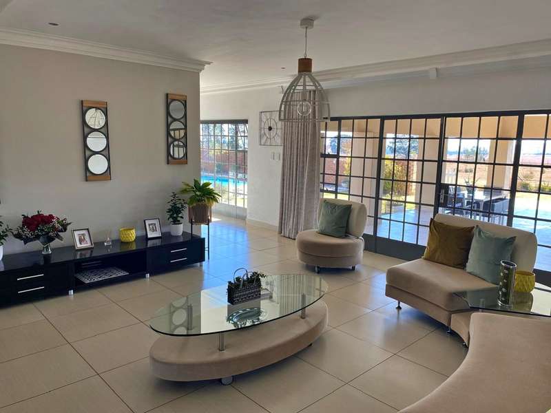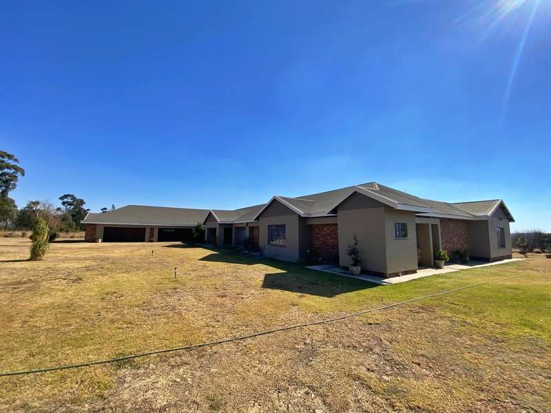 FIT FOR A KING. As you enter this masterpiece you enter with a large reception area into a property that offers expansive living areas, generously sized rooms, and ample garage space, ensuring comfort and convenience for all your needs. Extremely neat residence with very high-quality finishes. Dwelling consists of two lounges, a TV room, a family room, a very modern kitchen with pantry, scullery and laundry. A large stoep next to a sparkling pool gives you an expansive undisturbed view to the North. Five bedrooms and four bathrooms, a walk-in cupboard, with study and six garages with a 10-Kilowatt Solar system with 16x 450-Watt solar panels and three 3.7-watt Lithium-Ion batteries. Water is supplied by borehole. You also have a three-bedroom staff cottage with bathroom and kitchen. ALL buildings, about 2,5 hectares is electric fence fenced. Also, eight CCTV cameras provide security. Rest of the property is cattle fenced.