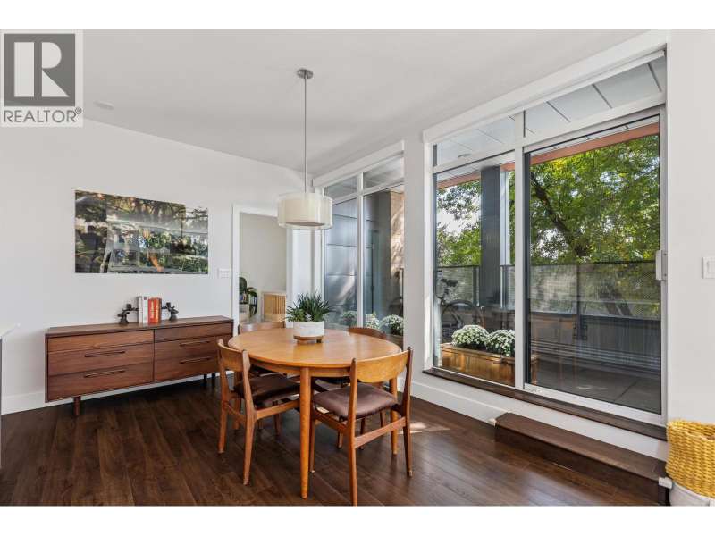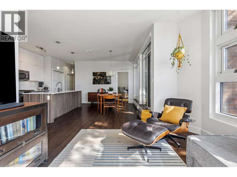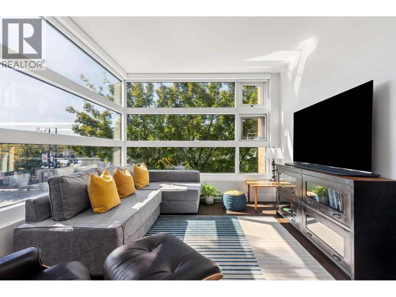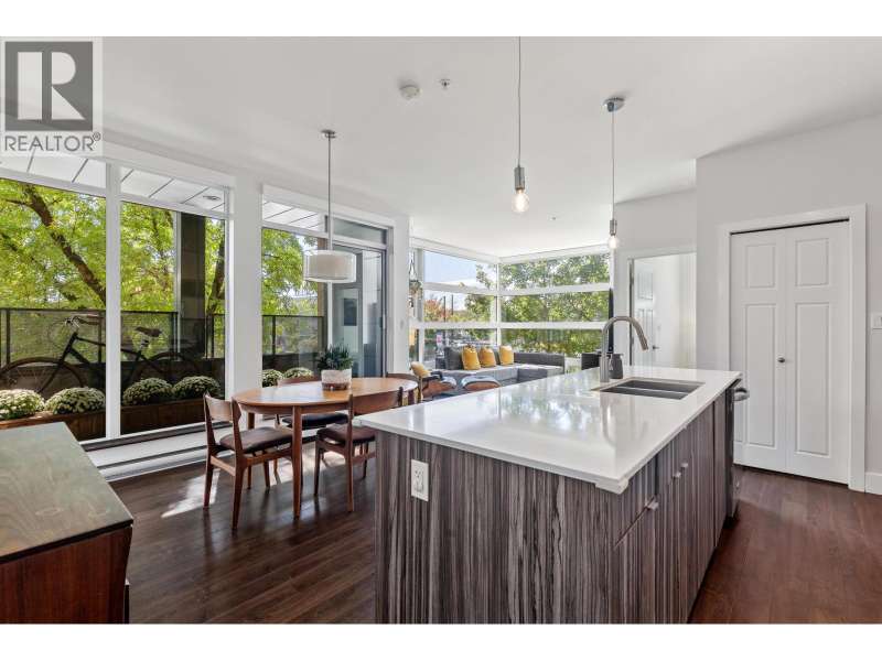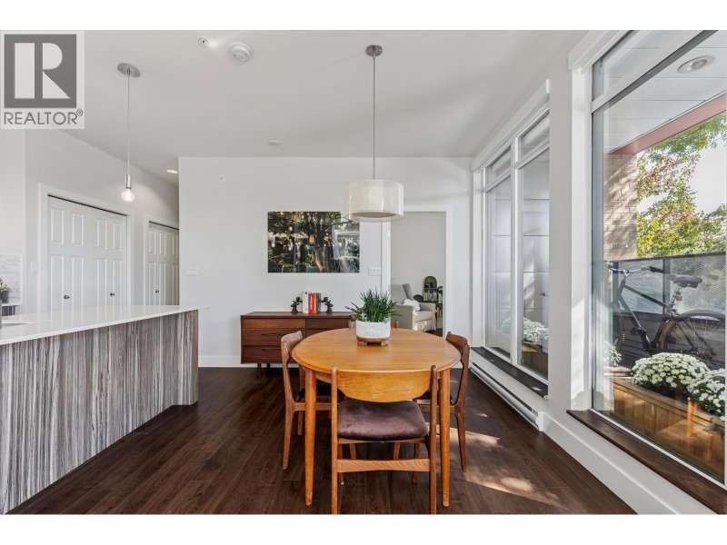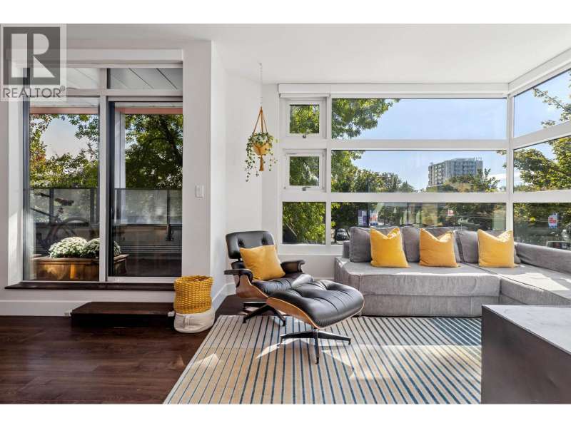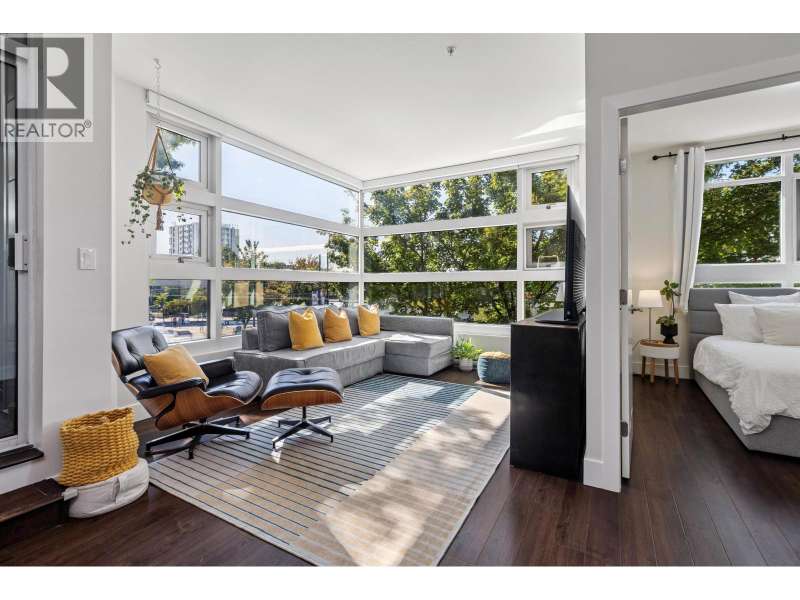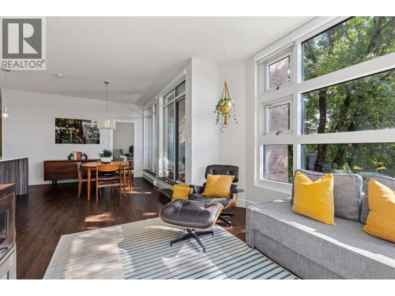 RARE CONCRETE low-rise on the Drive with light, lifestyle, and livability in equal measure. Corner home with 9´ ceilings and a dramatic full-span wall of south & west windows wrapping the living area; no breaks, just all glass and treed outlooks. Automated blinds throughout - bedrooms too! Open-concept plan has great flow: proper dining, large island kitchen with gas range & full-size appliances, & generous living area. Separated bedrooms & an extra-large bathroom with stand-alone soaker tub & shower. Covered 60 SF balcony extends your living. Original owner - never rented. Heat pump installation allowed & EV charging in the garage. Step out to Commercial Drive´s cafés, markets, culture & catch the SkyTrain just a block away. A hip, connected community at your doorstep. (id:58403)