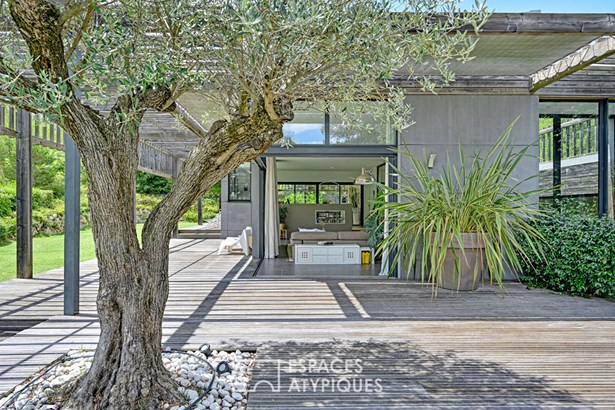 The outdoor spaces, conducive to relaxation, are complemented by a large central patio, creating a perfect harmony between the interior and the exterior. Inside, the house is designed around a resolutely modern concept.