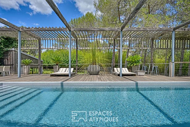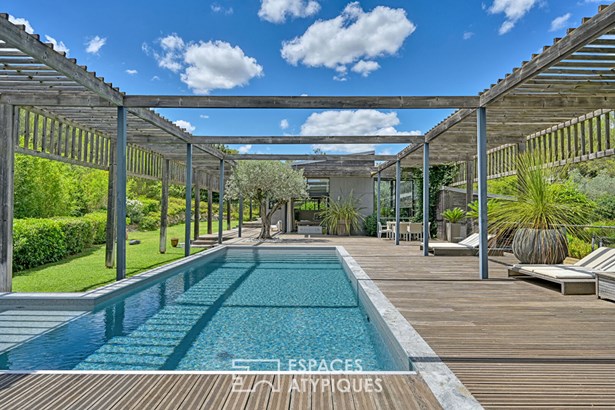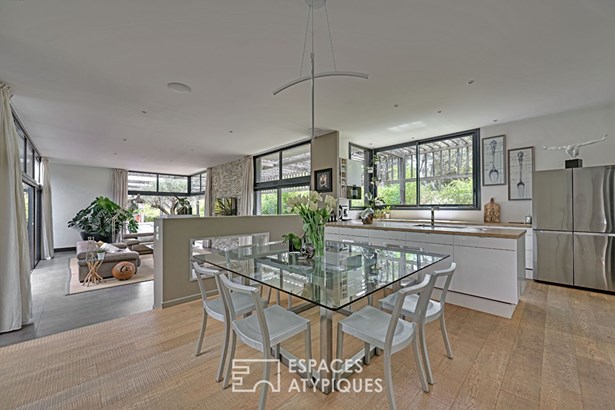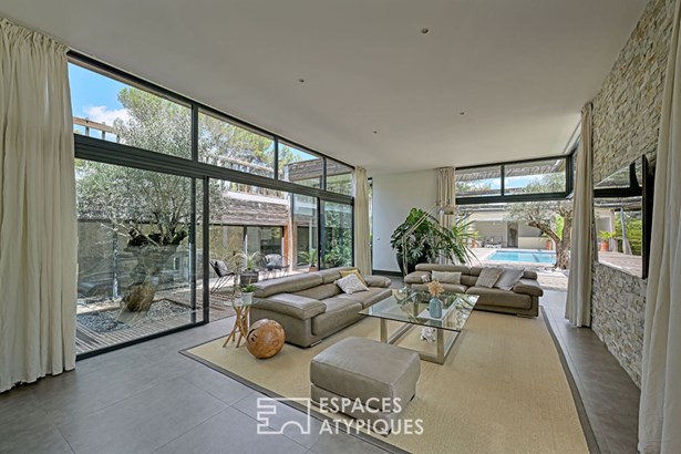 Built in Saint-Gely-du-Fesc, this contemporary house of (506 m2 (including annexes, garages, laundry room, summer kitchen, storeroom, etc.) and 295 sqm of living space, stands out for its bold architecture and generous volumes.