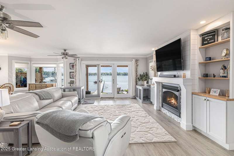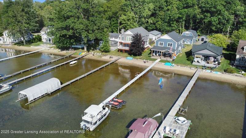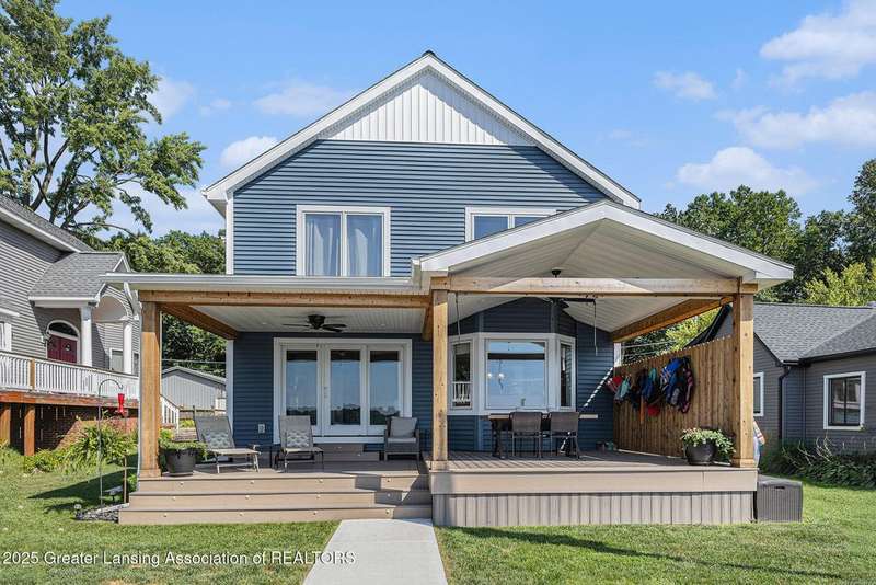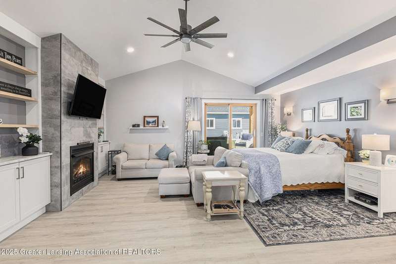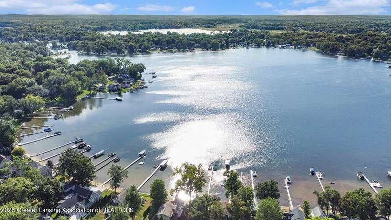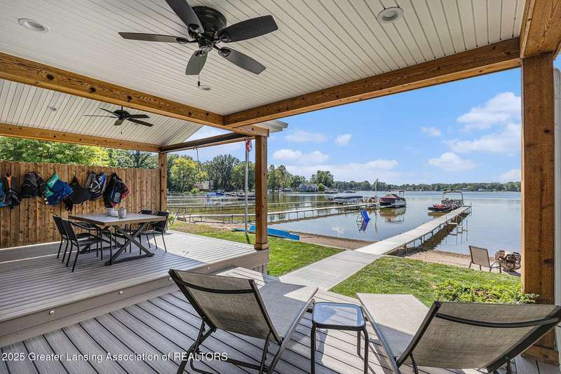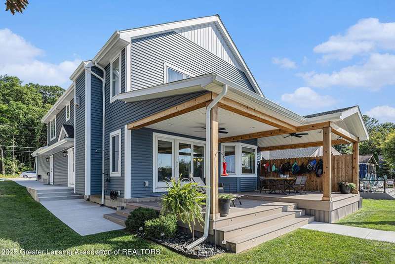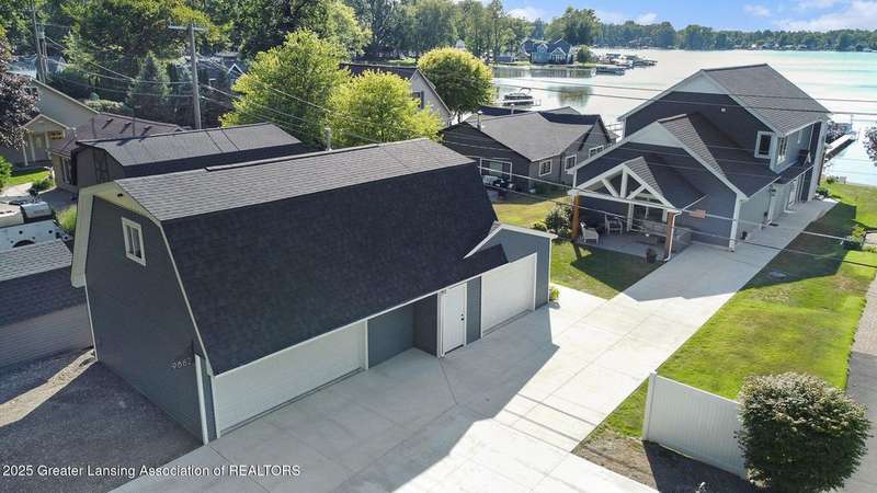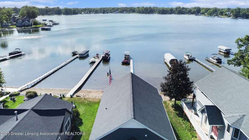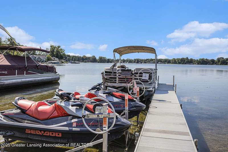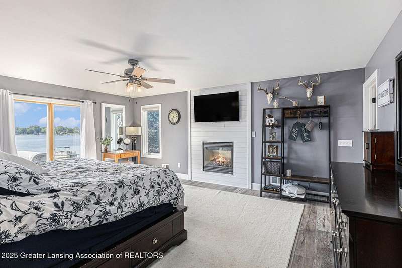 If you've been searching for a one of a kind home on the Huron chain of lakes, this is it! The entire 3,216 sq ft two story home has been professionally and tastefully updated on the exterior and interior. Features 5 bedrooms, 3.5 bathrooms, main floor primary suite is massive with soaring ceilings, a cozy built in fireplace surrounded by shelves, a huge custom built WI closet, large bathroom w/dual sinks, tiled walk-in shower and granite countertops, complete with door to your own private covered concrete patio with recessed lighting & ceiling fan. 2nd floor features remodeled primary suite with fireplace, updated bath with dual sinks,tiled walk in shower, closet and additional laundry area. Three additional spacious bedrooms and a full bath are located on the second level. Gorgeous kitchen with SS appliances and quartz countertops that wraps around to the spacious open dining/living room area facing the lake and new trex deck with recessed lighting & ceiling fans. Three car detached finished, heated garage with stairs to a loft for extra storage. All new concrete drive, (lots of parking) patio space & sidewalk to dock/lake. Within the last few years this home has had all new flooring throughout, a new roof (house & garage), new siding, new two-zoned unit furnace & AC, new water heater, too many upgrades to mention. Basically a brand new home with 49 feet of lake frontage, an outdoor shower convenient for rinsing yourself or your pets after a lake day/swim. Also includes generator that is wired to run the entire house.