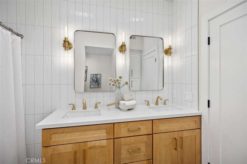 The spa-inspired bath is fully renovated with dual sinks, statement mirrors, designer tile, and an extra-wide soaking tub/shower combo.