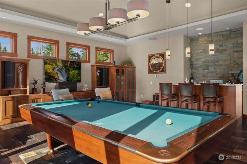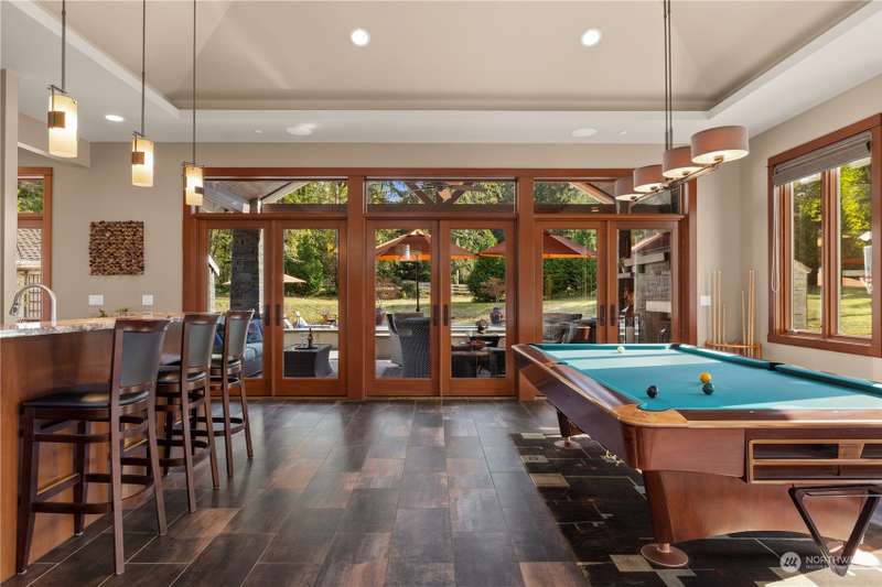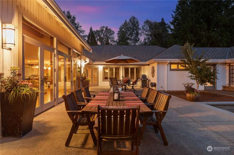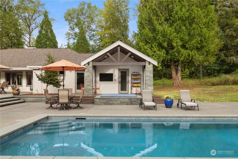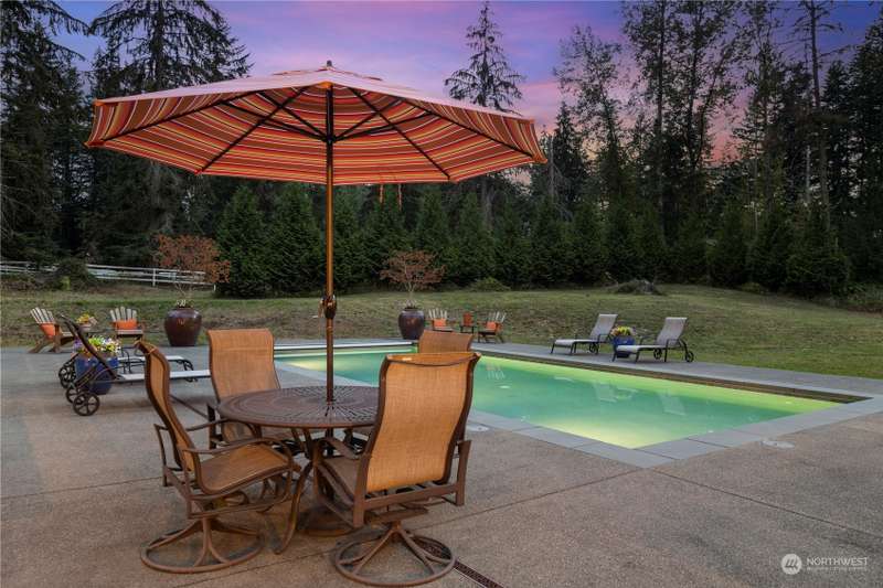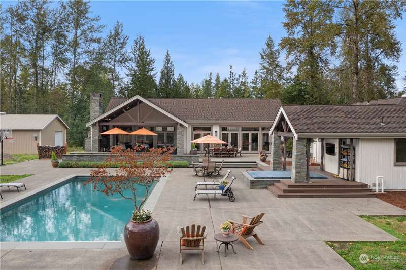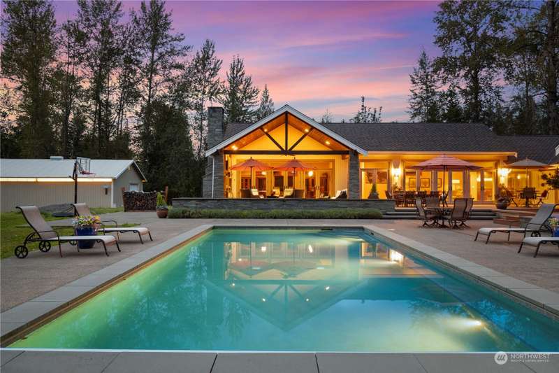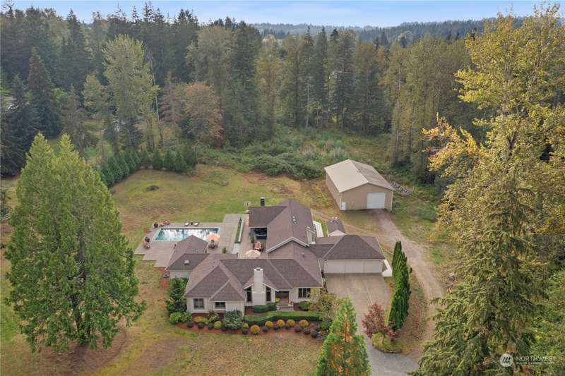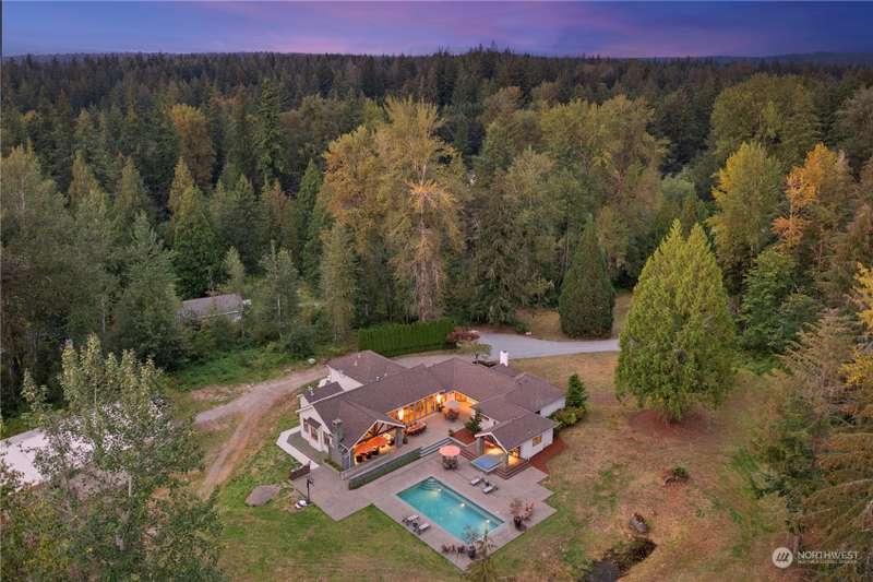 Discover a rare gem: a custom-built rambler on 5+ secluded acres. This one-owner home fuses Pacific Northwest style with modern luxury. Inside, rich earthy tones and a mix of wood, stone and granite create a warm inviting atmosphere. The expansive kitchen, with professional-grade appliances and a massive island, is perfect for entertaining. Nearby, the game room with a wet bar offers a relaxed space for unwinding. Step outside to your private oasis—warm up by the outdoor fireplace or take a dip in the shimmering pool. End the evening in the hot tub beneath a canopy of stars. With a large detached shop, easy access to Soaring Eagle Park and Lake Washington schools, this retreat offers serene privacy just minutes from nearby conveniences.