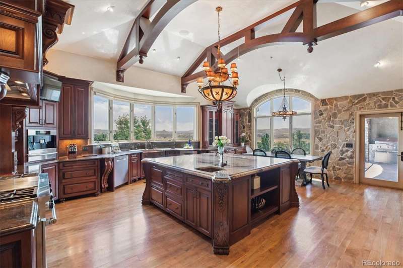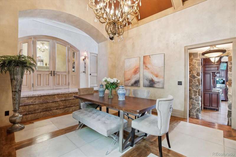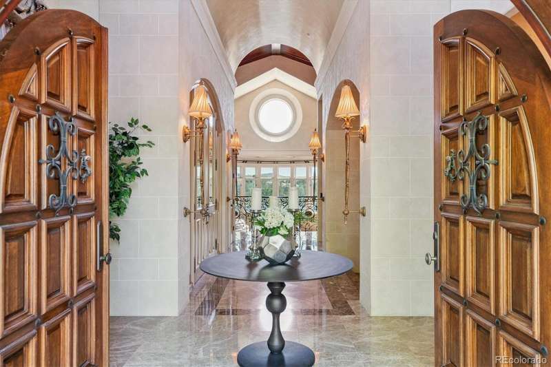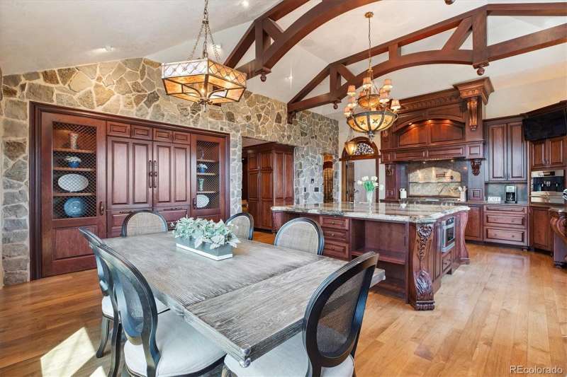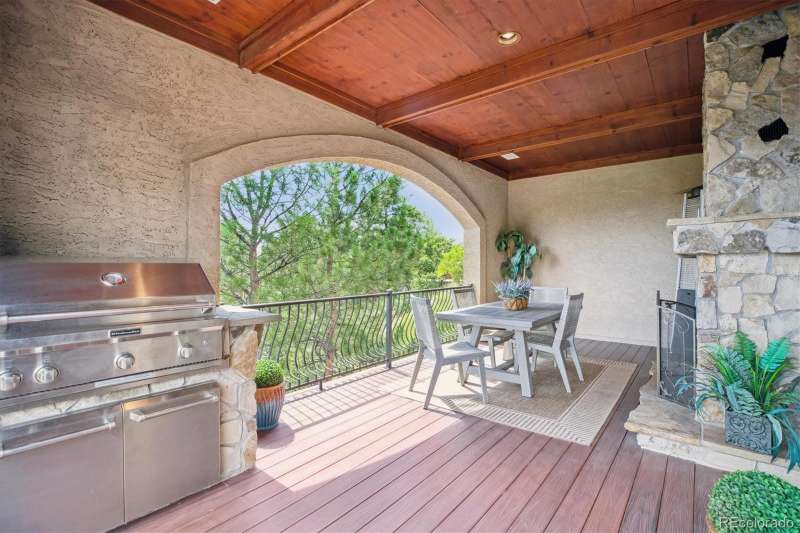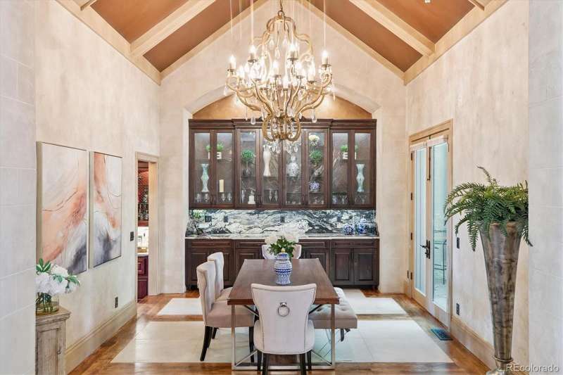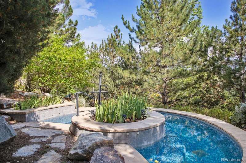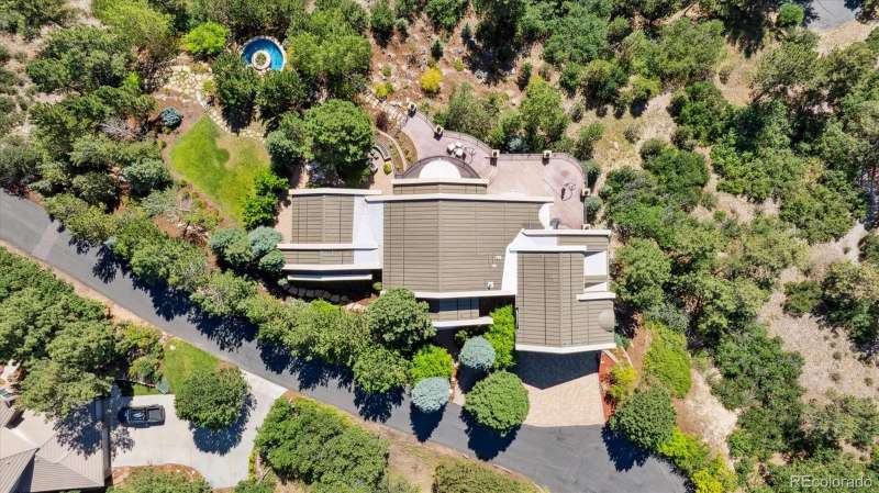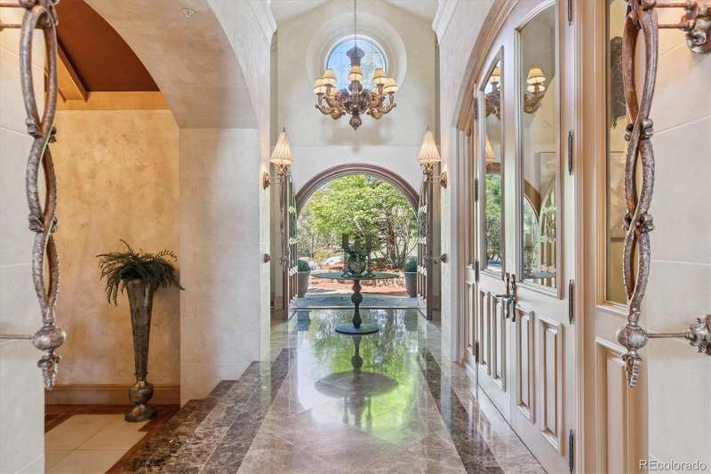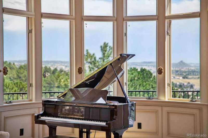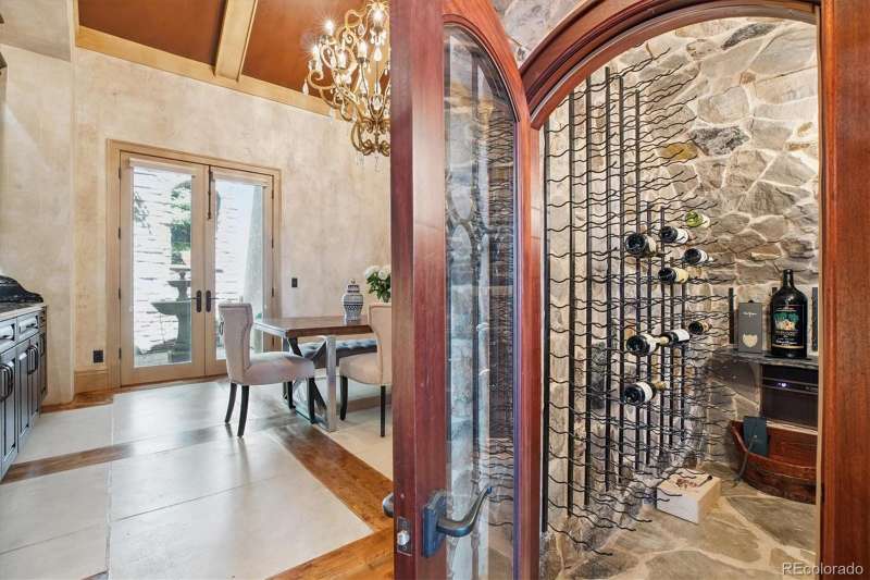 Spectacular Views & Unparalleled Luxury in Castle Pines Village. Nestled on a serene 1.75-acre wooded lot in the exclusive Castle Pines Village, this custom estate offers the perfect blend of privacy, elegance, and breathtaking views. From the moment you step inside, you are greeted by a stunning entryway and exquisite custom woodwork that set the tone for the homes timeless charm.The great room, highlighted by soaring wood cathedral ceilings and walls of windows, frames panoramic mountain views and flows seamlessly into the gourmet kitchen. Designed for both everyday living and entertaining, the kitchen features top-of-the-line appliances, a large center island, and an adjacent 300-bottle wine cellar. A formal dining room provides an elegant space for gatherings, while multiple living areas invite comfort and relaxation. The primary suite is a true retreat, offering dramatic views, a spa-inspired bath with heated floors, infinity tub, steam shower, and a custom wardrobe dressing room. Each of the spacious secondary bedrooms features en suite baths, and a private guest suite with deck access ensures comfort for visitors. Designed for entertainment, this home includes a bonus room with a pub-style bar and billiards, a theater room, and a private office with custom built-ins. A cozy den with a grand fireplace provides yet another inviting living space. Step outside to experience unbelievable outdoor living with multiple decks overlooking the treetops and mountains, a fire pit, hot tub spa, and a beautifully landscaped private yard. This rare Castle Pines Village retreat combines luxurious living with Colorados natural beauty. Fantastic gated community with swimming, tennis, fitness center trails and Security rate access to restaurants and shopping.