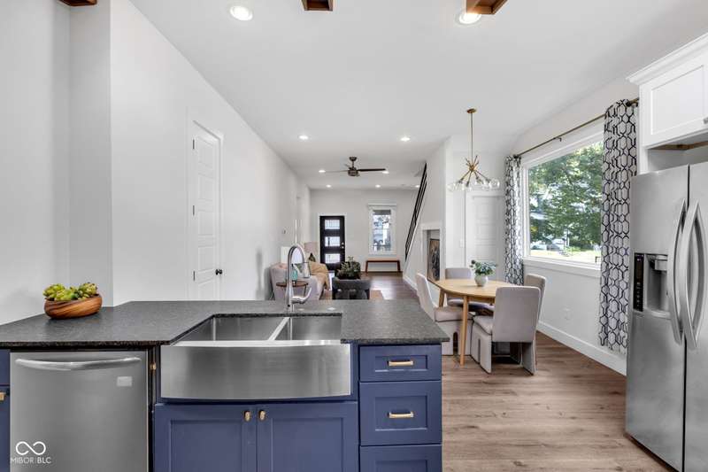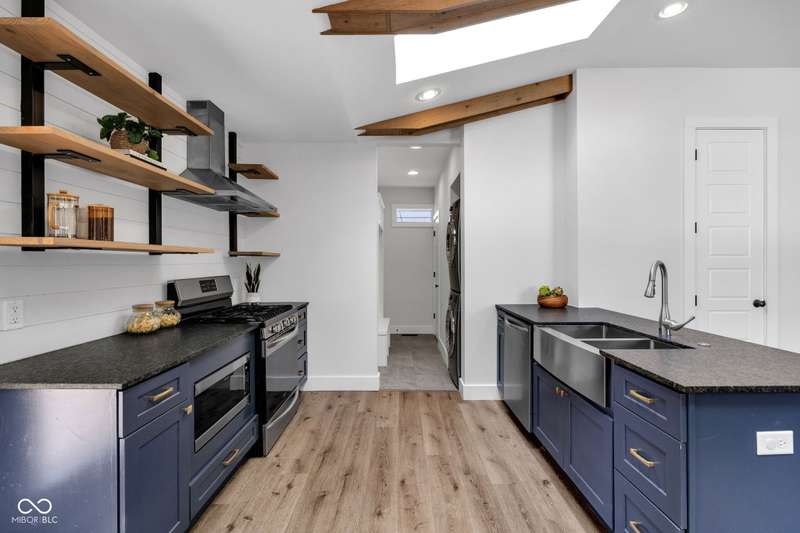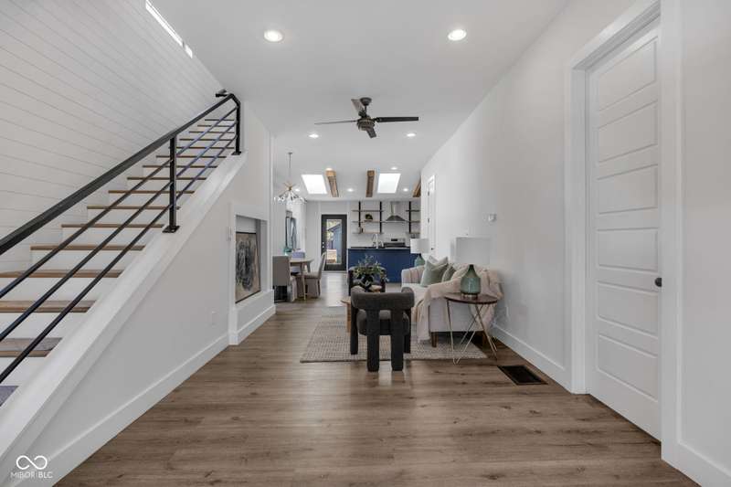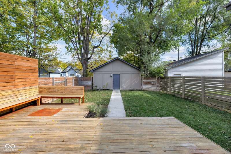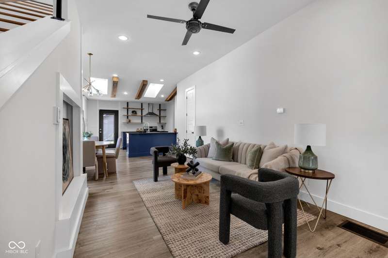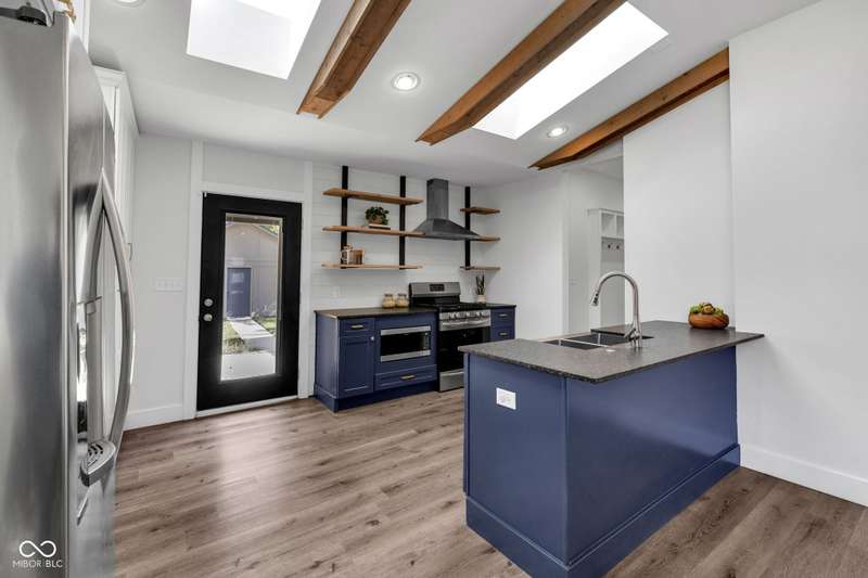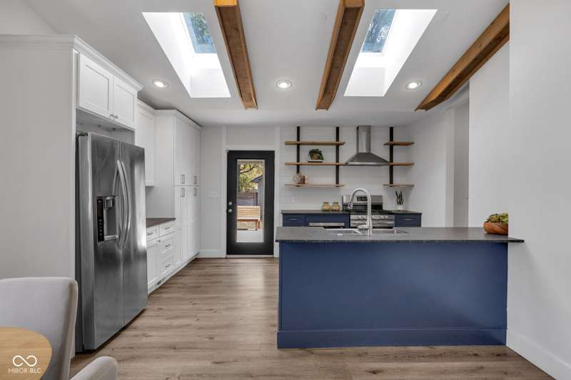 Welcome to this modern 3-bedroom, 2-bathroom home in the heart of Fountain Square, one of Indianapolis' most sought-after neighborhoods! This home offers 9 1/2 foot ceilings on the main floor, open-concept living, tons of natural light, and high-end contemporary design just minutes from downtown Indianapolis, top restaurants, nightlife, and coffee shops. Step inside to an inviting open kitchen and living space featuring skylights, stainless steel appliances, and a large center island perfect for entertaining. The main-level primary suite is your private retreat, showcasing a custom luxury bath with dual vanities, gorgeous tile, and a spa-style walk-in shower. Don't miss the huge walk-in closet for all your storage needs! Two additional bedrooms offer space for guests, a home office, or creative studio. Outside, enjoy a fully fenced yard, perfect for pets or outdoor gatherings, plus a large patio ideal for relaxing evenings. The EV charger in the garage adds convenience and sustainability for modern living. This move-in-ready Fountain Square gem combines style, function, and location-the perfect opportunity to enjoy urban living with a neighborhood feel. Garage Built (2018), New Roof (2019), Water Softener Added (2021), Custom Primary Bathroom Remodel (2024).