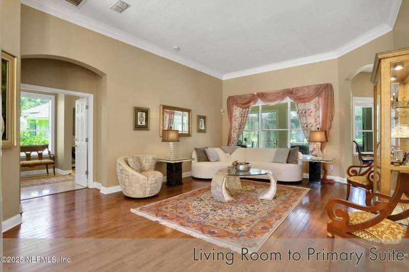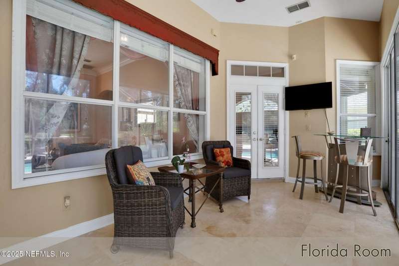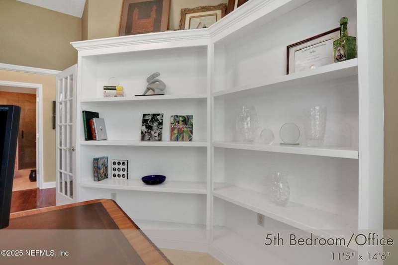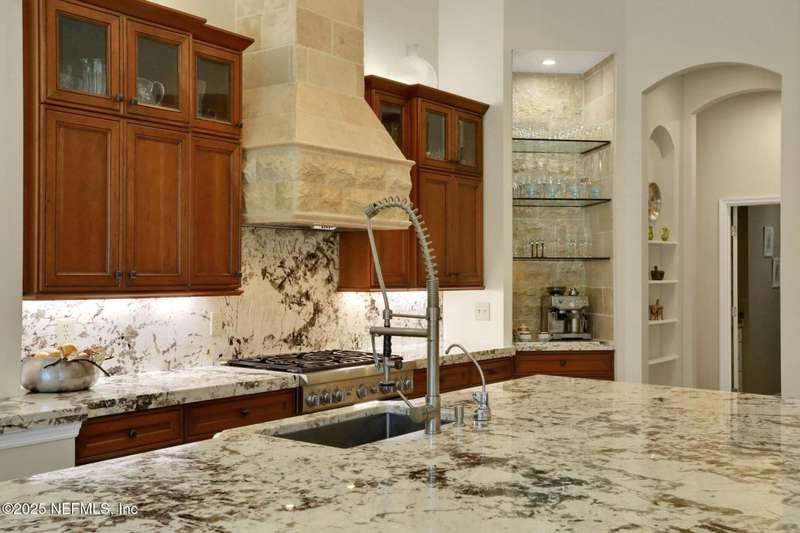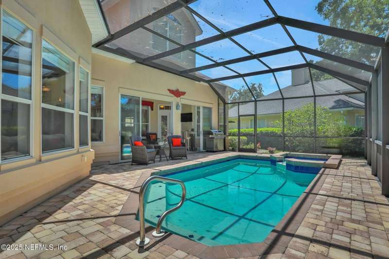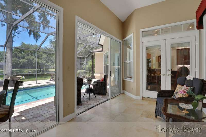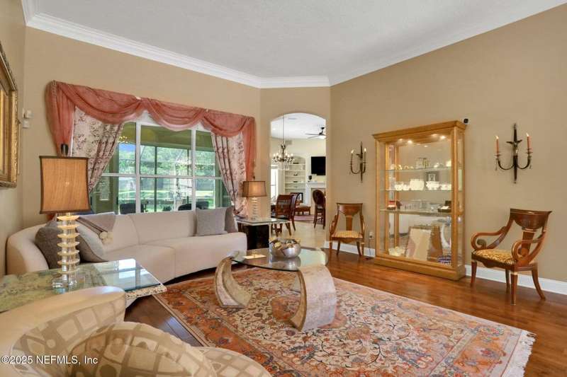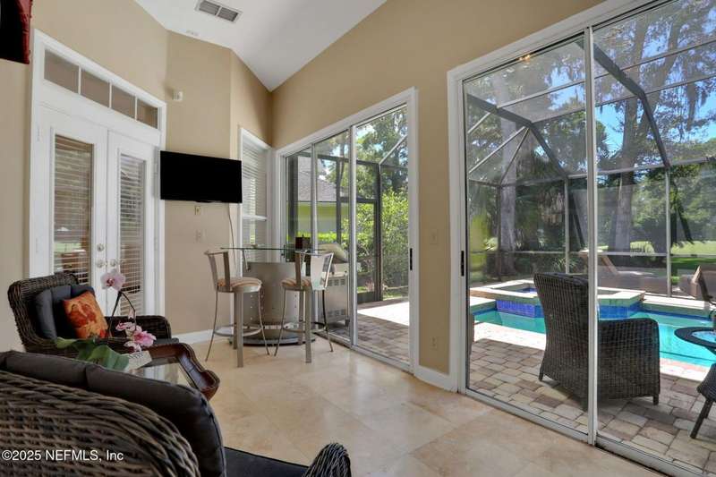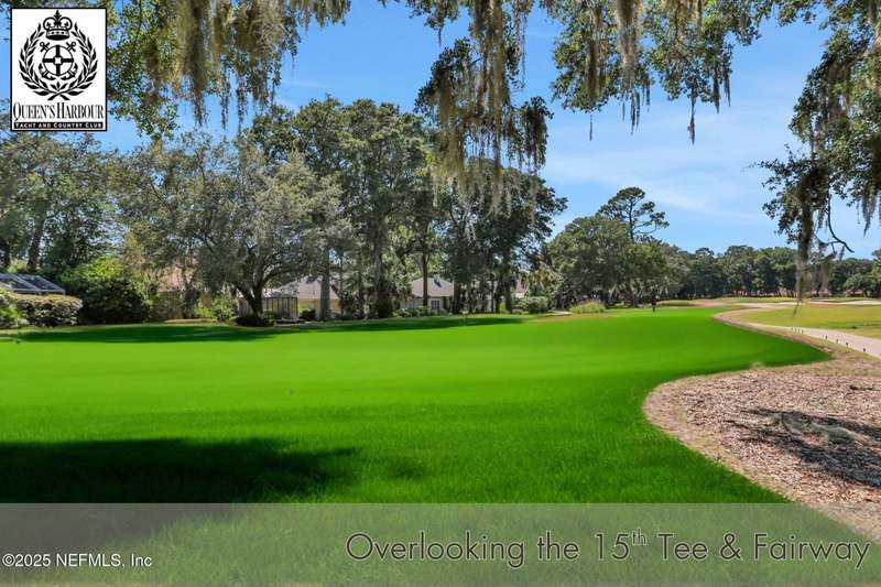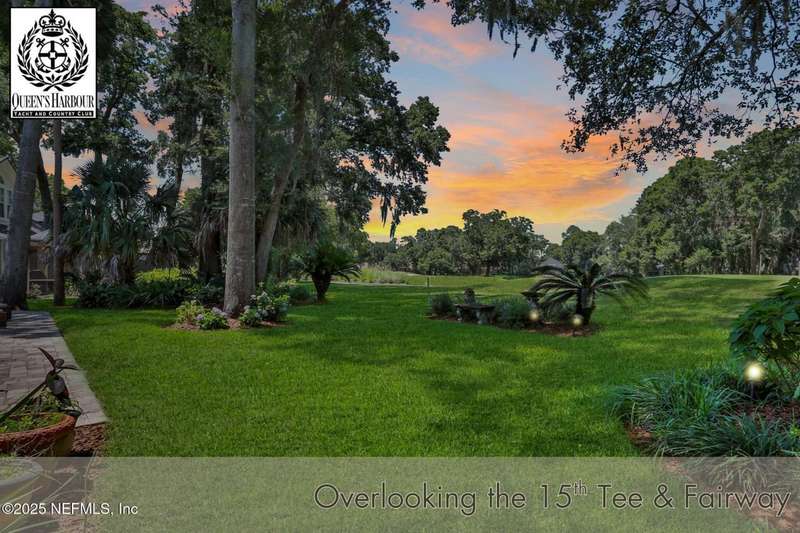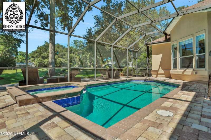 This gorgeous home sits pretty on a spacious lot overlooking the Mark McCumber designed championship golf course in the exclusive gated community of Queen's Harbour. It has five ensuite bedrooms and over 3,300 sq ft of indoor living space. An added bonus is the 860 sq ft of screened outdoor living complete with an inground pool and spa. This home has room for everyone. Pull up the expanded paver driveway and you'll immediately notice the charming courtyard entry garage. The magnificent eight-foot leaded glass double doors topped with an arched transom window create a grand entrance that floods the foyer, living room, and dining room with natural light. Step inside and prepare to be wowed by the incredible water-to-golf course views through the living room's wall of windows. The large-format travertine and gleaming engineered wood floors throughout the main level add an elegant touch that's both beautiful and practical. The spacious dining room can and has hosted dinner parties for twelve or more, making it perfect for entertaining. But the real showstopper is the Great Room, which truly serves as the heart of this home. This naturally-lit space features a wall of windows and glass doors with fabulous water-to-golf views from every angle. The luxuriously updated kitchen is a chef's paradise with a huge island that seats six for dining and gathering space for more. The breakfast nook and comfortable den with marble hearth gas fireplace is paired with an floor-to-ceiling custom wood display cabinet. This is amazing space.The furniture-inspired Thomasville Custom Cabinetry with two-tier stacked upper cabinets features a glass display gallery to showcase all of for your attractive dishware and collectibles. Soft-close doors, custom inserts, and soft-glide drawers highlight the quality construction. The exotic and rare double straight-edge granite countertops with matching seamless backsplash create a cohesive, designer-inspired look.Two built-in tumbled travertine beverage stations add convenience and style. One serves as a coffee station while the other handles adult beverages, both feature ambient lighting and custom glass shelving. The glass entry pantry closet with custom shelving keeps everything organized and clutter-free.The kitchen comes equipped with a top-of-the-line Thermador appliance package including a six-burner gas range topped with a limestone exhaust hood, seven-foot three-door French-style refrigerator, and Sapphire dishwasher.Off the great room, through the breakfast nook to the sun room. The Sun Room has double sliders leading to the outdoor screened living space with sparkling pool and spa overlooking the park-like backyard. Beyond the screened enclosure is a huge open patio extending the outdoor entertainment options even further especially with the incredible expansive long-views of the golf course.The thoughtful three-way split bedroom floor plan works perfectly for multi-generational living. The primary bedroom, located just off the foyer, features a vestibuled entry with an oversized bedroom on one side and a resort-style bath on the other. This tremendous bathroom includes a soaker tub, oversized shower, two separate vanities, water closet, and two walk-in closets. The sleeping area has a generously sized sitting area with French doors to the sun room and pool.On the opposite side of the home, the guest bedroom wing includes bedrooms two and three sharing a Jack and Jill bath with double sinks and linen closet