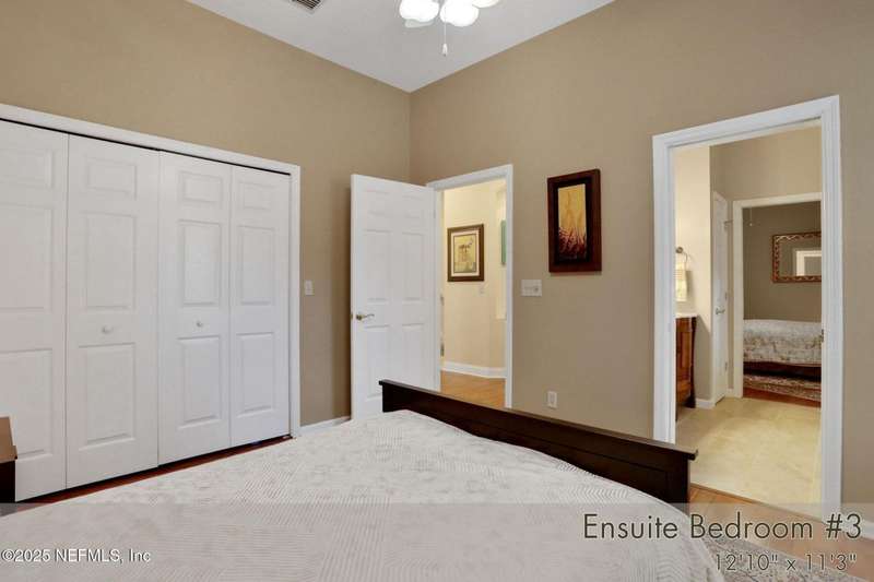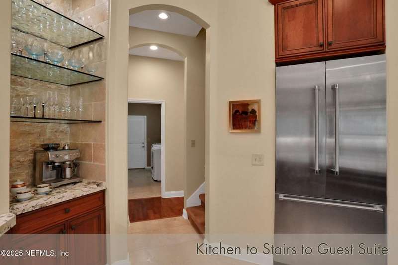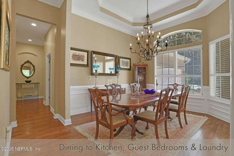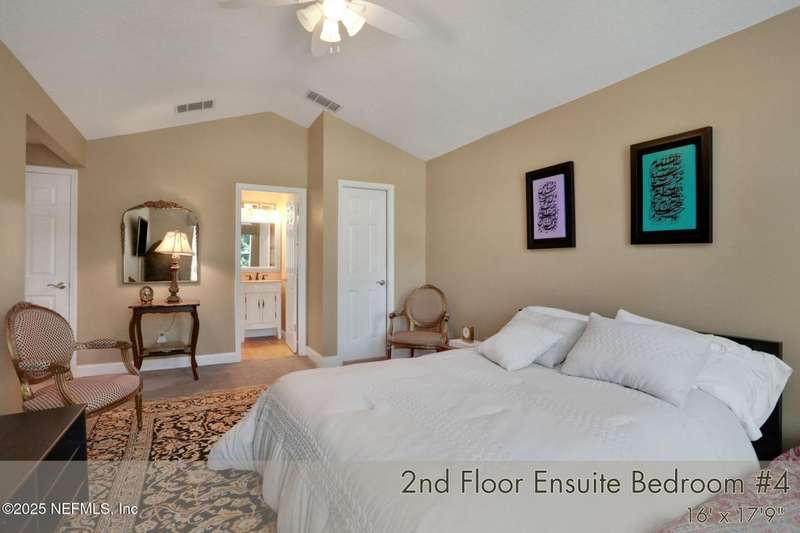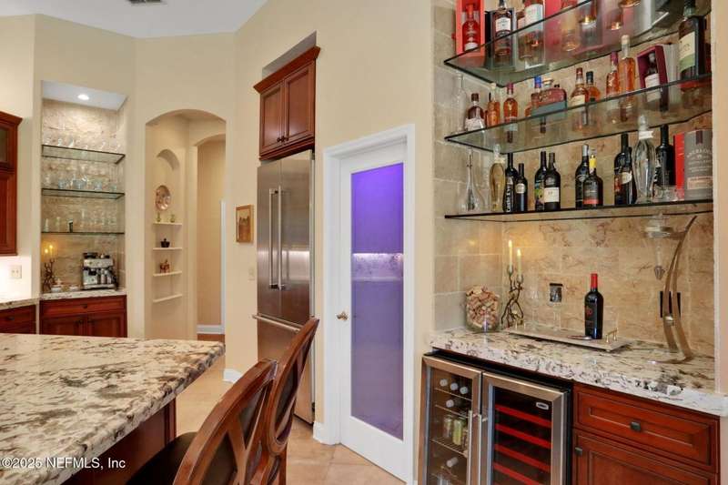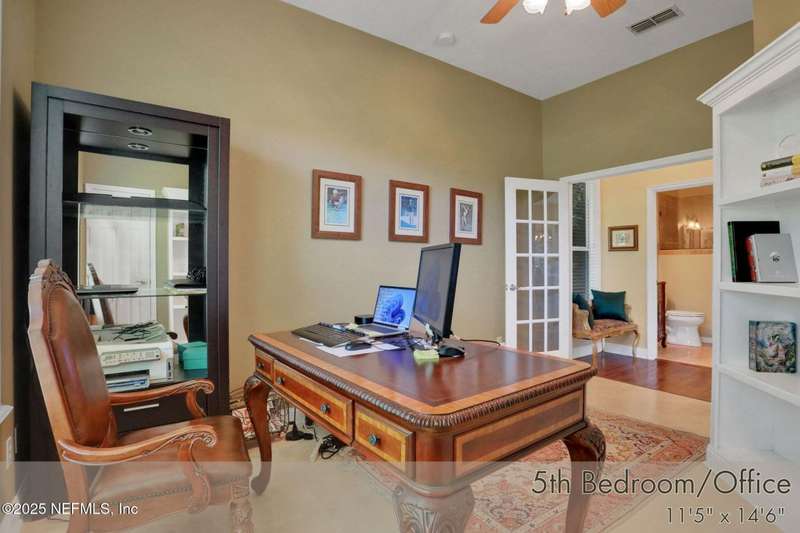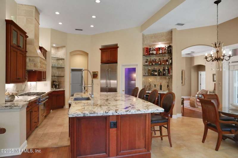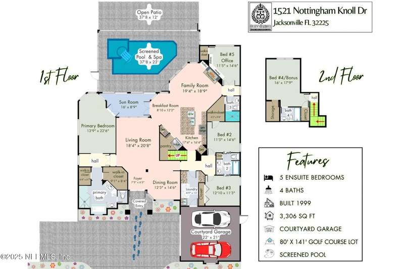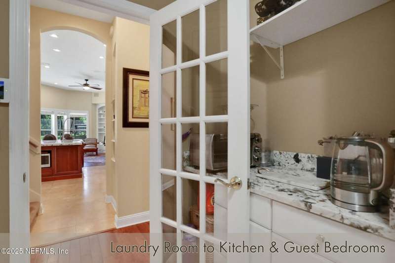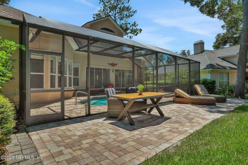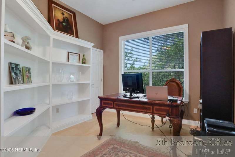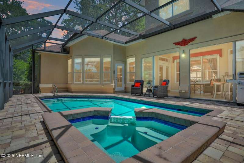 This gorgeous home sits pretty on a spacious lot overlooking the Mark McCumber designed championship golf course in the exclusive gated community of Queen's Harbour. It has five ensuite bedrooms and over 3,300 sq ft of indoor living space. An added bonus is the 860 sq ft of screened outdoor living complete with an inground pool and spa. This home has room for everyone. Pull up the expanded paver driveway and you'll immediately notice the charming courtyard entry garage. The magnificent eight-foot leaded glass double doors topped with an arched transom window create a grand entrance that floods the foyer, living room, and dining room with natural light. Step inside and prepare to be wowed by the incredible water-to-golf course views through the living room's wall of windows. The large-format travertine and gleaming engineered wood floors throughout the main level add an elegant touch that's both beautiful and practical. The spacious dining room can and has hosted dinner parties for twelve or more, making it perfect for entertaining. But the real showstopper is the Great Room, which truly serves as the heart of this home. This naturally-lit space features a wall of windows and glass doors with fabulous water-to-golf views from every angle. The luxuriously updated kitchen is a chef's paradise with a huge island that seats six for dining and gathering space for more. The breakfast nook and comfortable den with marble hearth gas fireplace is paired with an floor-to-ceiling custom wood display cabinet. This is amazing space.The furniture-inspired Thomasville Custom Cabinetry with two-tier stacked upper cabinets features a glass display gallery to showcase all of for your attractive dishware and collectibles. Soft-close doors, custom inserts, and soft-glide drawers highlight the quality construction. The exotic and rare double straight-edge granite countertops with matching seamless backsplash create a cohesive, designer-inspired look.Two built-in tumbled travertine beverage stations add convenience and style. One serves as a coffee station while the other handles adult beverages, both feature ambient lighting and custom glass shelving. The glass entry pantry closet with custom shelving keeps everything organized and clutter-free.The kitchen comes equipped with a top-of-the-line Thermador appliance package including a six-burner gas range topped with a limestone exhaust hood, seven-foot three-door French-style refrigerator, and Sapphire dishwasher.Off the great room, through the breakfast nook to the sun room. The Sun Room has double sliders leading to the outdoor screened living space with sparkling pool and spa overlooking the park-like backyard. Beyond the screened enclosure is a huge open patio extending the outdoor entertainment options even further especially with the incredible expansive long-views of the golf course.The thoughtful three-way split bedroom floor plan works perfectly for multi-generational living. The primary bedroom, located just off the foyer, features a vestibuled entry with an oversized bedroom on one side and a resort-style bath on the other. This tremendous bathroom includes a soaker tub, oversized shower, two separate vanities, water closet, and two walk-in closets. The sleeping area has a generously sized sitting area with French doors to the sun room and pool.On the opposite side of the home, the guest bedroom wing includes bedrooms two and three sharing a Jack and Jill bath with double sinks and linen closet