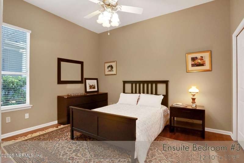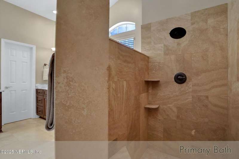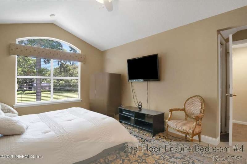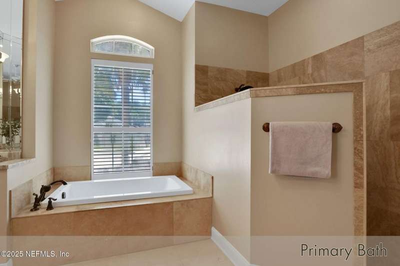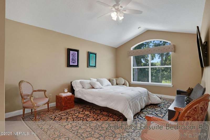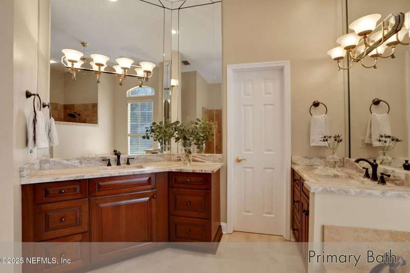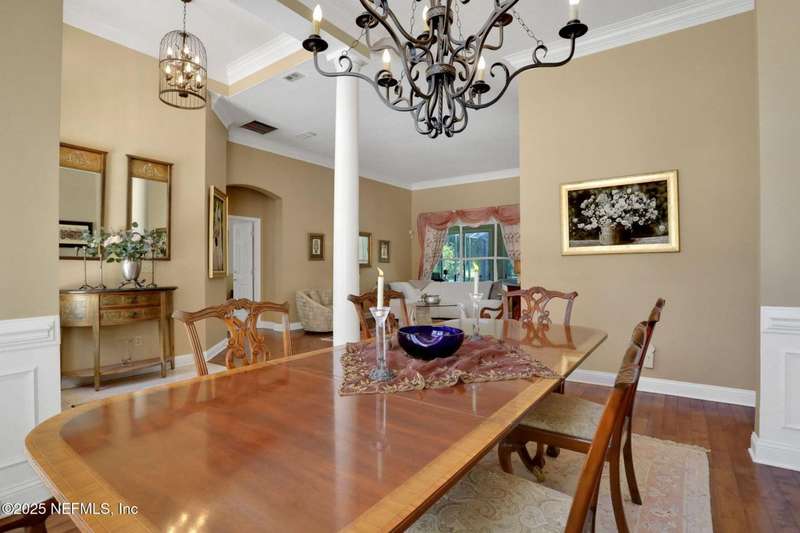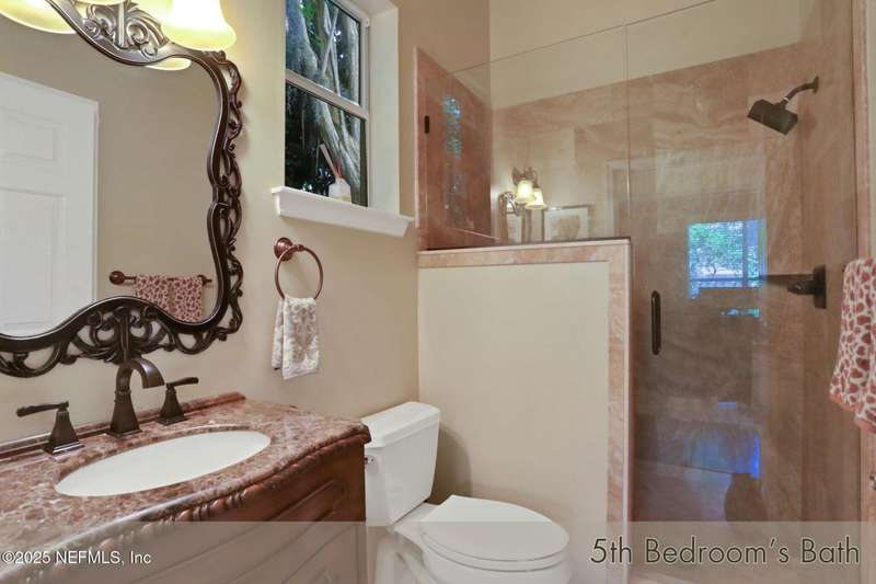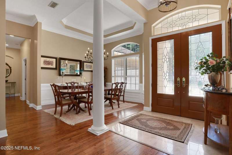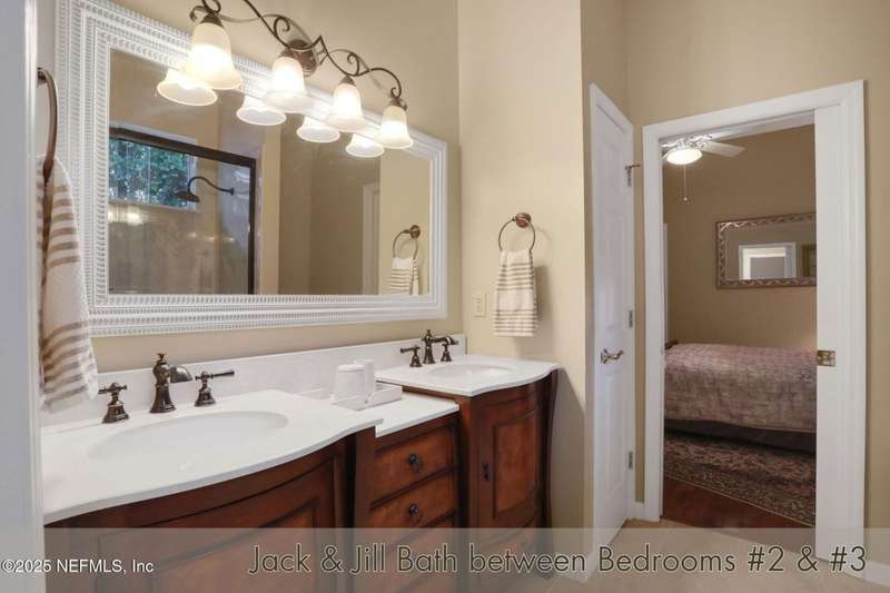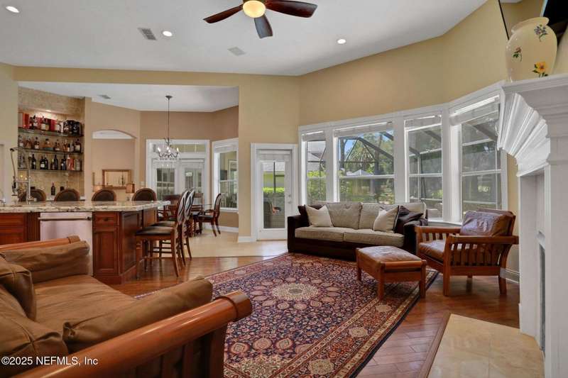 This gorgeous home sits pretty on a spacious lot overlooking the Mark McCumber designed championship golf course in the exclusive gated community of Queen's Harbour. It has five ensuite bedrooms and over 3,300 sq ft of indoor living space. An added bonus is the 860 sq ft of screened outdoor living complete with an inground pool and spa. This home has room for everyone. Pull up the expanded paver driveway and you'll immediately notice the charming courtyard entry garage. The magnificent eight-foot leaded glass double doors topped with an arched transom window create a grand entrance that floods the foyer, living room, and dining room with natural light. Step inside and prepare to be wowed by the incredible water-to-golf course views through the living room's wall of windows. The large-format travertine and gleaming engineered wood floors throughout the main level add an elegant touch that's both beautiful and practical. The spacious dining room can and has hosted dinner parties for twelve or more, making it perfect for entertaining. But the real showstopper is the Great Room, which truly serves as the heart of this home. This naturally-lit space features a wall of windows and glass doors with fabulous water-to-golf views from every angle. The luxuriously updated kitchen is a chef's paradise with a huge island that seats six for dining and gathering space for more. The breakfast nook and comfortable den with marble hearth gas fireplace is paired with an floor-to-ceiling custom wood display cabinet. This is amazing space.The furniture-inspired Thomasville Custom Cabinetry with two-tier stacked upper cabinets features a glass display gallery to showcase all of for your attractive dishware and collectibles. Soft-close doors, custom inserts, and soft-glide drawers highlight the quality construction. The exotic and rare double straight-edge granite countertops with matching seamless backsplash create a cohesive, designer-inspired look.Two built-in tumbled travertine beverage stations add convenience and style. One serves as a coffee station while the other handles adult beverages, both feature ambient lighting and custom glass shelving. The glass entry pantry closet with custom shelving keeps everything organized and clutter-free.The kitchen comes equipped with a top-of-the-line Thermador appliance package including a six-burner gas range topped with a limestone exhaust hood, seven-foot three-door French-style refrigerator, and Sapphire dishwasher.Off the great room, through the breakfast nook to the sun room. The Sun Room has double sliders leading to the outdoor screened living space with sparkling pool and spa overlooking the park-like backyard. Beyond the screened enclosure is a huge open patio extending the outdoor entertainment options even further especially with the incredible expansive long-views of the golf course.The thoughtful three-way split bedroom floor plan works perfectly for multi-generational living. The primary bedroom, located just off the foyer, features a vestibuled entry with an oversized bedroom on one side and a resort-style bath on the other. This tremendous bathroom includes a soaker tub, oversized shower, two separate vanities, water closet, and two walk-in closets. The sleeping area has a generously sized sitting area with French doors to the sun room and pool.On the opposite side of the home, the guest bedroom wing includes bedrooms two and three sharing a Jack and Jill bath with double sinks and linen closet