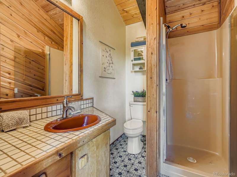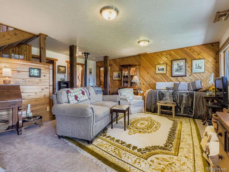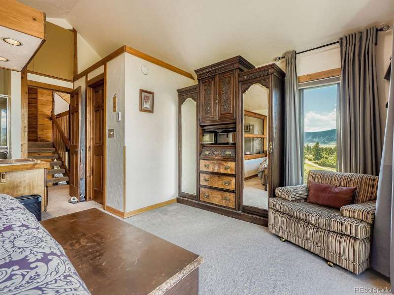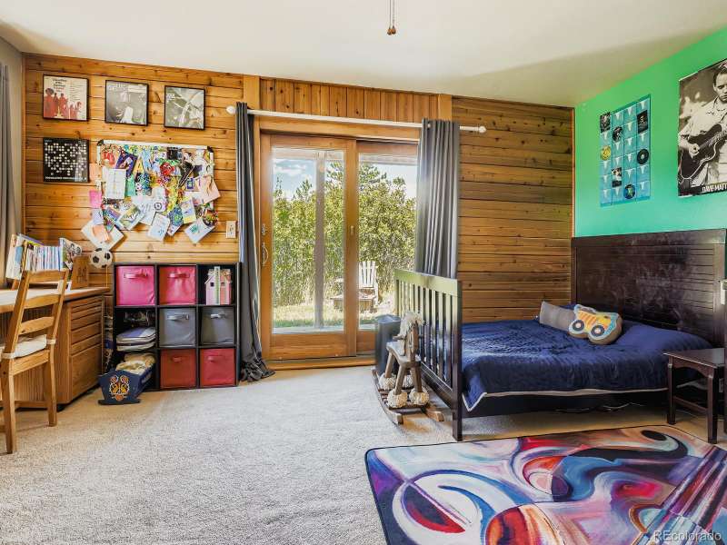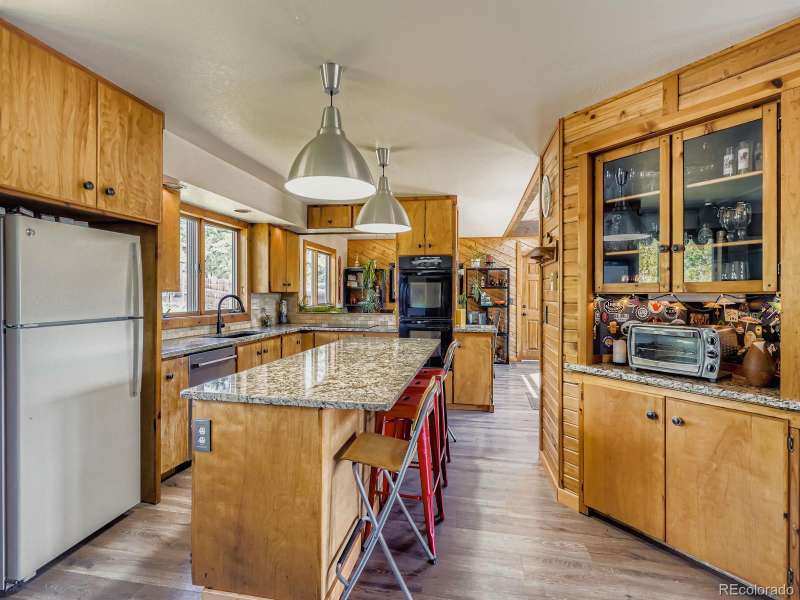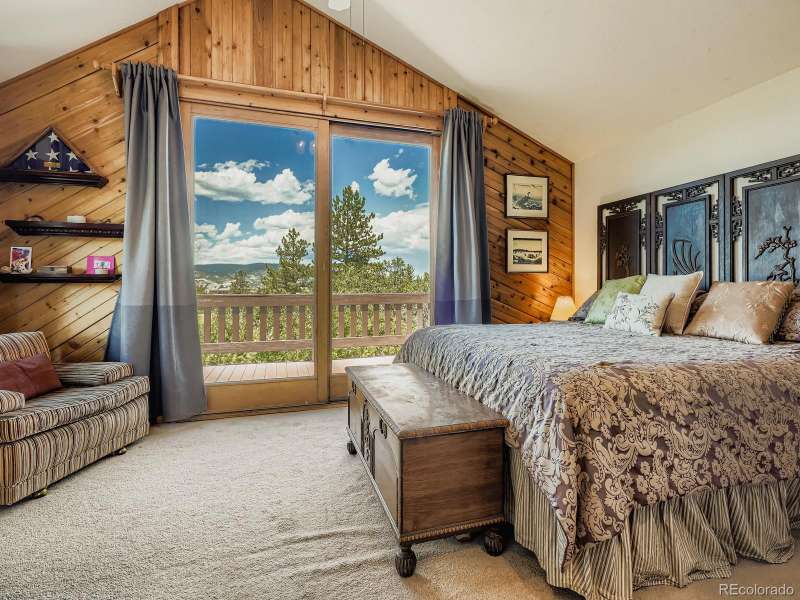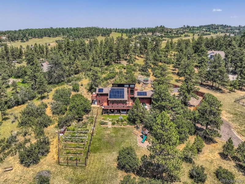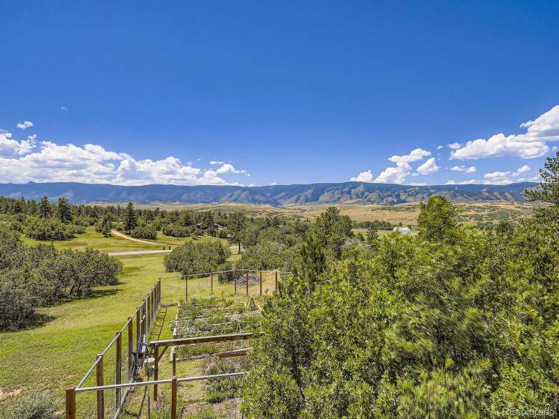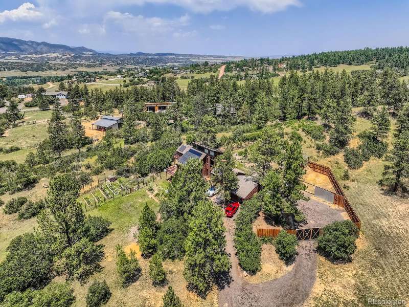 Experience the beauty of Colorado living at its finest with this unique custom mountain home, just 20 minutes from Castle Rock. Nestled on 5.3 acres, this multi-level home features 4 bedrooms, a loft, and 4 bathrooms. The open floor plan invites you into the great room, where breathtaking mountain and valley views await, complemented by a two-story stone wood fireplace and charming tongue-and-groove pine accents. The updated kitchen boasts a large granite island, double ovens, and slab granite counters. Adjacent is a spacious dining room with a convenient pass-through to the kitchen. Unwind in the primary suite, complete with a private deck perfect for morning coffee or yoga. Additional highlights include two secondary bedrooms, a versatile loft space - perfect for office or library, and a finished walk-out basement with a family room, bedroom, kitchenette, and ¾ bath. Enjoy the outdoors with fenced areas for pets, gardens, and a chicken coop which includes the chickens. An attached two-car garage and a 1085 square foot multi-use addition provide ample space for all your needs. Plus, benefit from a $70,000 solar system fully paid by the seller at closing. Embrace the peaceful mountain life - this opportunity will not last.