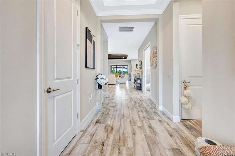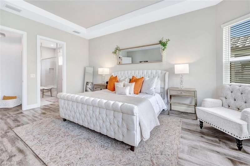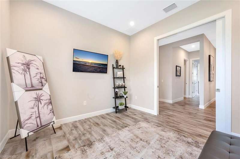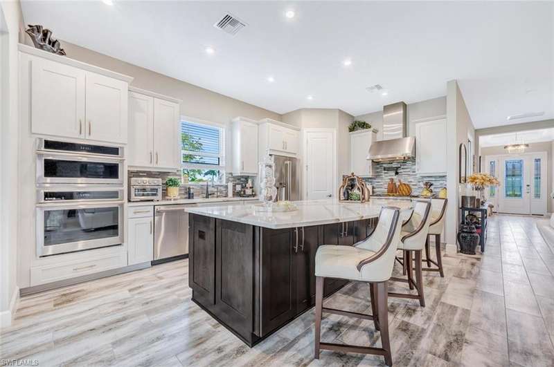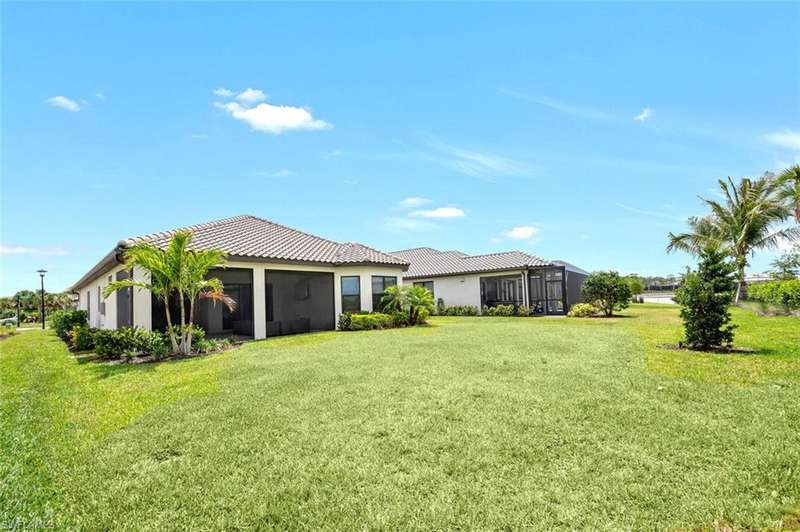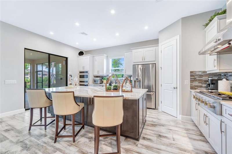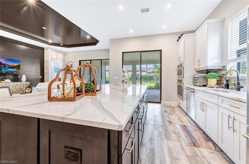 Experience unparalleled luxury in this immaculate, newly constructed residence, completed in 2022. Nestled in the prestigious Esplanade by the Islands community, this Lazio model home is replete with opulent upgrades designed to elevate your lifestyle. This exquisite property features three bedrooms, three bathrooms, and a versatile den, embodying the epitome of Florida's ultra-luxurious living. At the heart of this splendid home are a chef s dream kitchen equipped with top-of-the-line stainless steel appliances, including a six-burner gas cooktop and a built-in oven/microwave. The kitchen is adorned with upgraded cabinetry, sleek quartz countertops, sophisticated designer lighting, and a stylish backsplash. Additional cabinetry beneath the expansive island enhances functionality and style. The thoughtful floor plan boasts wood-look tile flooring throughout and is accentuated by designer lighting fixtures. The great room, enhanced with newly installed shiplap, leads to an expansive lan