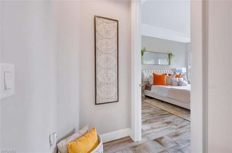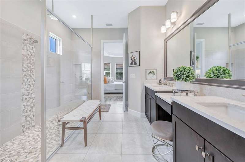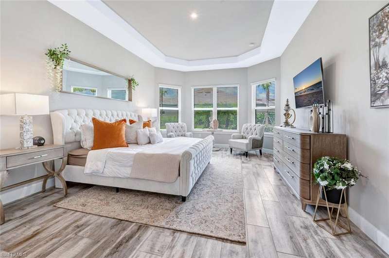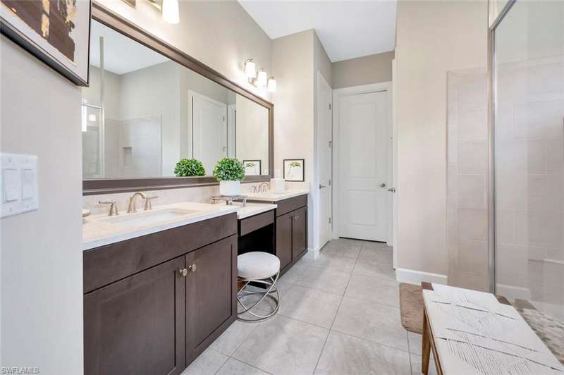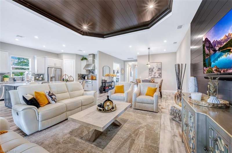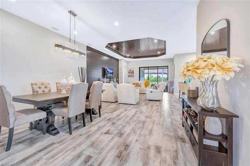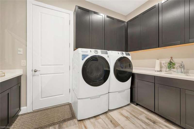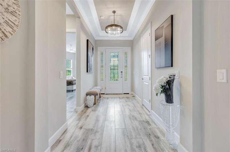 Experience unparalleled luxury in this immaculate, newly constructed residence, completed in 2022. Nestled in the prestigious Esplanade by the Islands community, this Lazio model home is replete with opulent upgrades designed to elevate your lifestyle. This exquisite property features three bedrooms, three bathrooms, and a versatile den, embodying the epitome of Florida's ultra-luxurious living. At the heart of this splendid home are a chef s dream kitchen equipped with top-of-the-line stainless steel appliances, including a six-burner gas cooktop and a built-in oven/microwave. The kitchen is adorned with upgraded cabinetry, sleek quartz countertops, sophisticated designer lighting, and a stylish backsplash. Additional cabinetry beneath the expansive island enhances functionality and style. The thoughtful floor plan boasts wood-look tile flooring throughout and is accentuated by designer lighting fixtures. The great room, enhanced with newly installed shiplap, leads to an expansive lan