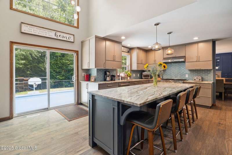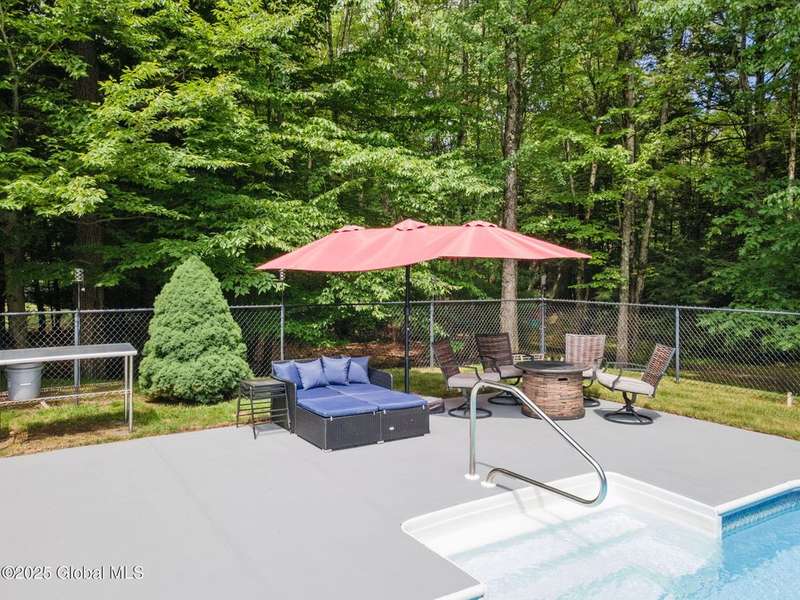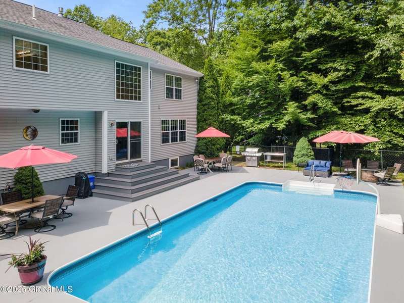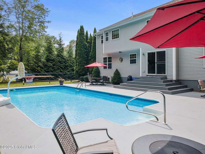 5 bedrooms, in-law suite, in-ground pool, and newer kitchen with expanded island, stone countertops, new bar, and high-end cabinets welcome you to this spacious customized home in a desirable neighborhood with low Wilton taxes in Saratoga schools. It's everything you've been waiting for! Inside there's 4 full bathrooms, and a total of over 4500 square feet of living space. Outside is the very private back yard with trees, landscaping and a privacy fence surrounding a pool (heated), bocce court, play set, and storage sheds. Low traffic on the cul de sac is a big plus. Additional features include new built-ins in the dining room, central vacuum, a well just for the in-ground sprinklers, and gas fireplace.