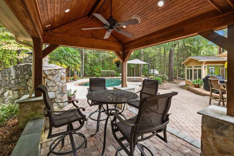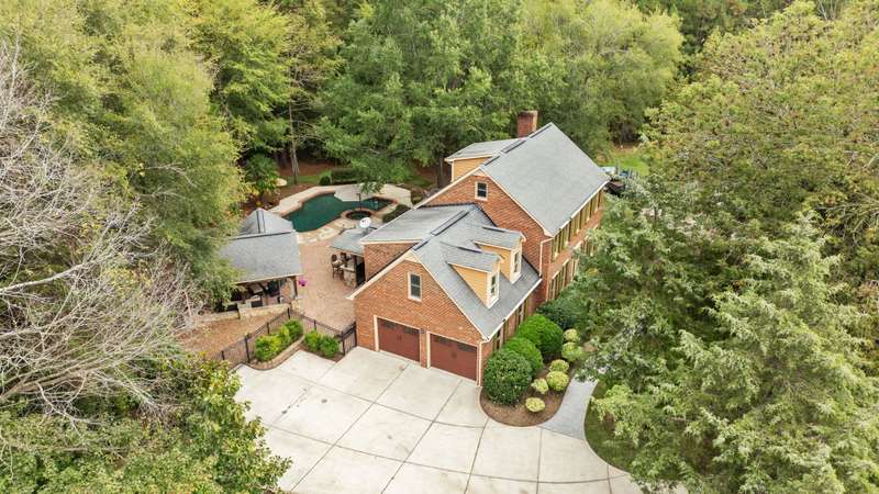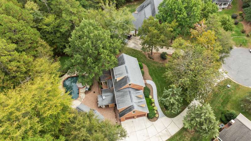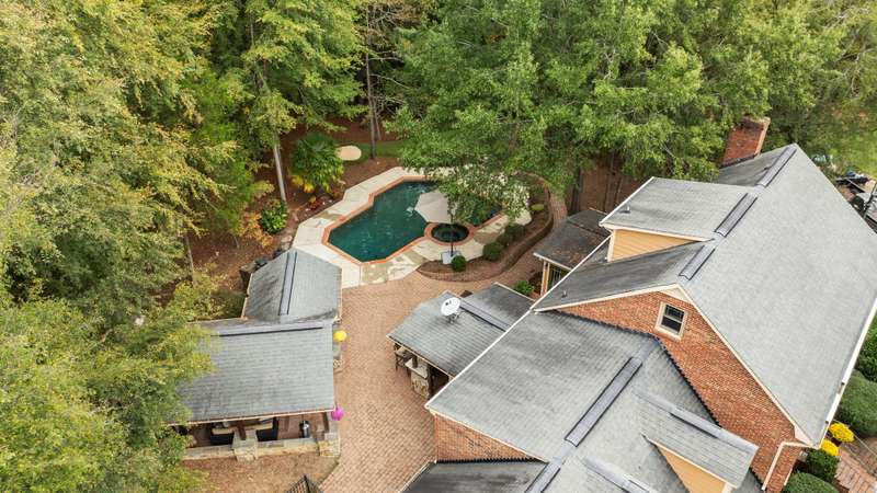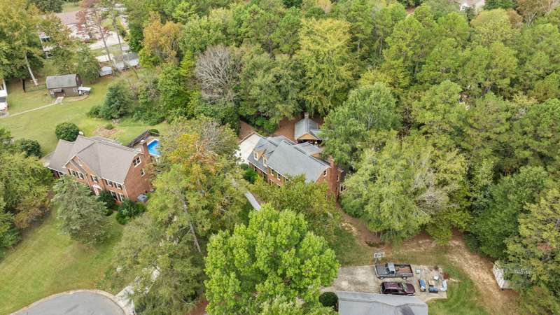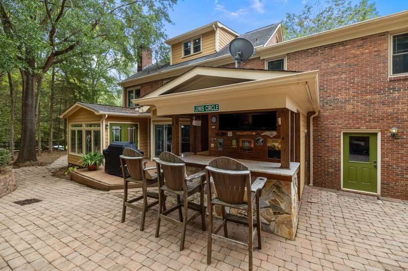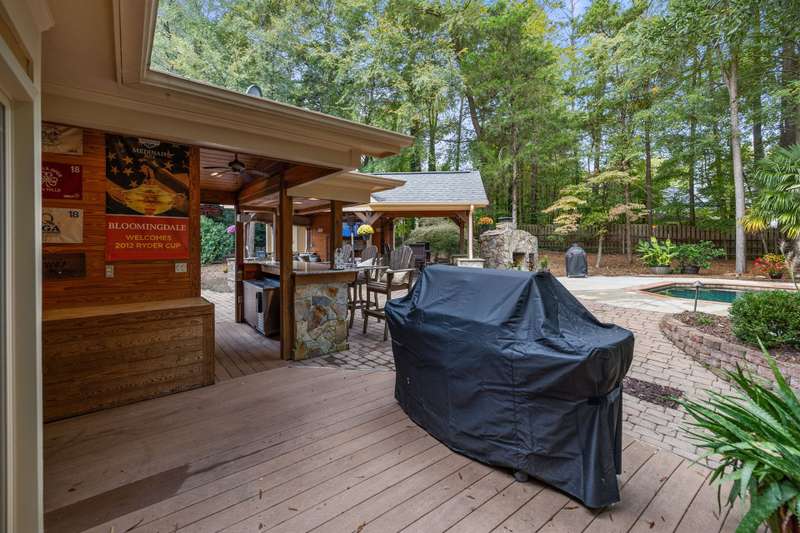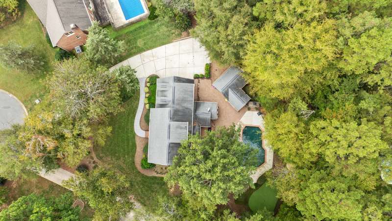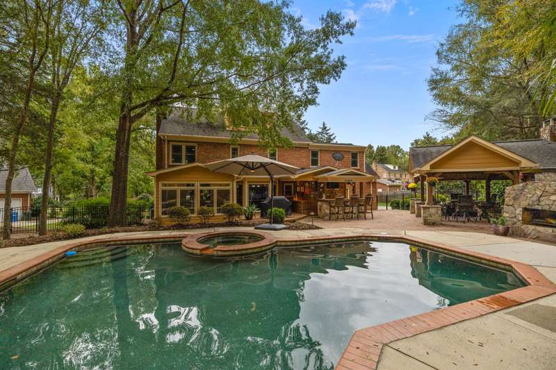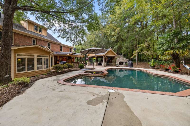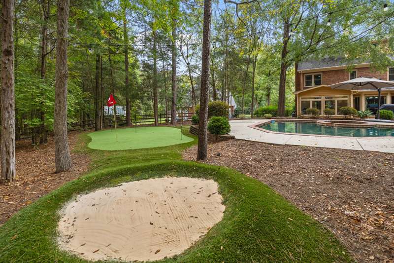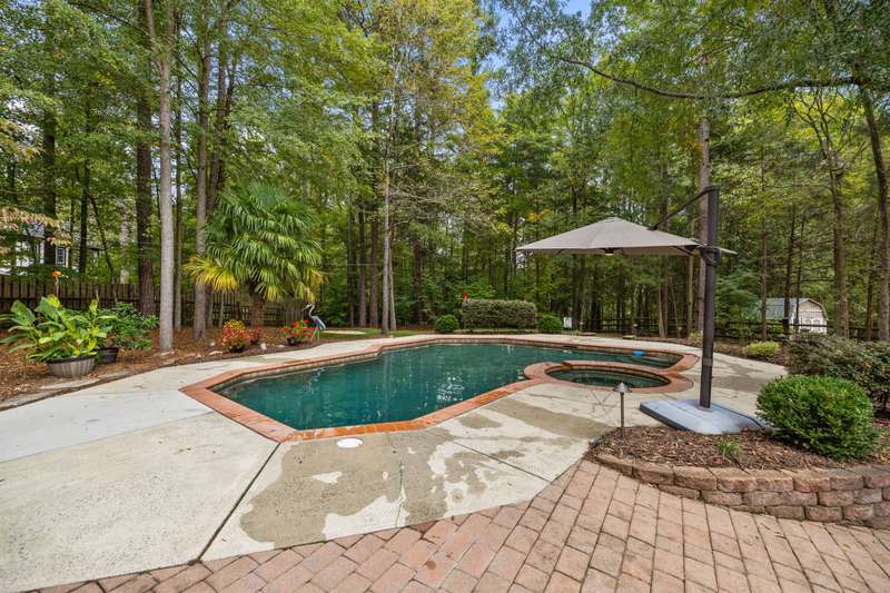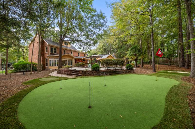 Beautiful full-brick custom home in popular Ashe Plantation! Who needs a vacation when you can enjoy resort-style living year-round? Nestled on over a half-acre cul-de-sac wooded lot, this 4-bedroom, 3.5-bath home offers privacy, space, and exceptional outdoor living. Relax by your private heated Pebbletec in-ground pool and spa, practice your short game on the built-in putting green, or unwind by one of two custom stone fireplaces in the outdoor living and dining areas. Watch the game from the outdoor bar and entertain with ease!Inside, site-finished hardwood floors flow throughout the main living areas, complemented by fresh paint and elegant finishes. The spacious formal dining room is perfect for gatherings, while the large living room with a gas log fireplace offers comfort and versatility. A bright 4 seasons sunroom overlooks the pool, blending indoor and outdoor living beautifully.The kitchen features rich stained cabinetry, granite countertops, and stainless steel appliances. The primary suite includes an updated bath and a walk-in closet. A generous bonus room is ideal for movie nights or play, while the third level provides a private retreat for guests or teens with its own bedroom, full bath, and bonus/flex space.Enjoy the fenced backyard, oversized driveway, storage shed and beautifully landscaped grounds designed for both entertaining and everyday enjoyment. Also! new windows 2023, new 2nd and 3rd level LVP flooring 2023, Exterior paint 2023, Interior paint 2025,