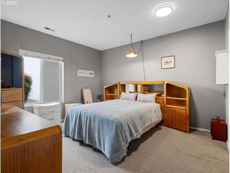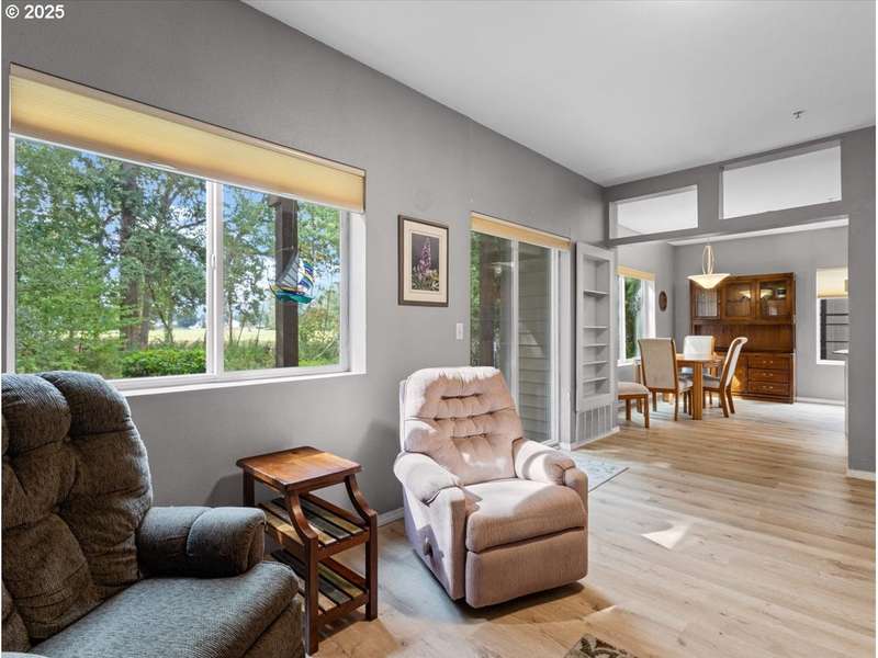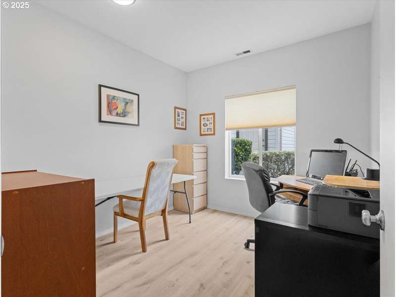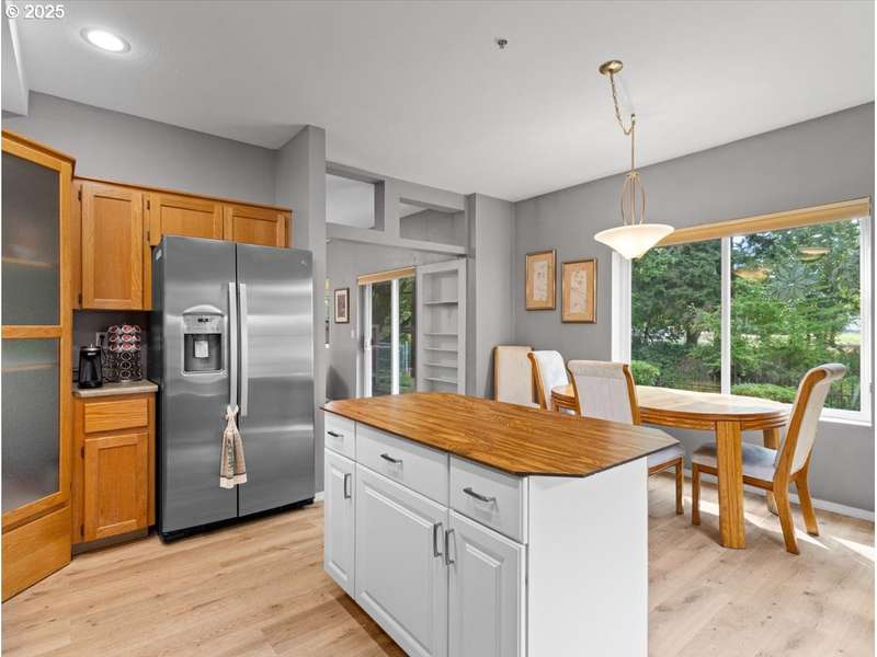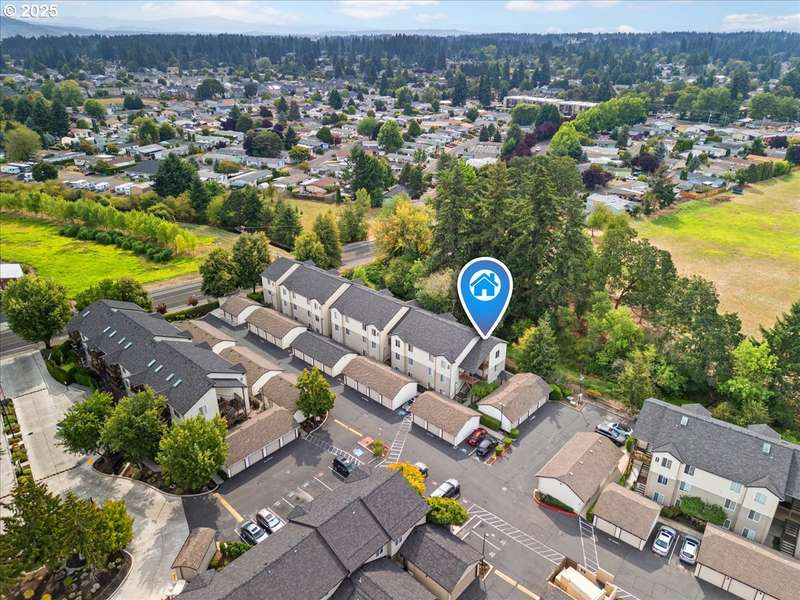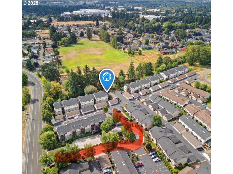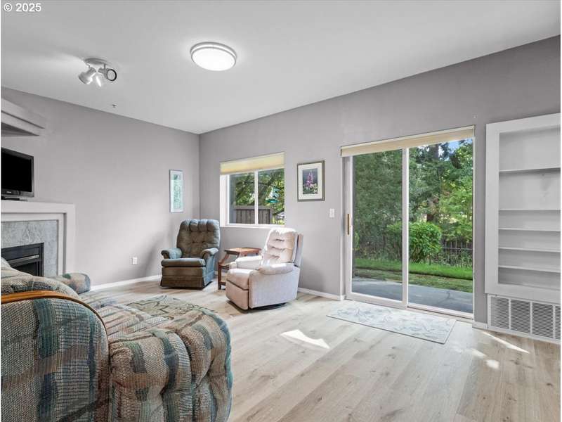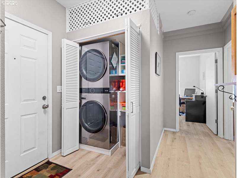 Gated Community (gates lock at night) with secure mailbox building, accessed with key fob. Amazon Hub lockers on site (locked package delivery facility; your packages aren't left on your porch!). Lovely generous sized 2 bd/2 ba one-level condo (end unit means additional windows, approx 200 sf larger than most, one of the largest single-level NO STEP condos). Really nice - even a kitchen island and pantry! This seller left no space unused - built-ins or shelving inside closets, former corner art niche is enclosed now for extra room, even the typical laundry closet has been transformed with stackable full-sized laundry plus a ton of storage! Seller has had a number of updates including a beautiful walk-in tile shower in the primary bedroom (there are also 2 closets in the primary). The following have been replaced recently: Garage Door Opener 2 months; Refrig 1+ yrs; Water heater 2-3 yrs; Washer/Dryer 2-3 yrs; Dishwasher 3-4 yrs; Range 5+ yrs. NO STEPS TO UNIT, NO STEPS INSIDE. Back patio view of peaceful green space - watch the hawks play and listen to the ducks chatter in the seasonal creek.