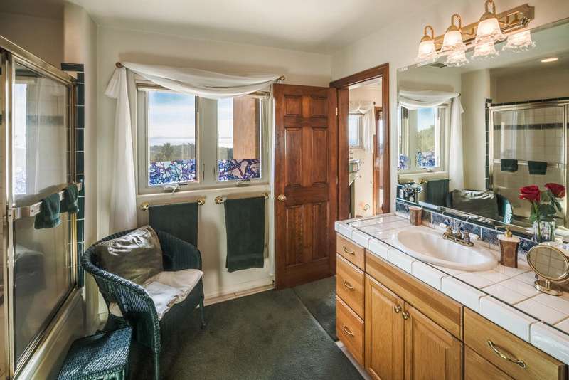 A custom mahogany entry door with leaded glass, transom, and side lights welcomes you into a tiled foyer adorned with intricate inlaid designs. Arched passages lead to a bright living room with high ceilings, its French doors framing mesmerizing ocean and island views. The adjacent family room invites gatherings around a two-sided fireplace, shared with the formal dining room, which boasts breathtaking harbor views and French doors opening onto a wraparound patio and lawn. Natural maple cabinetry, granite tile counters, and new appliances grace the light-filled kitchen, where you can take in ocean, city, and mountain vistas from the sink window. Completing the main level is a flexible fourth bedroom with exterior access, a stylishly tiled hall bath, and a spacious laundry room with ample storage and a tub sink.