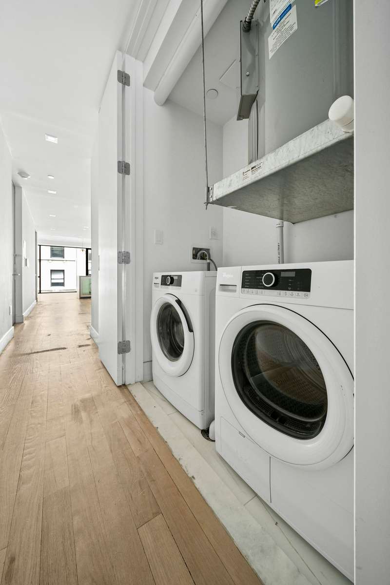 There are a total of 1.5 bathrooms. The main bathroom is a full bathroom with the luxurious elements of having heated floors and a built in heated towel rack. This room is designed with elegant contemporary choices, including white double sinks and marble floors and similar style porcelain tiles. There is also a similarly fashioned separate powder room.