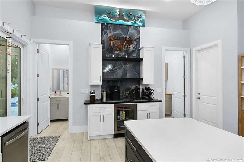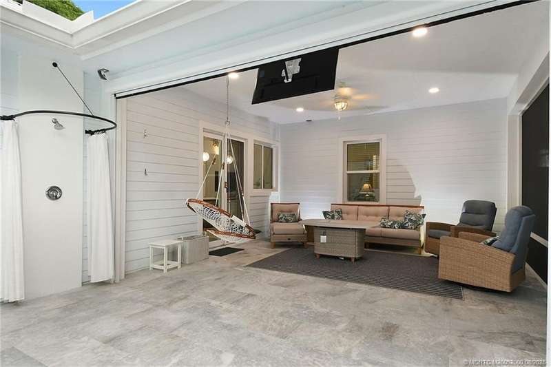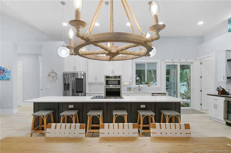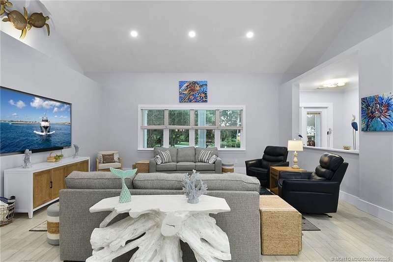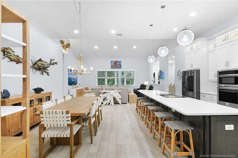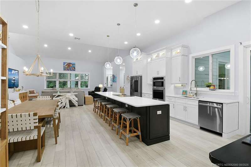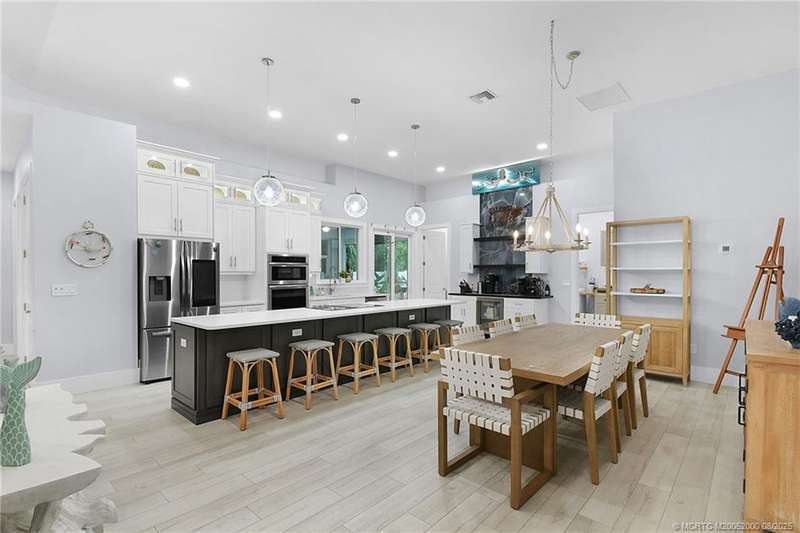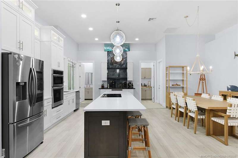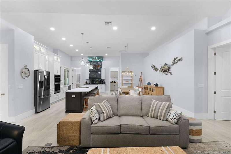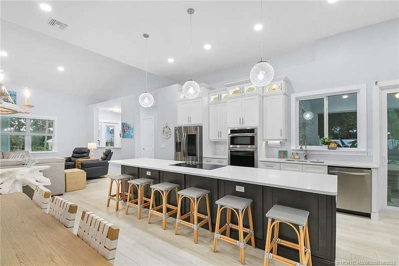 Step inside this Key West–style, custom-built concrete block home, complete with a full-length front porch and timeless curb appeal. This 3-bedroom, 2.5-bath home sits on a half-acre lot and is built with quality in mind, featuring soaring 12-foot ceilings, 9-foot doors, and luxury plank flooring throughout, spray foam insulation and impact glass. The chef’s kitchen showcases white shaker cabinetry, an expansive island, coffee bar, and quartz countertops—perfect for both entertaining and everyday living. The primary suite is a true retreat with oversized walk-in closets, a sauna, and an impressive spa-style shower. Step outside to a screened-in porch with retractable screen overlooking a brand-new saltwater pool and spa. The outdoor living area includes a full summer kitchen with pizza oven, bar, outdoor shower, and lush professional landscaping—creating a serene, private oasis. With room to store your boat or RV, residents also enjoy access to a private day dock with fishing pier.