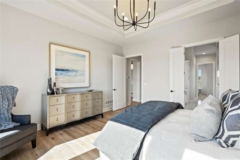 Welcome to the Del Mar Reverse—a show-stopping model in Bristol Highlands Estates showcasing top-tier design, layout, and craftsmanship. This reverse 1.5-story plan features a finished daylight basement and a thoughtfully designed stucco and stone exterior with custom landscaping, pavers, and a fountain that sets the tone from the curb. Step through double doors to an open main level with hardwood floors, high ceilings, and elegant finishes. The home offers 4 bedrooms and 3 bathrooms, including a luxurious main-floor owner’s suite with spa-inspired details. A second bedroom or office and a full guest bath are also on the main level. Step outside to enjoy two elevated decks—a large covered deck with vaulted ceiling, and a grill deck just off the kitchen with stairs leading to the lower patio with built-in fire pit. Downstairs, the finished daylight basement includes 2 additional bedrooms, a full bath, a spacious rec room with built-ins plus a basement bar with island, sink, and beverage fridge—perfect for entertaining. There's also a bonus room for wine storage or hobbies. Bristol Highlands is surrounded by the rolling hills of Shawnee with breathtaking views that feel like you're in the country and just 3 minutes from grocery, shopping, an array of restaurants, parks, trails and easy highway access within the award-winning De Soto Schools. This model, located on Lot 14, perfectly represents the style and elegance of J.S. Robinson Fine Homes in the Kansas City area. THIS HOME IS A MODEL - NOT FOR SALE