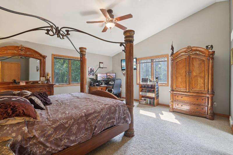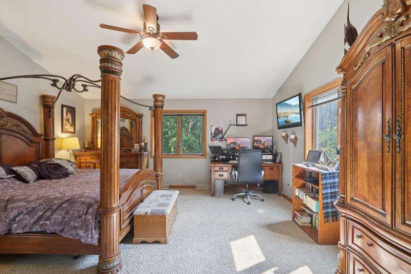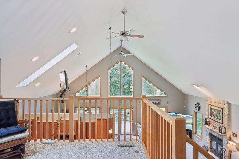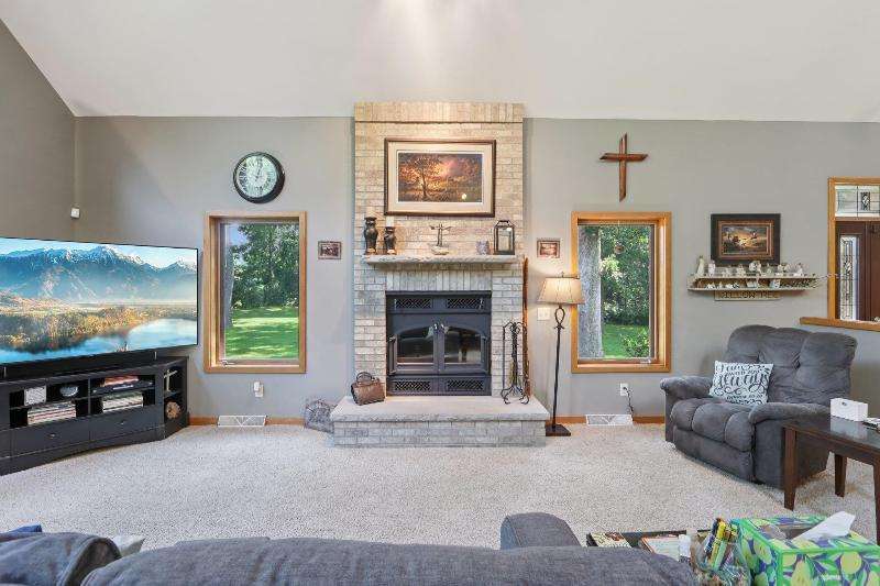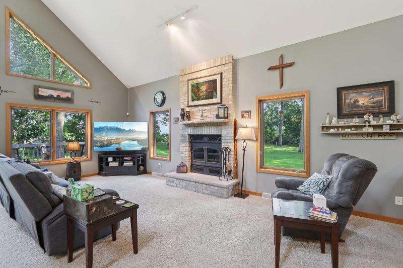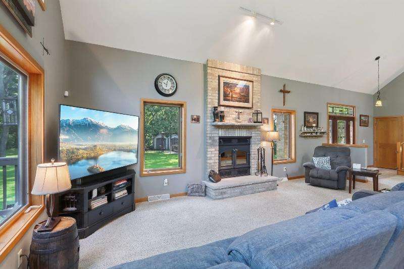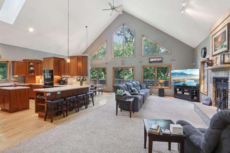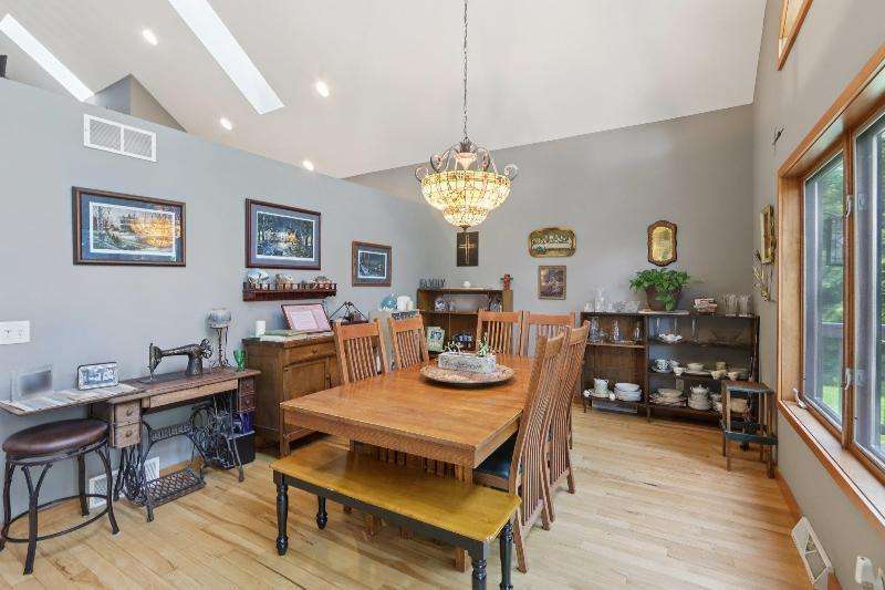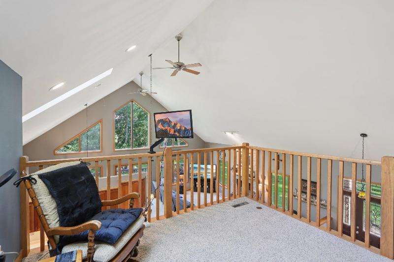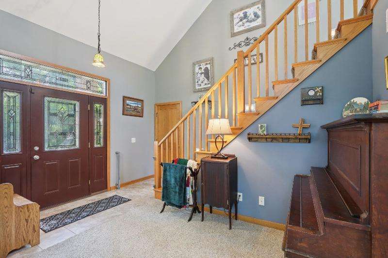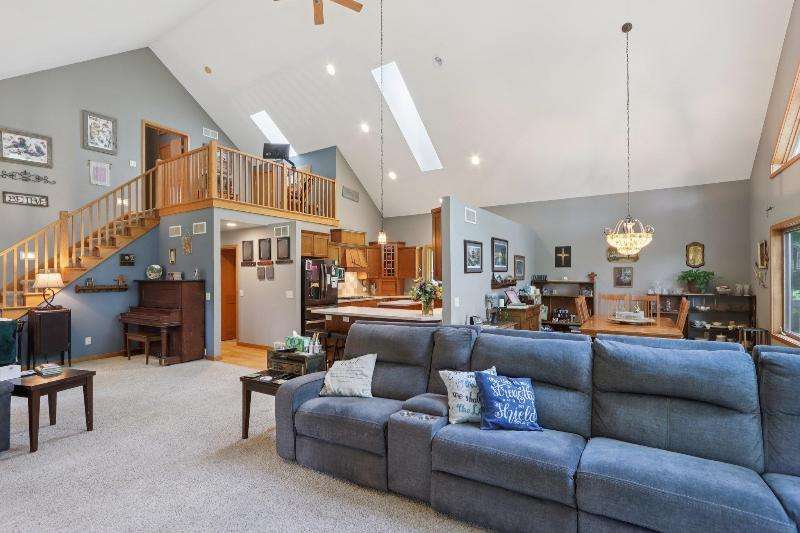 Stunning country home that offers the best of 2 worlds: wooded, rural privacy & minutes from shopping, dining & major routes. Nestled on 2.44 acres, this A-frame-inspired home is flooded with natural light thanks to its 20ft vaulted ceiling, soaring wall of windows & multiple skylights. Inside, you'll find generously sized rooms including a private second-level primary suite. The newly finished lower level adds even more living space, featuring a 4th bedroom, full bath & flexible areas for a home office or recreation. Outdoor lovers will love the perimeter trail through your own woods! The lovely deck for relaxation & a firepit perfect for stargazing. Huge heated garage for the hobbyist w/ bonus RV parking/hookups outside. Leaf guards on gutters too. Quick close possible.