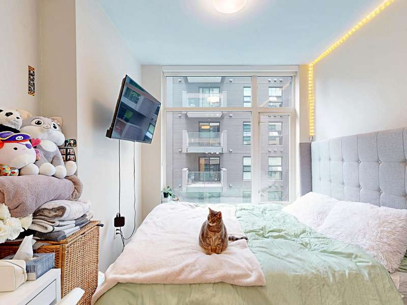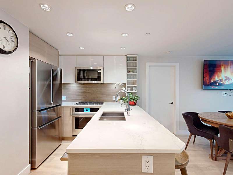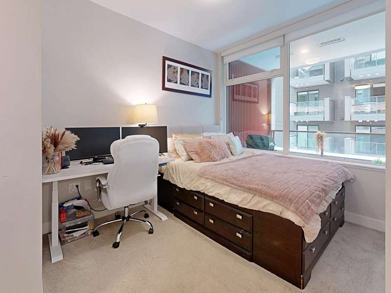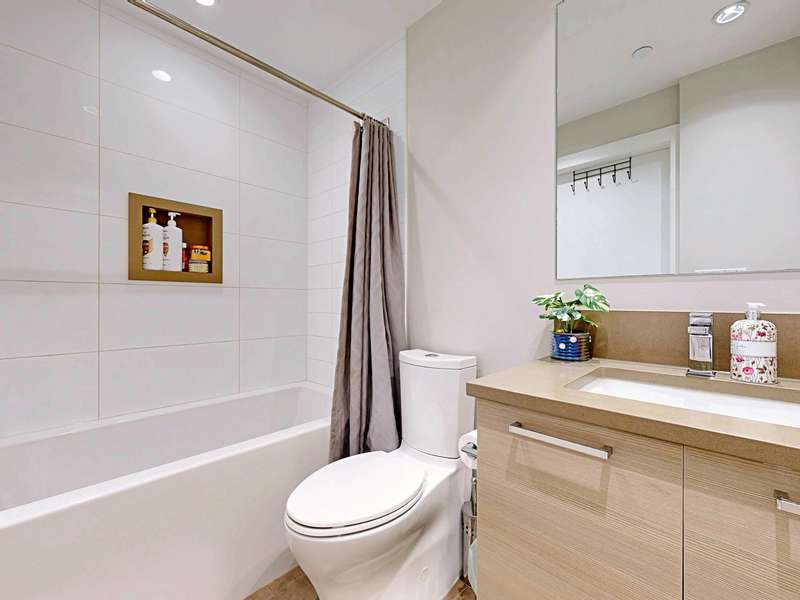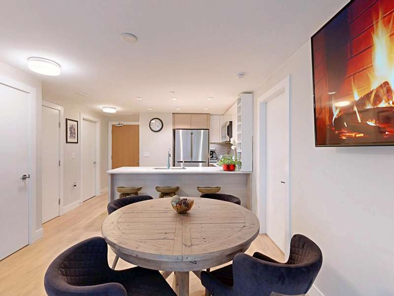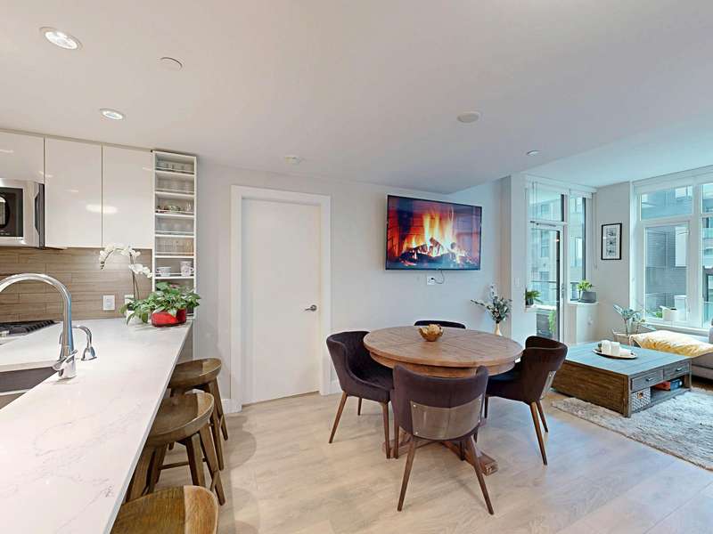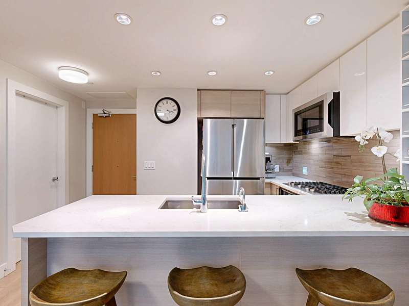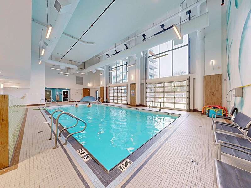 Quartet at River District. A CONCRETE 2 bed 2 bath, 5 year old, 868 square foot Condo available for a great price. Air Conditioning through your own heating and cooling pump is included with this unit and is covered in the monthly maintenance fee. This unit is in great condition and comes with wide plank flooring, quartz countertops, stainless appliances and a gas range. A great size kitchen and open layout leads you to the spacious patio, a great place to entertain. Great separation comes from large bedrooms on opposite sides of the unit, each with their own ensuite bathrooms. The primary bedroom comes with a large walk-in closet and gorgeous bathroom. You have access to a fantastic exercise facility with pool, hot tub, sauna, gym, squash courts.