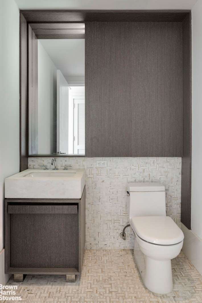 The primary bathroom exudes luxury with stunning White Sivec marble floors and walls, paired with Watermark fixtures for an elevated experience. Oversized mirrors with integrated lighting, a double-sink vanity with ample storage, and recessed medicine cabinets add to the bathroom's elegance and functionality. The secondary bathrooms are equally refined, featuring an artful mix of imported porcelain tiles that create a sophisticated, timeless look.