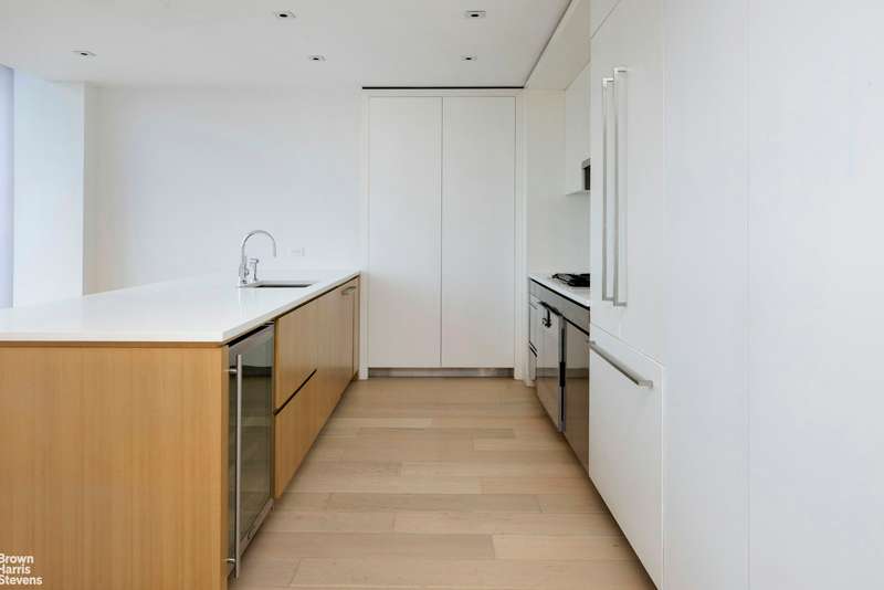 The sleek, chef-inspired kitchen is a true standout, showcasing custom-built satin lacquer cabinetry, stainless steel storage below, and top-of-the-line Gaggenau appliances. The striking kitchen island, crafted from Anegre wood and topped with Pure White Caesarstone, offers both form and function, making it the ideal space for cooking and entertaining.