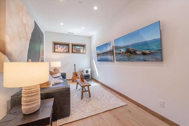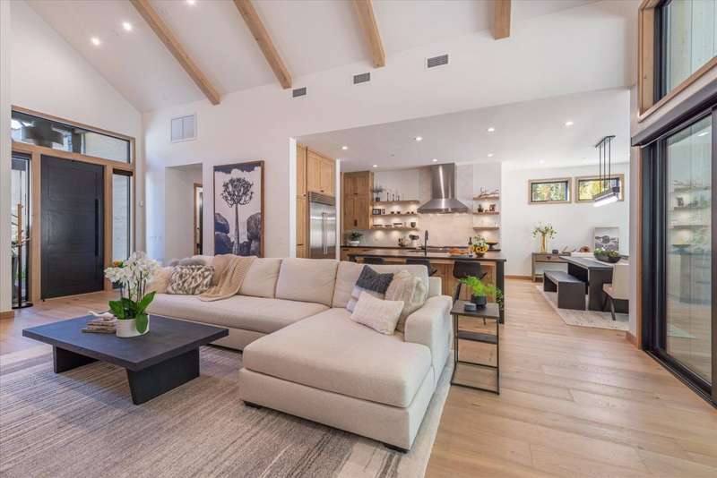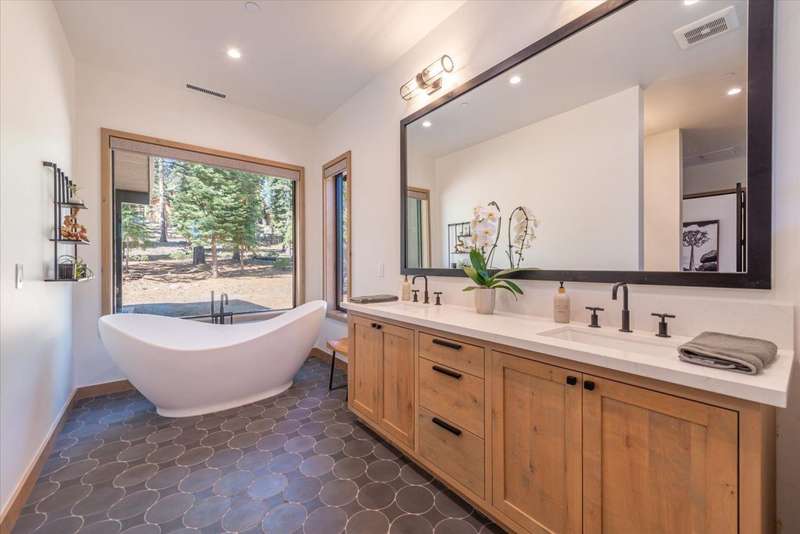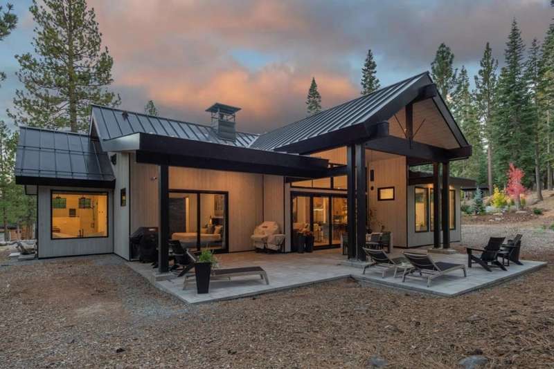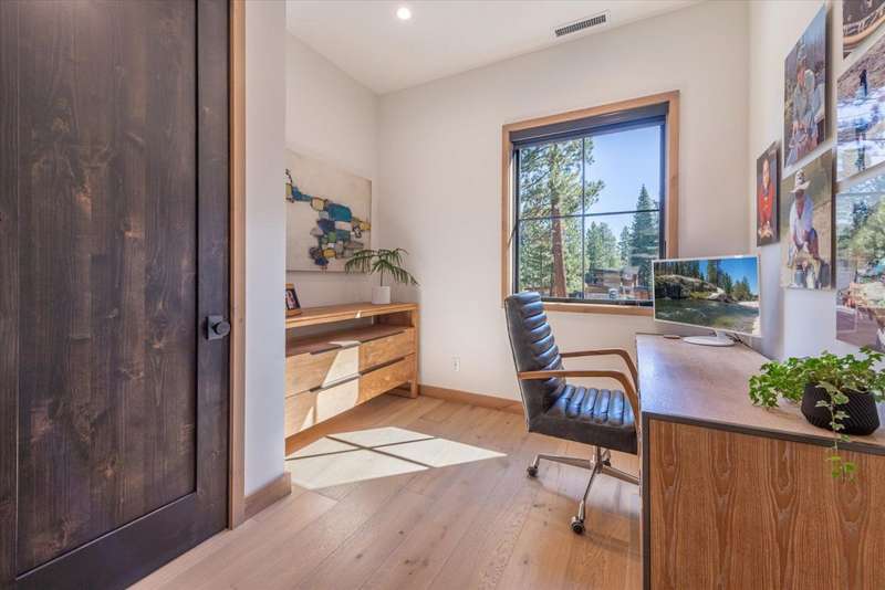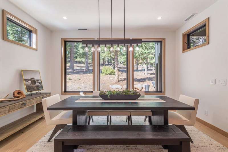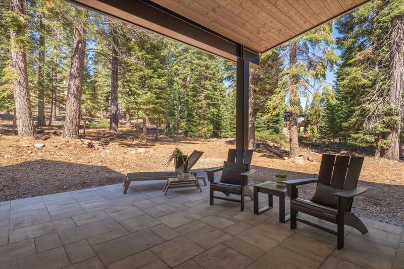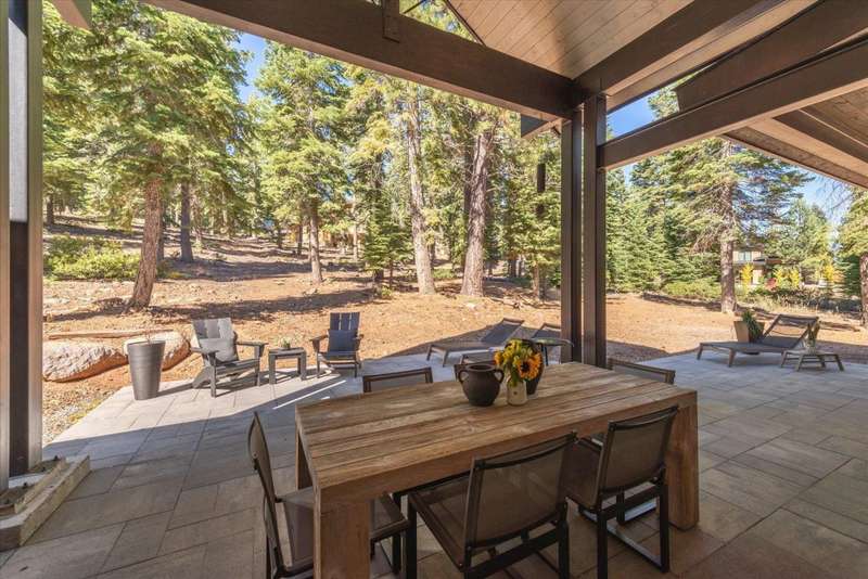 Nestled within the coveted Schaffer's Mill luxury community, 9087 Horned Lark Court blends custom craftsmanship with timeless architectural appeal. This RARE, single-level retreat blends mountain modern design with thoughtful livability, creating an inviting sanctuary amidst a private forest setting. The stunning great room showcases soaring ceilings, exposed beams and floor-to-ceiling windows that frame tranquil wooded views. Anchored by a contemporary gas fireplace, this spacious gathering area exudes warmth and mountain sophistication. The chef's kitchen complements the space beautifully, featuring a farmhouse-inspired design with a large center island, high-end appliances, open shelving, abundant cabinetry, and a walk-in pantry. The adjacent dining area is bathed in natural light - ideal for intimate meals with nature as your backdrop. During the summer months, dine al fresco beneath the expansive covered patio, then gather as alpenglow fades into starlight. An executive office, located off the great room, offers both function and style, highlighted by built-in cabinetry and serene front-yard views - perfect for remote workdays in the mountains. Movie or game nights come alive in the comfortable family room, complete with an adjacent and custom designed wet bar, mudroom and laundry area for everyday ease. Privately situated in its own wing, the primary suite is a peaceful retreat with patio access, a cozy gas fireplace, and a spa-inspired ensuite featuring a soaking tub, spacious shower, dual vanities, custom walk-in closet plus a makeup vanity. On the opposite side, two ensuite guest bedrooms offer comfort and privacy for family and friends. A true rarity, the 1,350+ sq. ft. garage delivers incredible functionality with epoxy flooring, built-in storage, and room for cars, sleds, an RV, boat, skis, bikes, and more - perfect for your Tahoe adventures! With distinctive curb appeal, abundant outdoor living and exceptional design quality, this home captures the essence of luxury mountain living in Truckee's coveted Martis Valley. Experience the vibrant, welcoming spirit of Schaffer's Mill - a place where refined style meets relaxed mountain life. Welcome home!