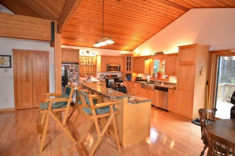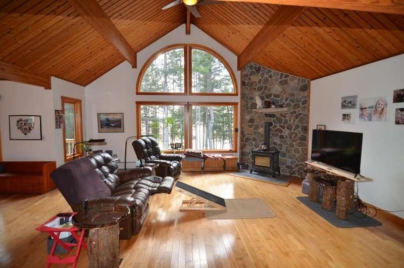 This waterfront oasis is a beautiful home that sits on 2.33 acres with 243 feet on Bog Lake and a private dock. Enjoy beautiful sunsets from your living room, kitchen, expansive deck or the private deck off the primary bedroom. This home boasts a 3 car heated garage (radiant heat), automatic generator and a finished upstairs with full bathroom and beautiful wood floors. This space can be used as an office, guests space, game room and more. This home also features beautiful wood beams, wood and tile floors, open concept living space, along with main floor primary bedroom and bathroom, primary bathroom features a spa shower, walk in closet and private 7 x 14 deck, kitchen and laundry. The basement features 2 bedrooms, 1 bathroom, ample storage, utility room and an endless pool that features 3 water depths for different types of water activities. All of the rock walls in the home feature stones from local blueberry fields. Home has a 300ft by 8ft L shaped paved driveway and the main deck is 7x11/11x15. Homeowners on Bog Lake also have access to a private boat ramp on Fulton Lake. Bog Lake is stocked with Salmon and Brook Trout. Bass, Pickerel and White Perch are active natural fish. This lake does not allow jet skis. Fulton Lake is limited to 10 horsepower and does not allow jet skis.
