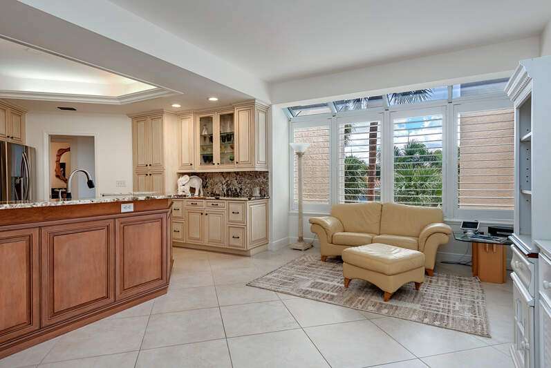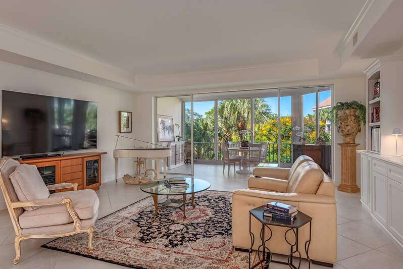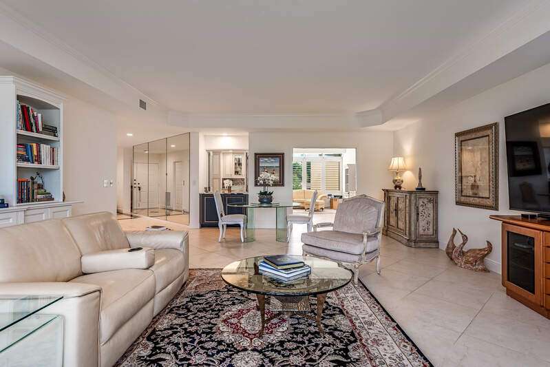 Steeped with natural light and beautifully updated throughout, this 2-Bedroom + Den/Flex, 2.5-Bath residence is perfectly situated within The Crescent at Pelican Bay, one of Naples' most sought-after communities. A bright, open-concept layout create an inviting atmosphere with gorgeous views from each room. Porcelain tile flooring throughout flows seamlessly through the spacious living areas, connecting effortlessly to an enclosed lanai-expanding the living space and providing the perfect setting for entertaining or enjoying the lush tropical surroundings and vibrant southwestern sunsets. The thoughtful split-bedroom floor plan ensures privacy for both owners and guests. The owner's suite offers a luxurious retreat with a large walk-in closet, additional linen storage, and a spa-inspired bathroom with a walk-in shower and separate soaking tub. The guest suite is equally impressive, featuring its own private bath, walk-in closet, balcony, and storm protection. A conveniently located powder room serves visitors with ease. Just off the kitchen, a versatile den provides flexible space for a home office or can be converted into a third bedroom if desired. The kitchen is a standout, showcasing Level 5 granite countertops, custom cabinetry, premium appliances, and full-height cabinets for ample storage and a polished, contemporary look. Additional highlights include 9-foot ceilings, impact-resistant sliders, storm shutters, abundant natural light, and a rare oversized two-car garage located only steps from the elevator, complete with epoxy flooring, a dehumidifier, and a cedar-lined storage closet. With only two residences per floor, the property offers exceptional privacy and a boutique atmosphere. Elevated 12 feet above sea level and never impacted by storm surge, this home offers both elegance and peace of mind. As a resident of Pelican Bay, you'll enjoy exclusive access to all its premier amenities, including 2 PRIVATE BEACHFRONT restaurants/bars, attended beach service, kayaks, paddle boards, 18 Har-Tru tennis courts, fitness center, pickleball coming soon, and scenic nature trails for walking and biking. Perfectly situated near Artis Naples, Waterside Shops, and Mercato, this residence provides unparalleled convenience to world-class shopping, dining, and entertainment options.