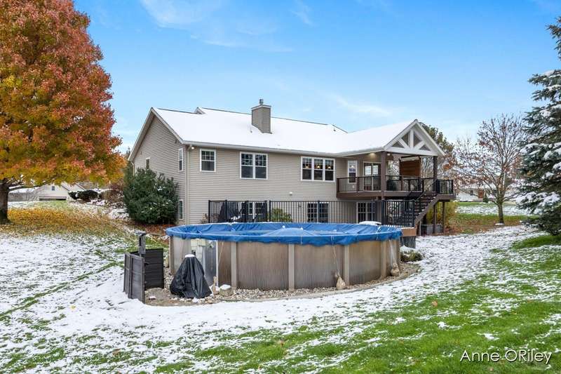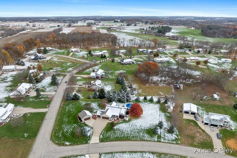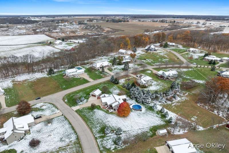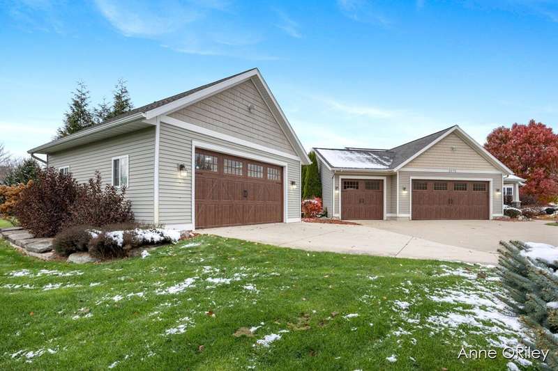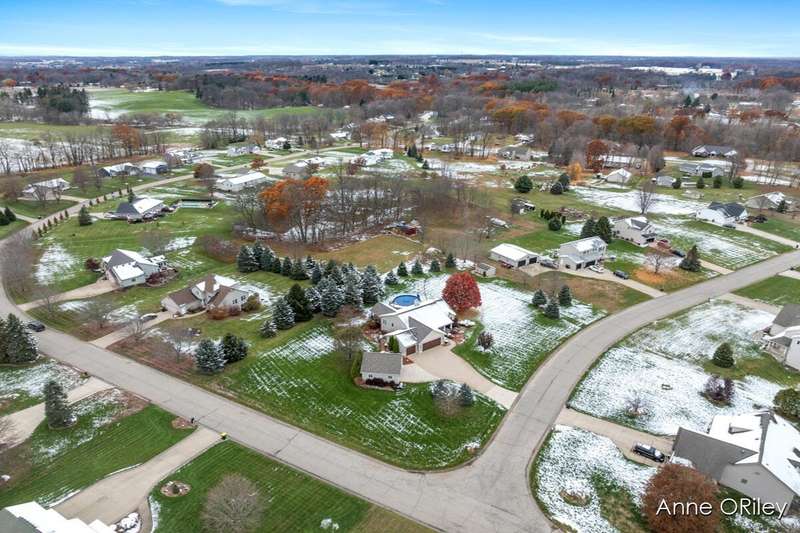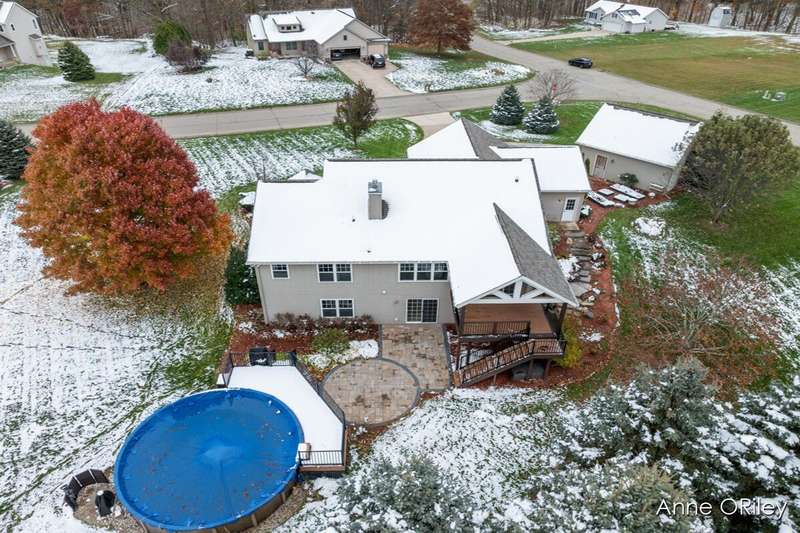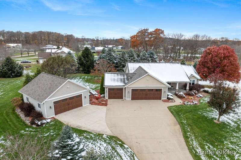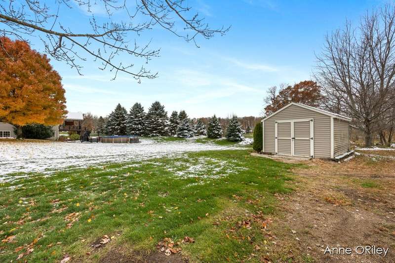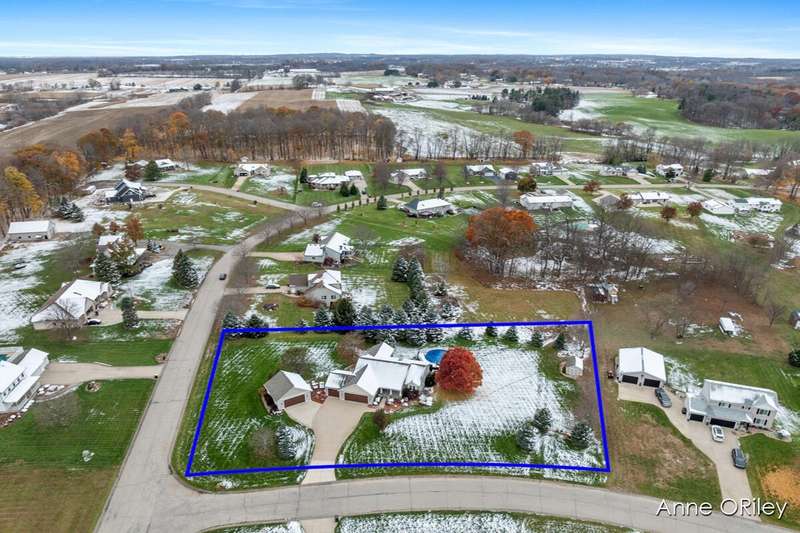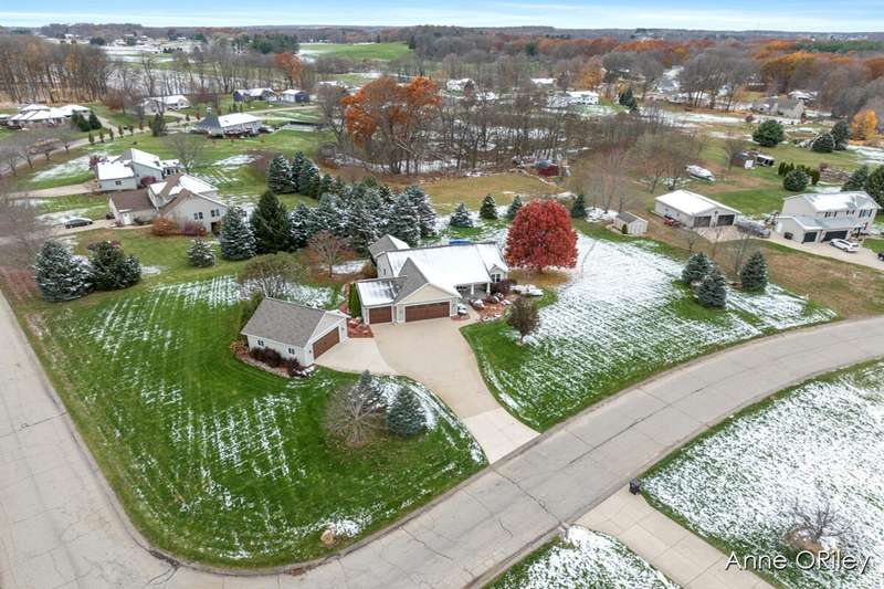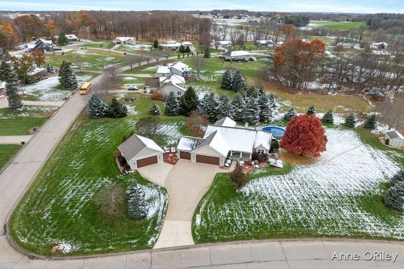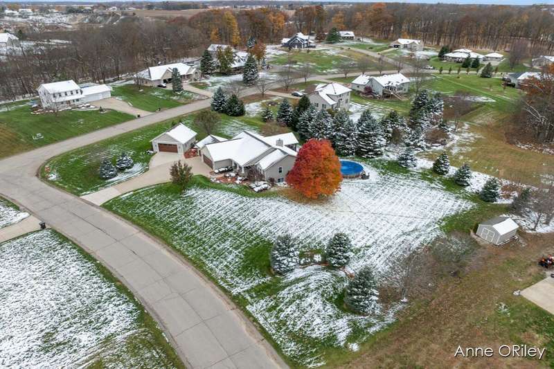 Welcome home to this meticulously maintained ranch, offering 2,638 finished SQFT of custom living on a prime 1.16-acre corner lot. This home perfectly balances everyday convenience with exceptional entertainment features. The open-concept main floor centers around a spacious kitchen boasting stainless steel appliances, granite countertops, and a large center island with a snack bar. The adjoining living room invites relaxation with a cozy gas fireplace flanked by custom built-in shelving. The main level also provides unmatched convenience, featuring a Primary Suite with full bath and walk-in closet, a second bedroom, a dedicated desk area, second full bath and a half, and a main-floor laundry room. The living space extends to the fully finished walk-out basement, complete with a large family room with surround sound, two additional bedrooms, a full bath, and a utility room that doubles as a home gym. Step outside to your outdoor paradise! The beautifully landscaped grounds include a covered deck and a custom brick patio perfect for entertaining, a vibrant flower garden, and an above-ground pool for summer enjoyment, kept pristine by underground sprinkling. For the hobbyist or car enthusiast, this property is unmatched: it features a three-car garage with an EV charger hook-up (and wired for a second!) and a heated pole building/workshop perfect for two extra vehicles or dedicated storage. This stunning, updated home is truly a must-see! Located in desirable Boulder Creek Estates and close to downtown Middleville, Thornapple River Trail, Yankee Springs, and TK Schools. MULTIPLE OFFERS RECIEVED, DEADLINE IS SET FOR 11/14/25 AT 8PM.