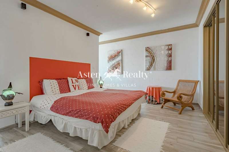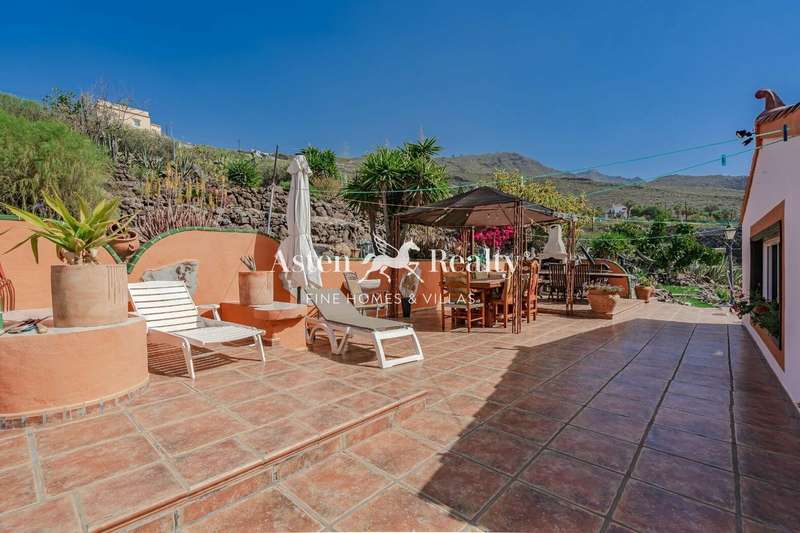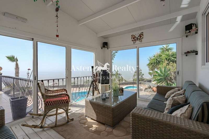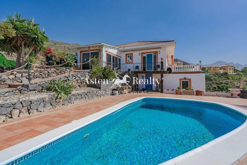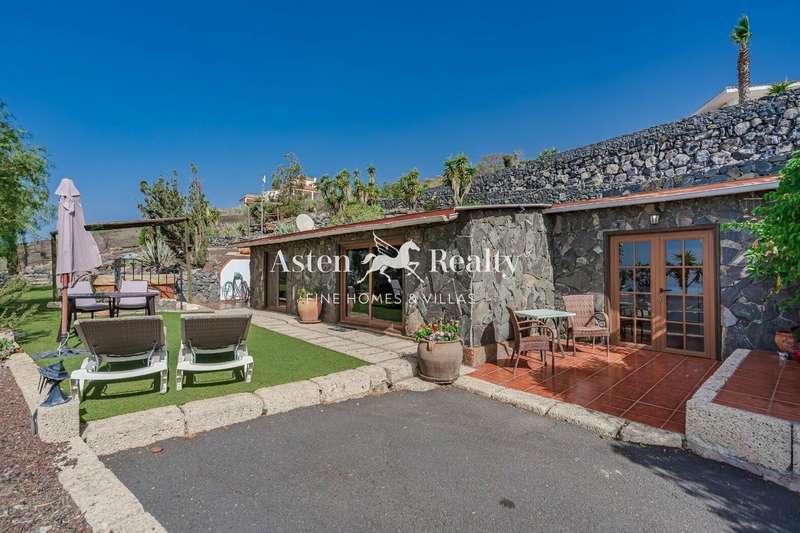 Discover the privilege of living in this spectacular detached villa in the sought after area of Las Moraditas, Adeje! Built in 1998 and west facing, this jewel offers the best sea views and sunsets, creating a paradise of tranquillity and connection with nature. The property, set in a fenced plot of 5.000 m2 with lush gardens and a swimming pool, consists of two registered properties.