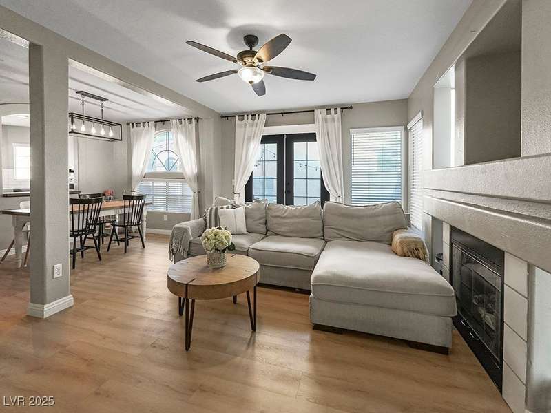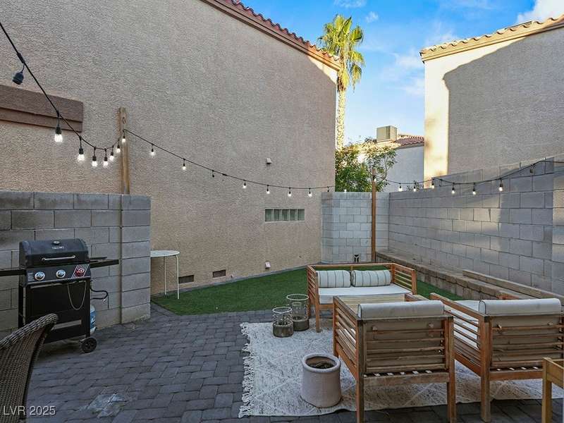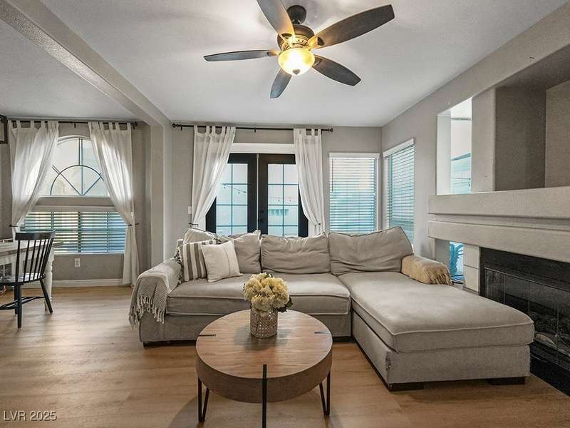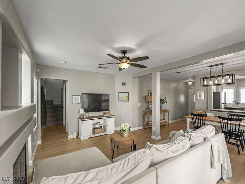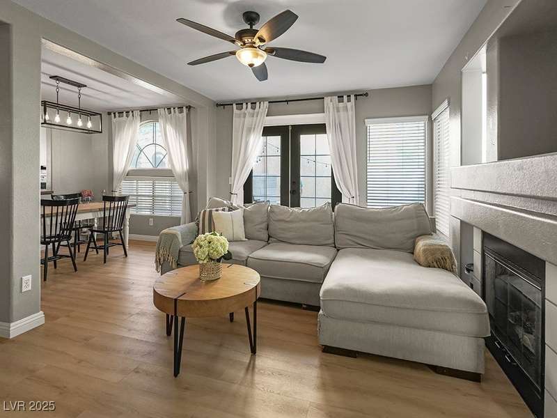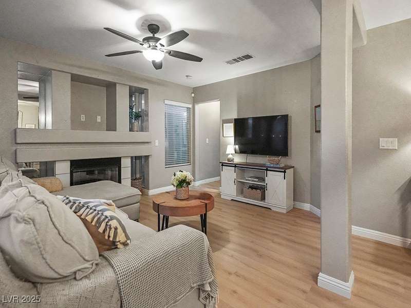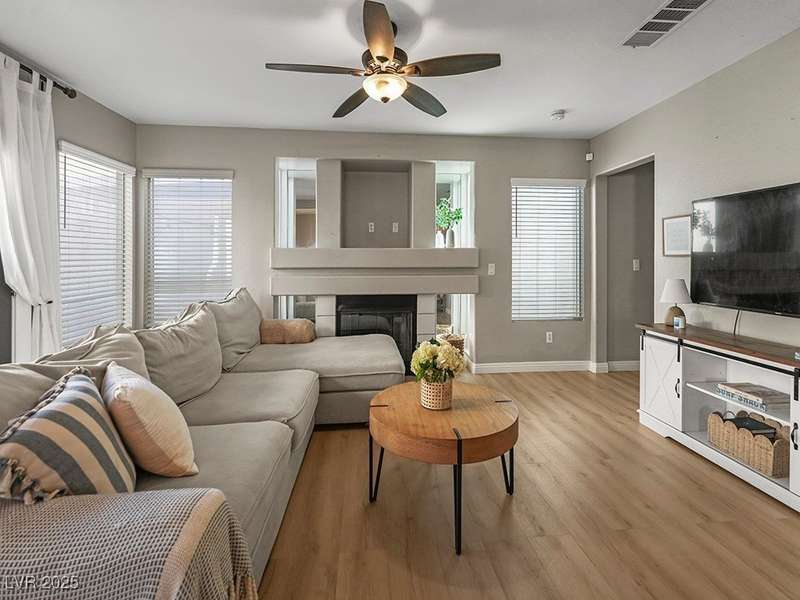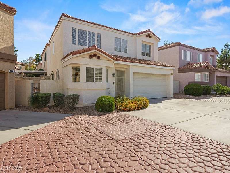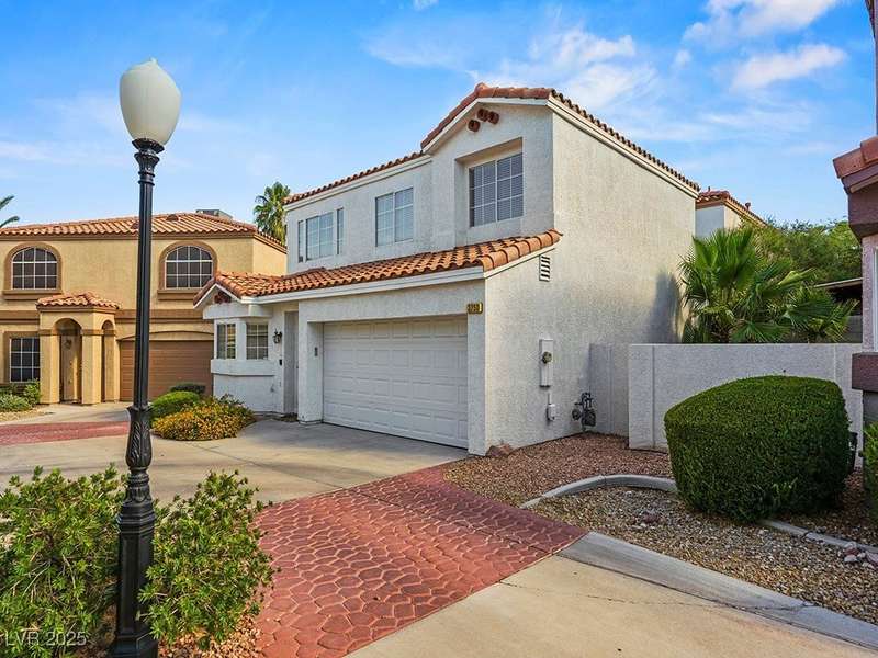 Welcome to this beautifully updated home in American West Village, nestled in a quiet cul-de-sac within a gated, well-maintained community. Enjoy access to 2 community pools, BBQ areas, walking paths, mature landscaping, and RV parking with a virtual gate attendant. Inside, the home features a smart layout with the kitchen just off the entry, butcher block countertops, upgraded lighting, newer fridge and water heater, French doors to the backyard, and a cozy gas fireplace in the living area. 3 bedrooms and 2 bathrooms are upstairs, with great flow for comfortable living. Just minutes from Downtown Summerlin, Target, Costco, Sprouts, Hobby Lobby, and top golf courses, plus easy access to both 215 & 95 freeways. HOA even includes water! VA assumable loan with a low 2.5% interest rate available—don’t miss this incredible opportunity!