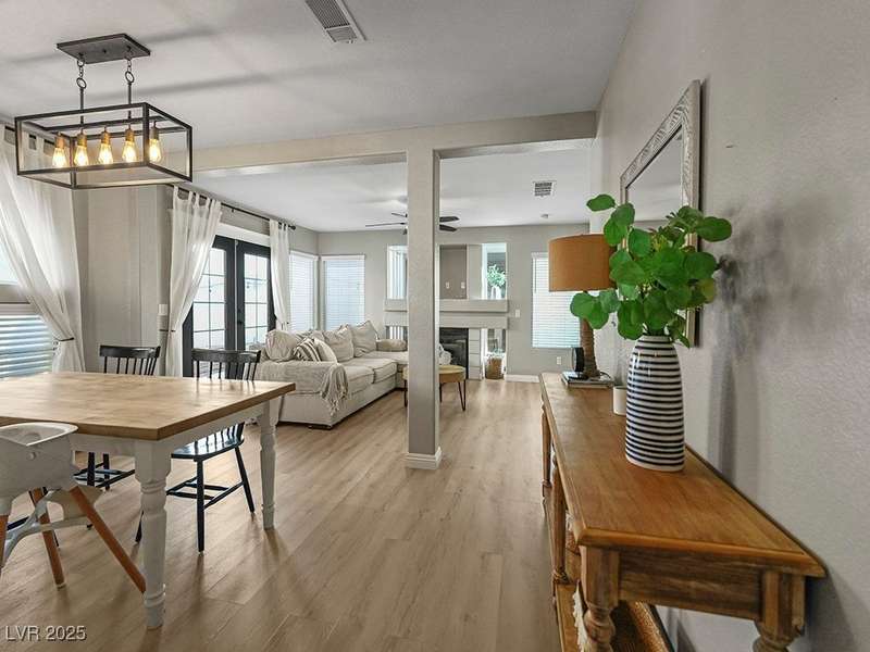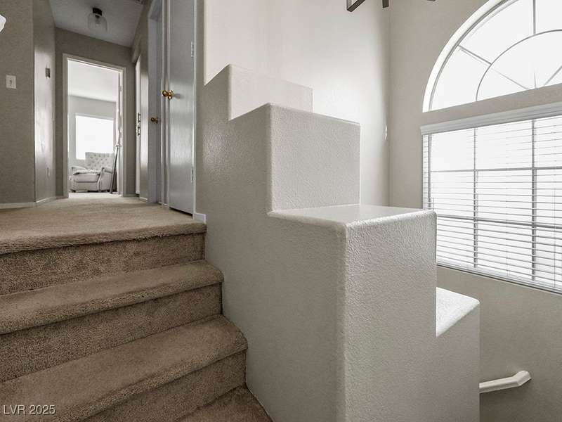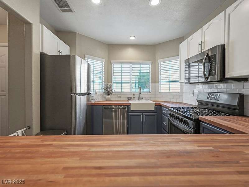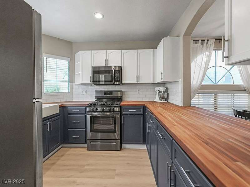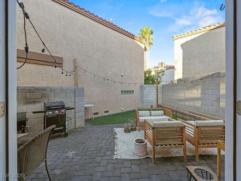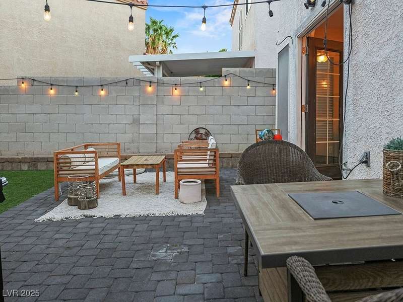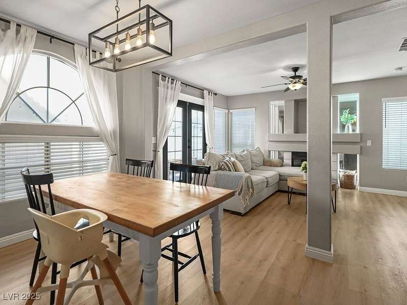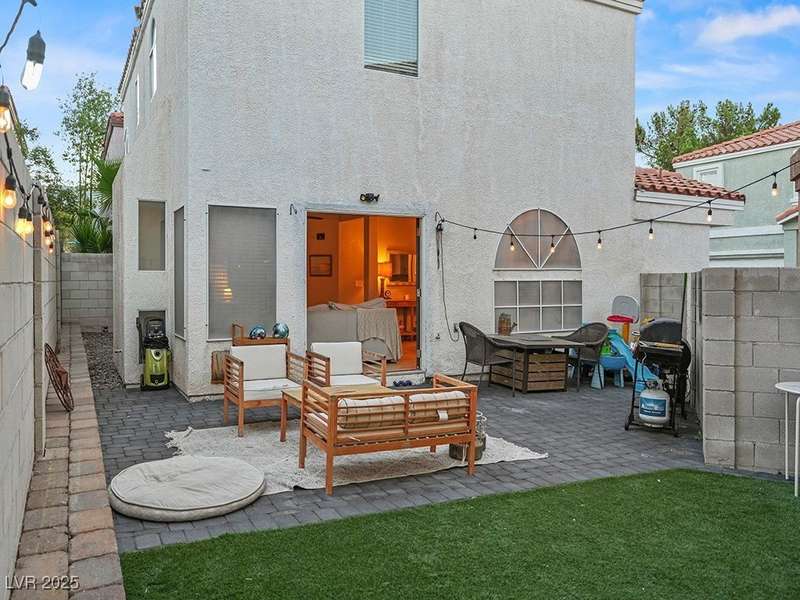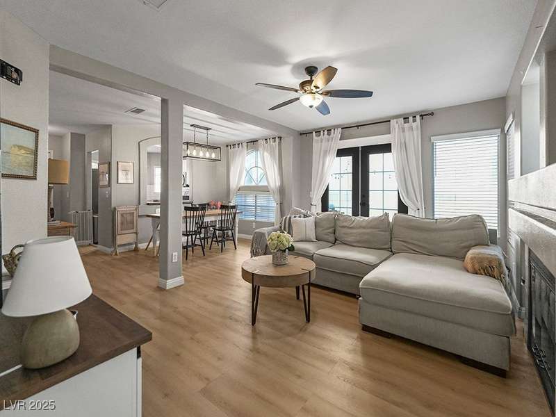 Welcome to this beautifully updated home in American West Village, nestled in a quiet cul-de-sac within a gated, well-maintained community. Enjoy access to 2 community pools, BBQ areas, walking paths, mature landscaping, and RV parking with a virtual gate attendant. Inside, the home features a smart layout with the kitchen just off the entry, butcher block countertops, upgraded lighting, newer fridge and water heater, French doors to the backyard, and a cozy gas fireplace in the living area. 3 bedrooms and 2 bathrooms are upstairs, with great flow for comfortable living. Just minutes from Downtown Summerlin, Target, Costco, Sprouts, Hobby Lobby, and top golf courses, plus easy access to both 215 & 95 freeways. HOA even includes water! VA assumable loan with a low 2.5% interest rate available—don’t miss this incredible opportunity!