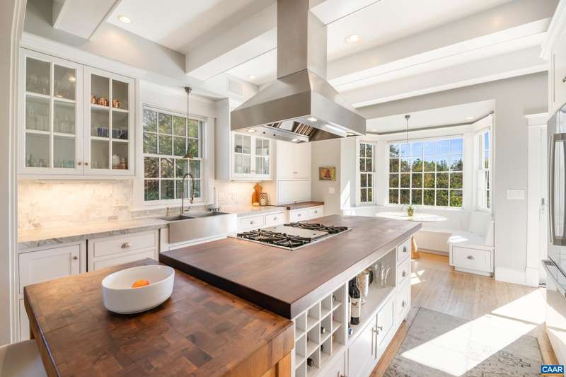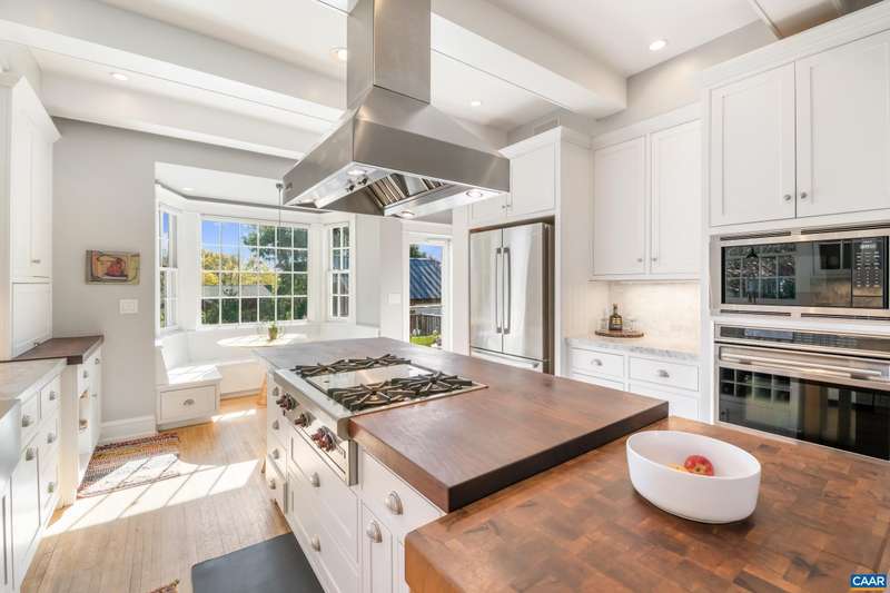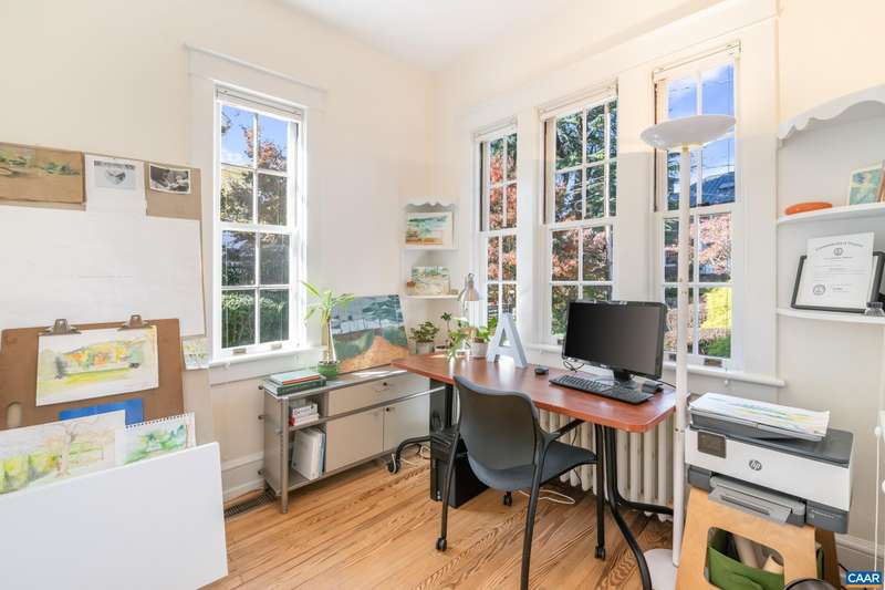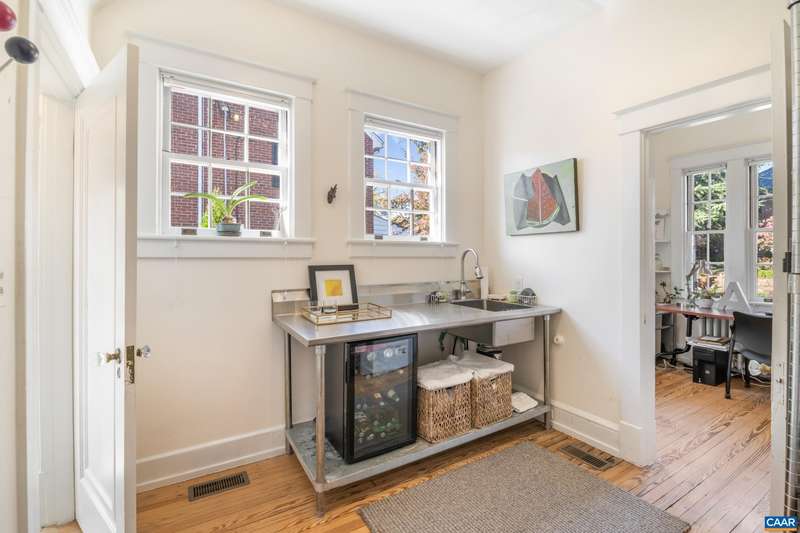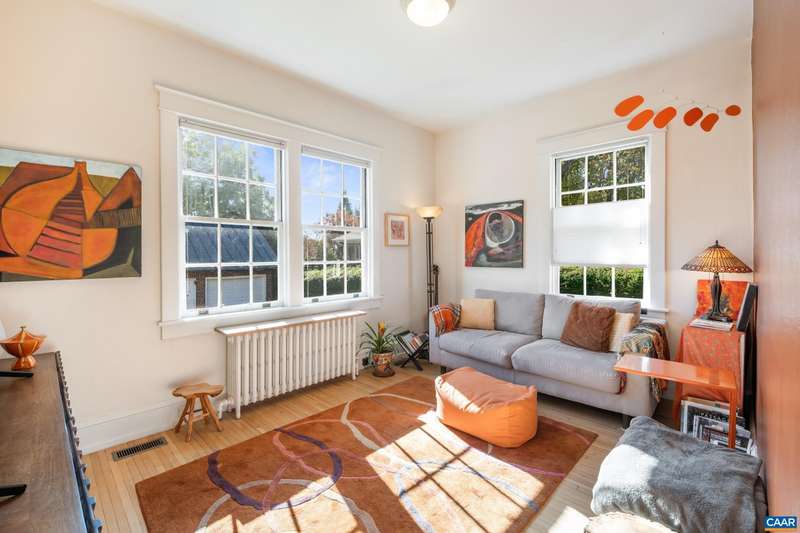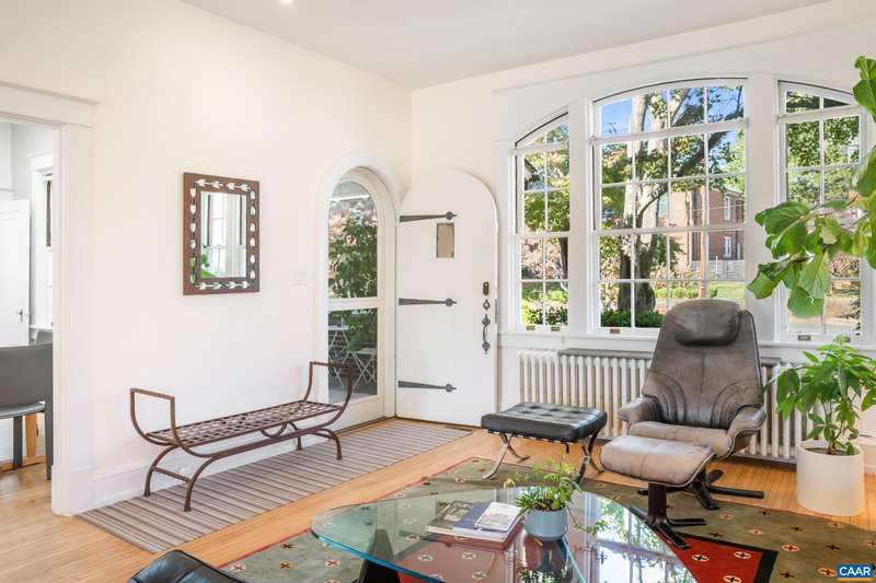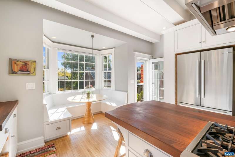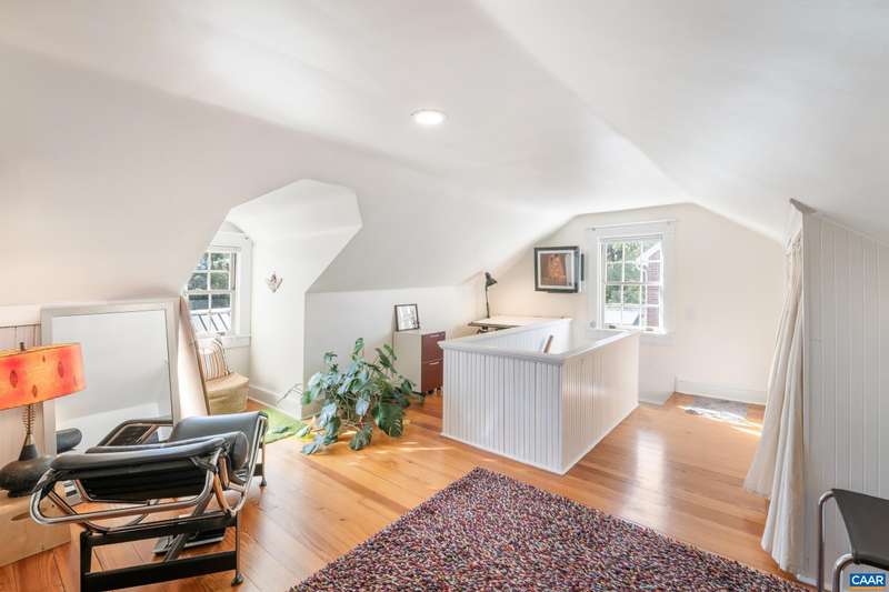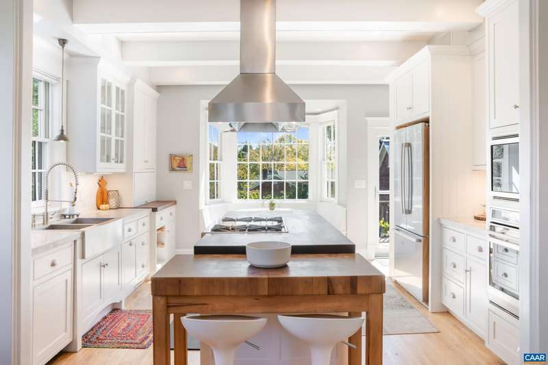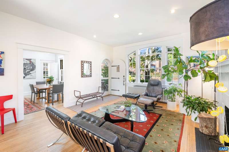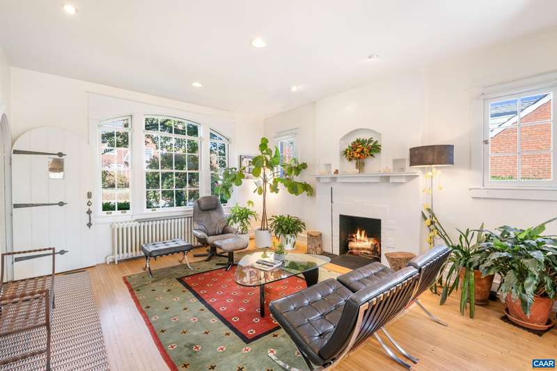 OPEN SUNDAY, 11/2, 1-3! Open your next chapter in this storybook c. 1930 cottage perfectly situated on dogwood-lined Evergreen Ave-one of North Downtown’s most beloved streets, along the 10-Miler route. A rare offering that blends timeless character w/ exquisite updates, this home delights at every turn. The inviting covered front porch and arched entry lead to a JEWEL BOX INTERIOR bathed in light streaming through architectural windows, 9.5' ceilings, handsome built-ins and white oak + southern yellow pine floors. The Karen Turner-designed kitchen is a SHOWSTOPPER, featuring Carrara marble counters, black walnut island, custom cabinetry, Bosch/Wolf appliances, built-in pantry + appliance storage + coffee bar. Sunny breakfast nook overlooks a peaceful backyard with IPE decking + built-in planters. MAIN LEVEL LIVING possible with 1st floor bedrooms and full bath. Upstairs offers a 3rd bedroom, 1/2 bath + flex space. Mountain views to the SE! Recent upgrades-NEW HVAC (2023) + NEW metal roof (2021) Potential for fabulous carriage house/studio in detached 2 car garage w/ electric panel + water/sewer access. An ENTERTAINER'S DREAM and idyllic retreat just steps from the Downtown Mall, boutique shopping, fine dining + farmer's markets.