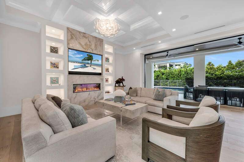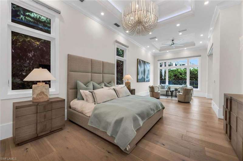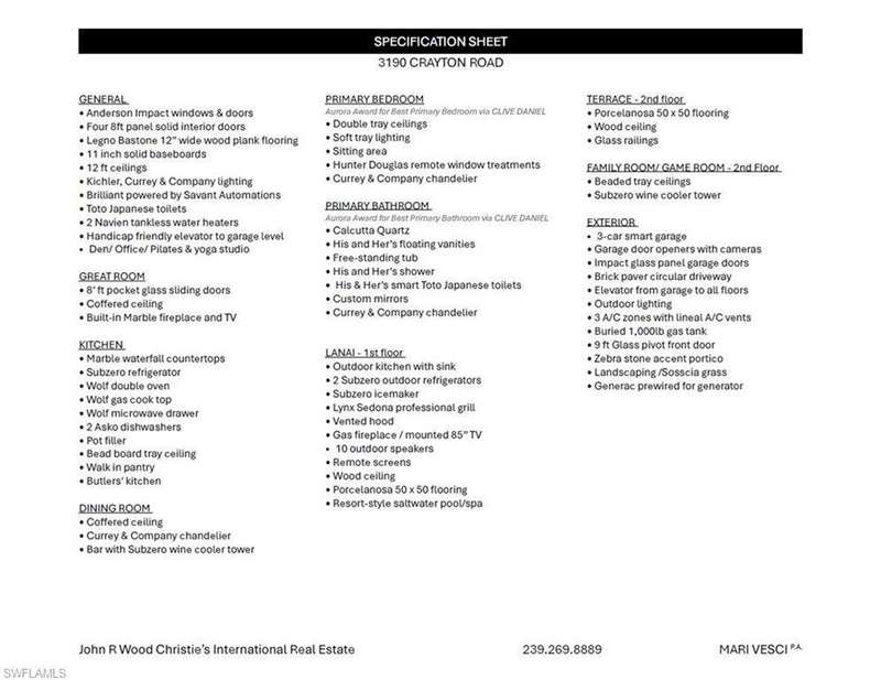 Stunning 2023 custom built home meticulously designed by Clive Daniel and Robb & Stucky interiors, furniture negotiable and features 5 bedroom/en suites, plus a Pilates / yoga studio. The home was designed to be handicap friendly with an elevator that takes you from the garage level up to the main floor and second floor of the home, also Perfect for heavy lifting! The primary bedroom features his and her walk-in California Closets, a large walk in shower, a free standing tub, electric blackout hunter Douglas shades and 2 private Japanese smart toilet rooms. Entire home offers an array of technology throughout and is powered by Savant Automations' new *brilliant smart home system* with video audio and sound controlled from every area of the house linked to your smart phone. As you walk through this well thought out floor plan, you will find an expansive family room with floor to ceiling Anderson pocket sliding glass doors that allows plenty of natural light with wide plank legno bastone flooring throughout. The family room will lead you into the oversized Chef's Kitchen with Sub-Zero Wolf and Asko Appliances with a full butler's pantry. On the second level offers guest en suites, along with a large bonus room/loft that can be used as a home theatre set up or game room. Relax by your Resort Style salt water pool/spa surrounded by Brazilian trees while enjoying the Florida weather that also features a 900 sq foot lanai area with electric roll down screens and shutters, a fireplace, mounted 85 inch TV with 10 outdoor speakers perfect for entertaining. A built-in summer kitchen with outdoor subzero refrigeration and ice maker. This Moorings masterpiece has it all and touched by all. Within minutes to Historic Downtown Naples, white sugar Sand Gulf Beaches, and all that Naples has to offer! Just 1.5 miles to four seasons and waterside shops. Truly a rare find! 12 Foot Elevation.