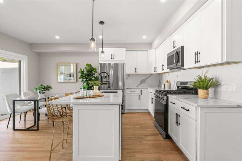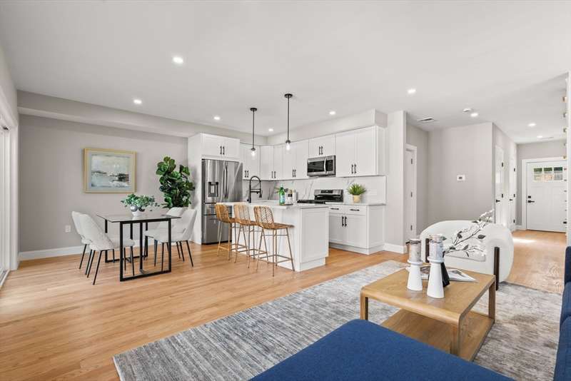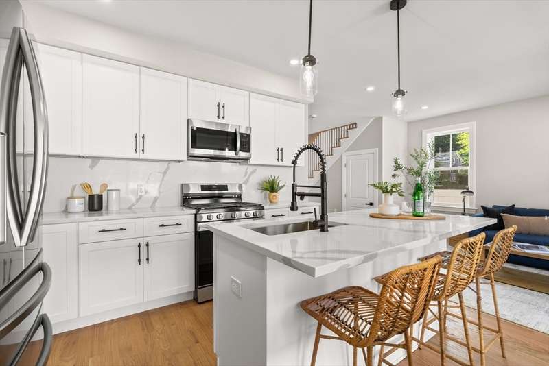 Located in the heart of Weymouth Landing s exciting redevelopment, 9 Vine Street presents a rare opportunity to own one of four brand-new townhomes designed for modern living. Each unit spans three thoughtfully planned levels and includes a private one-car garage and rear patio perfect for relaxing or entertaining outdoors. The main level boasts an open-concept layout anchored by a stylish kitchen with white cabinetry, gray-veined quartz countertops, and a center island ideal for gatherings. Upstairs, the spacious primary suite features a tiled en suite bath and generous closet space, complemented by two additional bedrooms, a full guest bath, and a dedicated laundry room. The top floor offers a large, flexible bonus room with wall-to-wall carpeting ideal as a family room, playroom, or home theater. Experience comfort, style, and convenience in one of Weymouth s most vibrant and evolving neighborhoods.