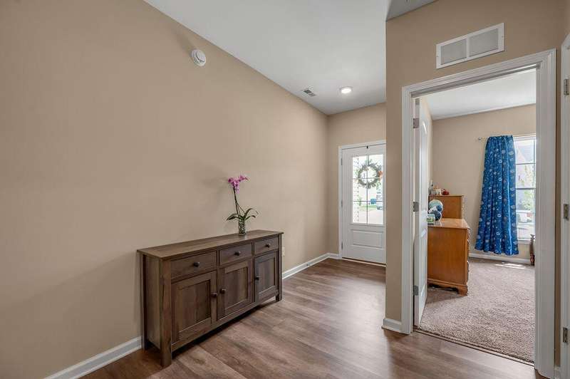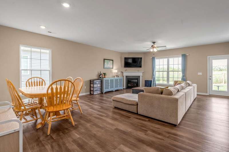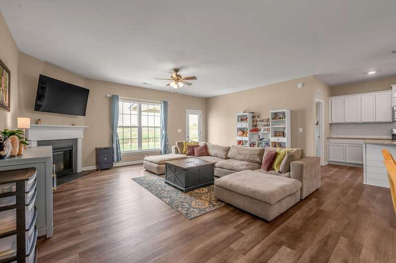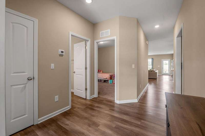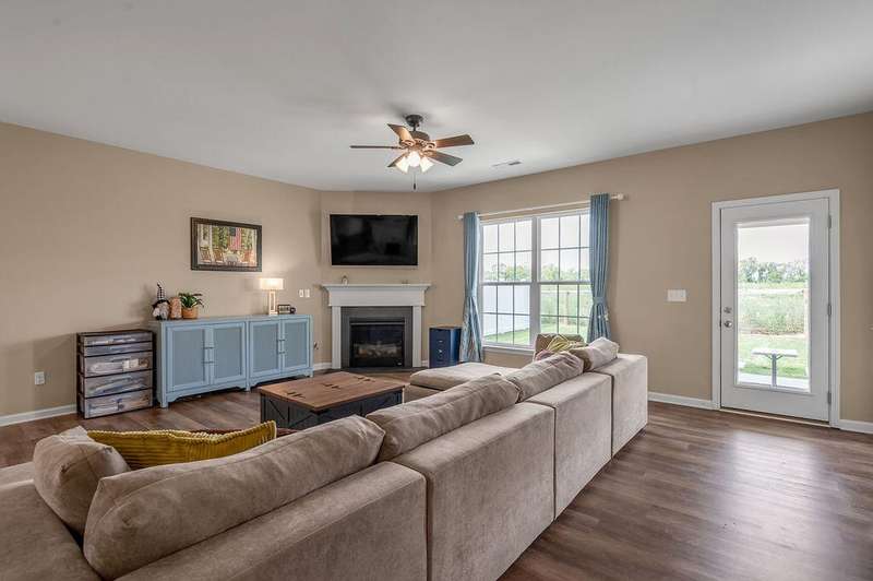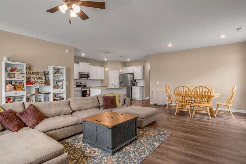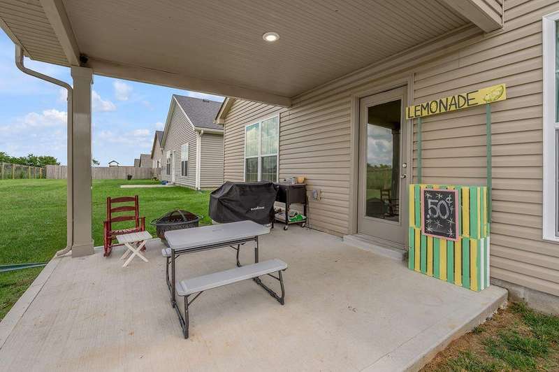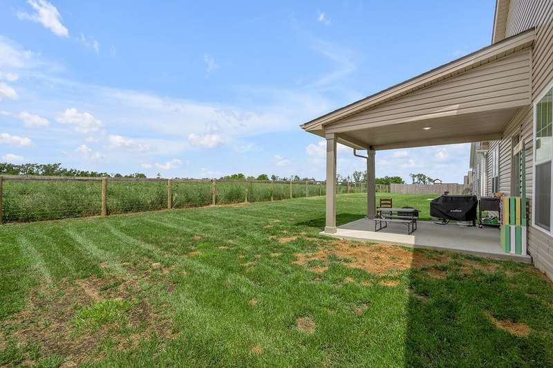 Priced below recent appraisal this almost new 3 bed 2 bath open layout ranch. This split bedroom design places two bedrooms and the hall bath off the entry and the primary bedroom suite at the rear of the home. The central kitchen offers both a breakfast area and countertop dining at the island, and opens to the family room. Granite kitchen counter tops with stainless steel 50/50 under-mount sink and full back splash. The primary bedroom suite includes a bedroom with large closet and spacious bath with tub/shower, window, and linen storage. Raised vanities in baths. The entry from the garage is a mudroom that adjoins the utility room on one side and the living areas of the home on the other. Enjoy the view while sitting on the 12'x10' covered patio.