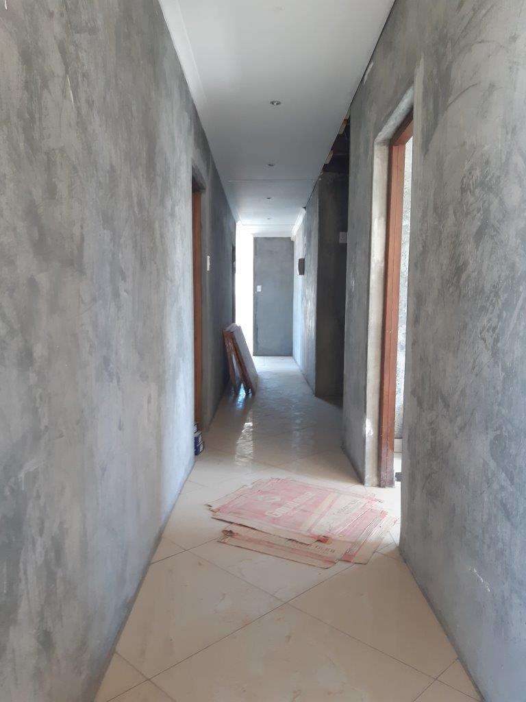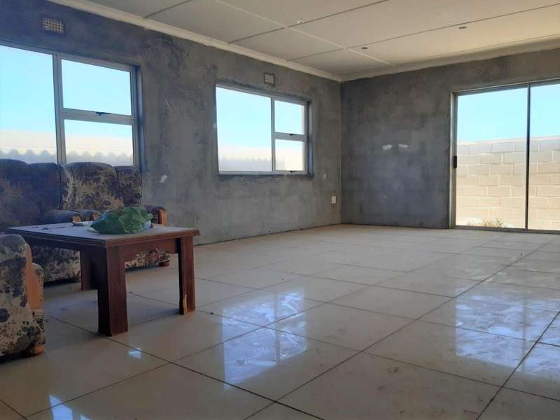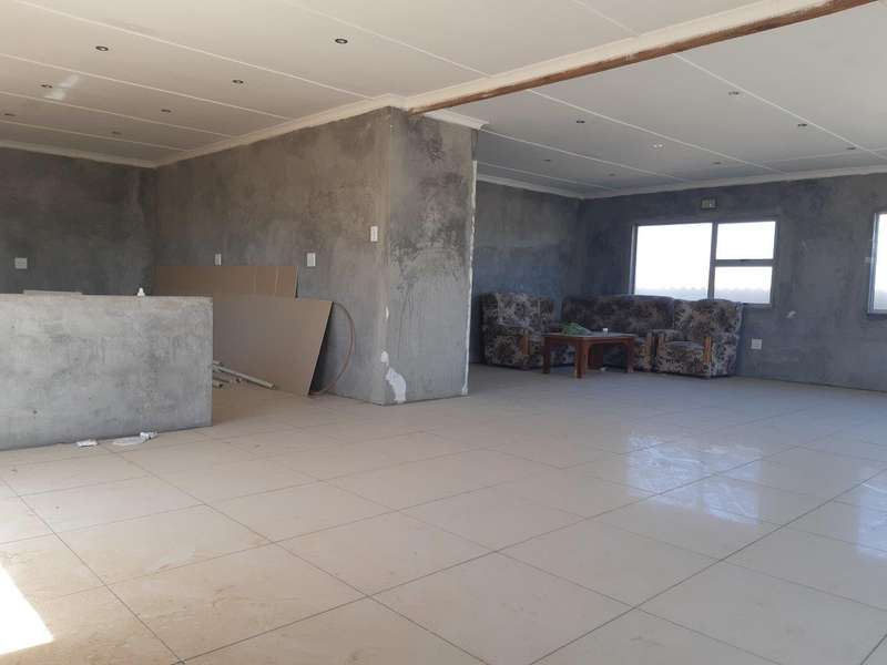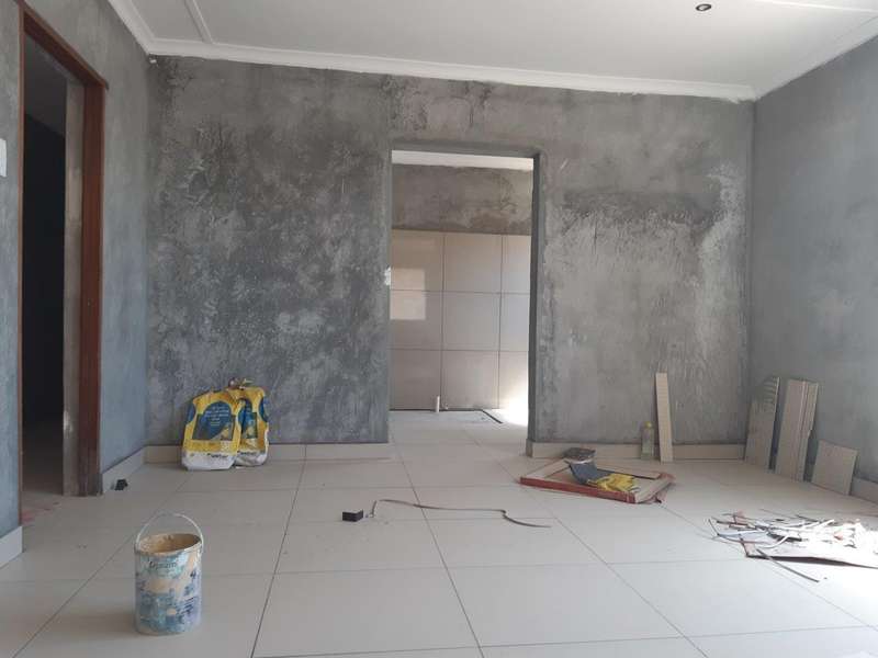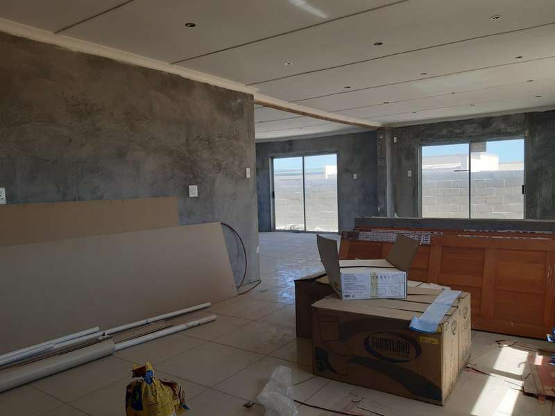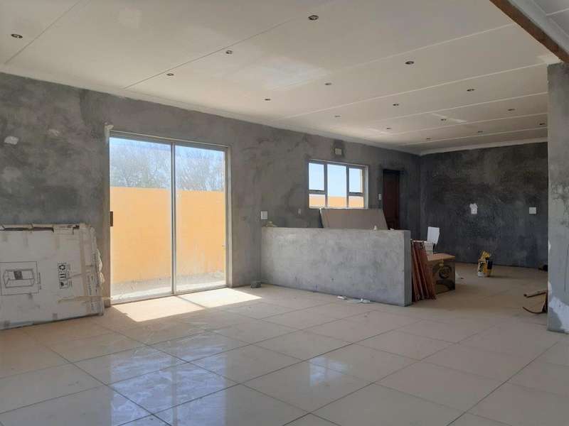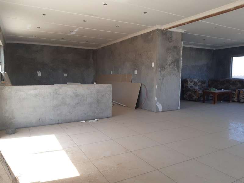 Design for comfort and space. Absolutely perfectly planned 3-bedroom 2-bathroom house. Every bathroom has excess to on suite bathroom. Spacious open plan dining, lounge, and kitchen area. Beautiful big ceramic floor tiles throughout whole house. Bathrooms, cupboards, and wardrobes still to be installed as well as painting as well as some tiles to be placed. Buyer will take over all the necessary building materials stored on site except for the built-in cupboards and kitchen cupboards. Double garages and outdoor room. Fully fenced with outdoor BBQ area