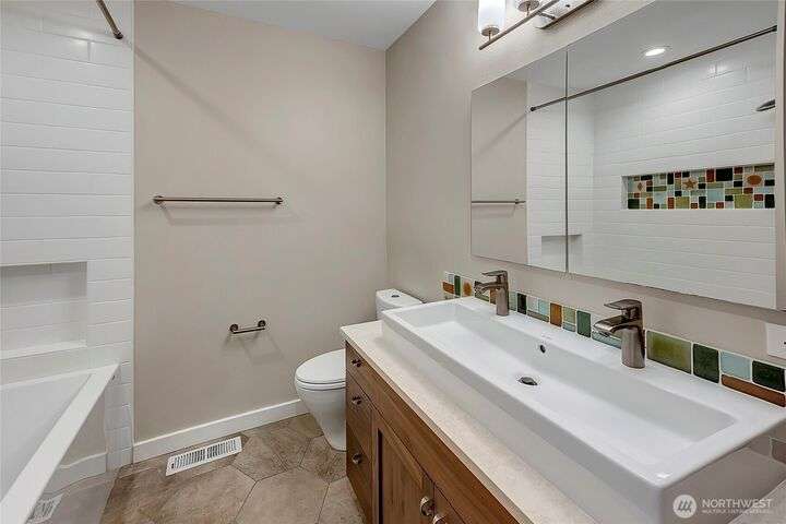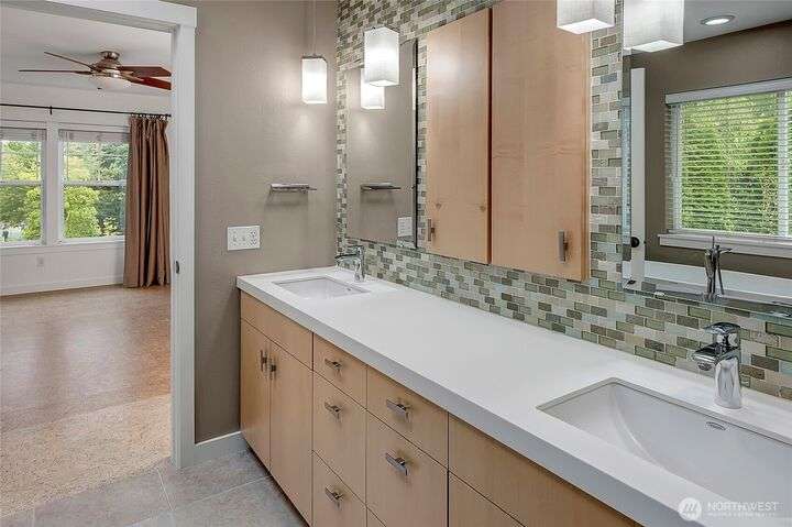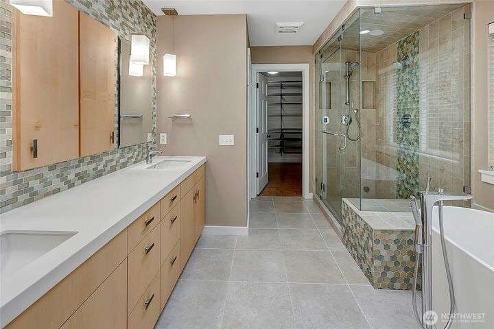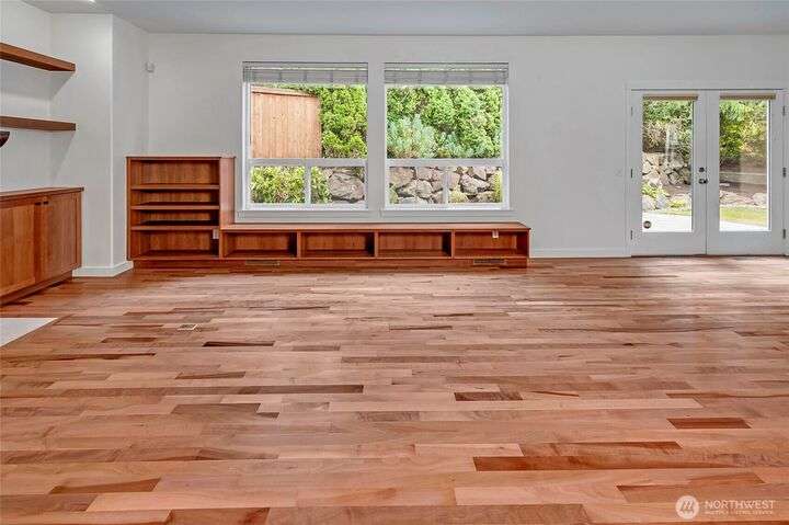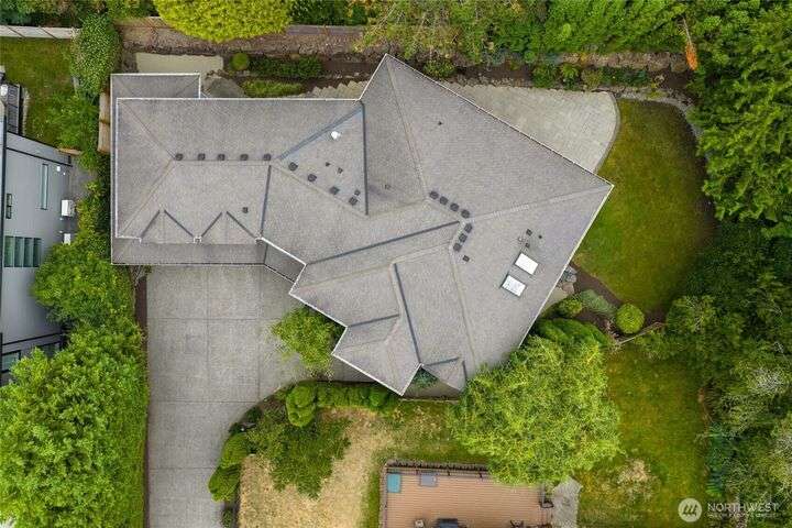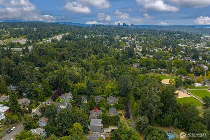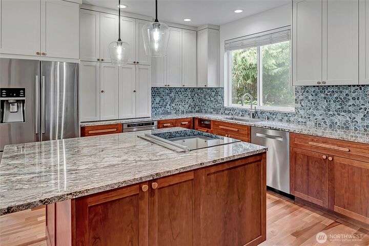 Beautiful remodel in the heart of Kirkland: Everest Park luxury home in quiet setting of tall trees offers a new kitchen & guest suite, fresh paint, and energy-efficiency for modern lifestyles. Hardwood floors & tall ceilings on main, with living room that opens to back patio & yard, gourmet kitchen with slab granite, quality appliances, large island. Formal dining room. Den/office. Upper level offers bamboo-cork floors, primary with luxury bath & walk-in closet, huge bonus, guest room en suite, 3 addl. beds + bath. Heat pump for heating/cooling, new plumbing & insulation, tankless hot water, and EV-ready. 3-car garage, easy-care landscaping. Downtown, Google, Cross Kirkland Corridor, sought after schools, and easy access to 520 & 405.