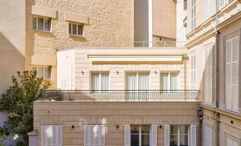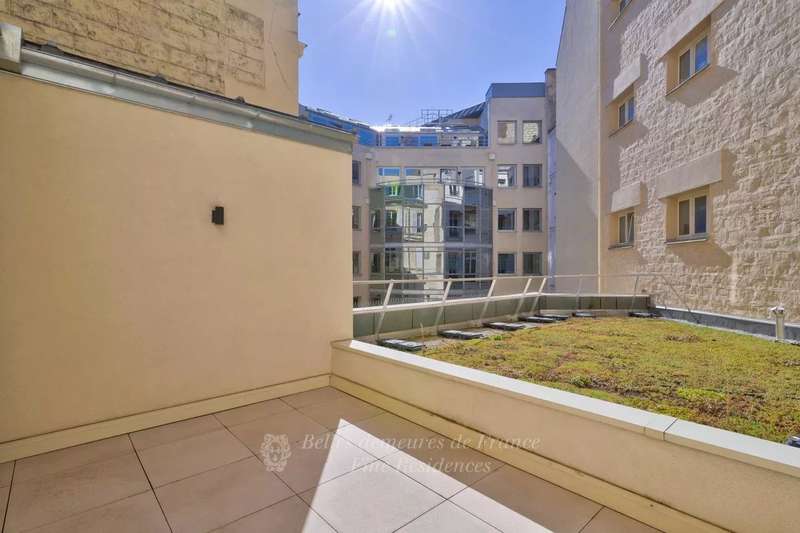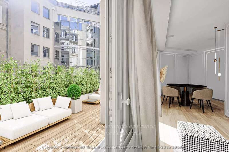 Boulevard Haussmann, near Faubourg Saint-Honoré. This duplex apartment benefiting from fully south-facing terraces is on the top floors (2nd and 3rd) of an elegant revamped late 19th century building. Overlooking the pretty paved courtyard of a Haussmannian building mainly comprising offices, it includes a living/reception room opening onto a 27 sqm terrace, an equipped kitchen, a master bedroom with a bathroom, wc and dressing room, a guest wc and a utility room. A second bedroom with a shower room and wc is on the upper floor. The apartment dates from 2022 when the building was revamped with the addition of a third floor.