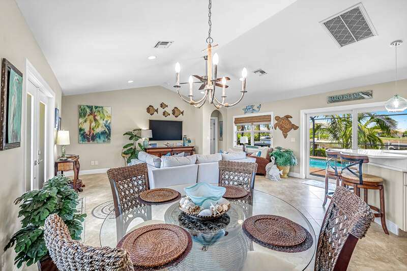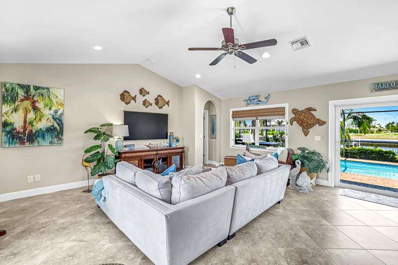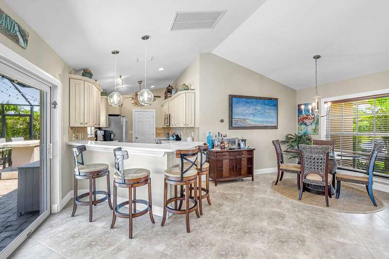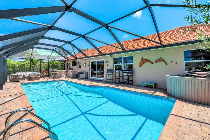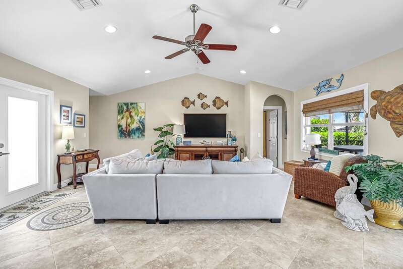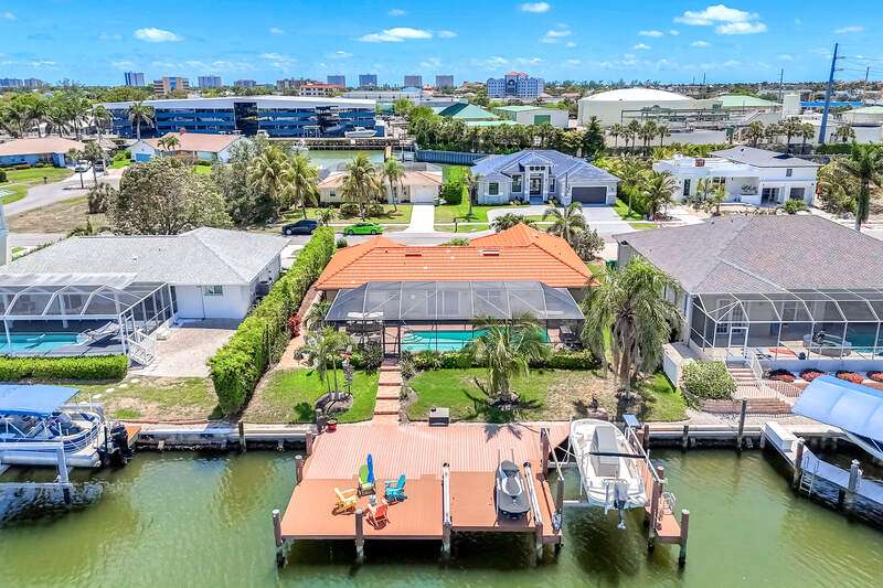 Embrace the ultimate in waterfront living with this beautifully maintained 3-bedroom, 2-bath coastal retreat. Situated on a scenic canal with wide and converging water views, this home offers indirect access to the Gulf, making it perfect for boating enthusiasts who want both tranquility and adventure. The outdoor living space is designed for relaxation and entertaining, featuring a large, screened lanai with brick pavers, a fully equipped outdoor kitchen (grill, refrigerator, and icemaker), a hot tub, and a cozy fire pit. The expansive dock includes a boat lift and a Wave Runner lift, setting the stage for endless days on the water. Inside, the home impresses with vaulted ceilings and a bright, open layout. The spacious primary suite features stunning water views, a walk-in closet, and a beautifully appointed en-suite bathroom with a double vanity and walk-in shower. The kitchen includes stainless steel appliances (2014) and blends functionality with style. Additional highlights include impact windows and doors, landscape lighting for evening ambiance and enhanced curb appeal, as well as a new roof installed in 2014. Whether you're looking for a full-time residence, a seasonal escape, or a smart investment, this home delivers coastal living at its finest.