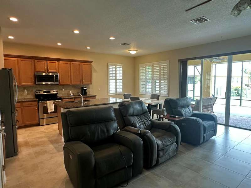 Join Florida's luxury lifestyle in this highly sought after community of Town Park in Tradition. A family oriented development with superior amenities, wide sidewalks, dog parks, tennis courts, kids splash fountains, resort style pool and more. Beautifully designed 3 bed/2/bath home secure with guarded gates. Features tile floors in main areas/GROUT JUSTED cleaned with an open modern kitchen, granite countertops, stainless steel appliances, and an island. The living room's vaulted ceilings provide a spacious feel, the dedicated office/den provides added versatility or 3rd bedroom. Primary suite boasts two walk-in closets, with an oversized tile shower, duel sinks & separate toilet area. laundry room w/new washer/dryer & sink. Exterior of home just painted 6/1725, new fridge-Jan 2025.