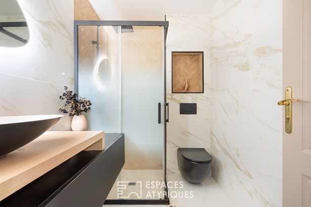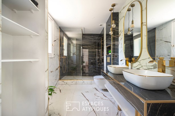 In the centre of the room, a sculptural staircase, seemingly suspended, creates a graphic transition to the upper floor. This level offers two bedrooms with storage space, a shower room with WC, a laundry area, and a sumptuous 40 m2 master suite with a custom-made dressing room and double sink shower room.